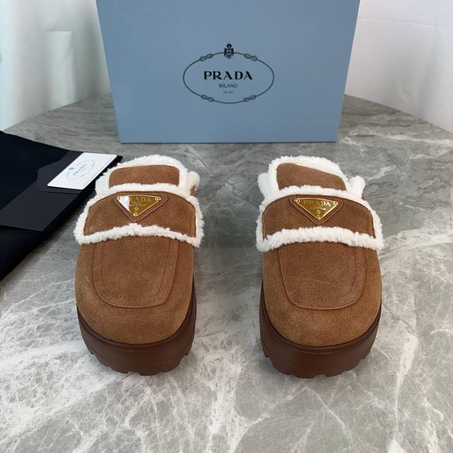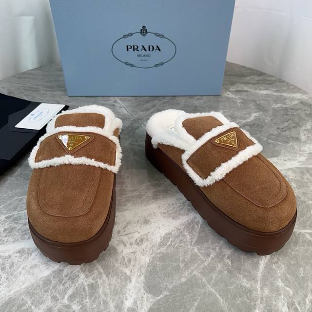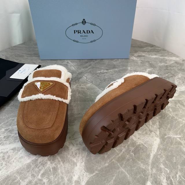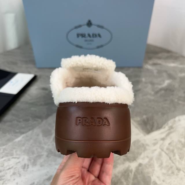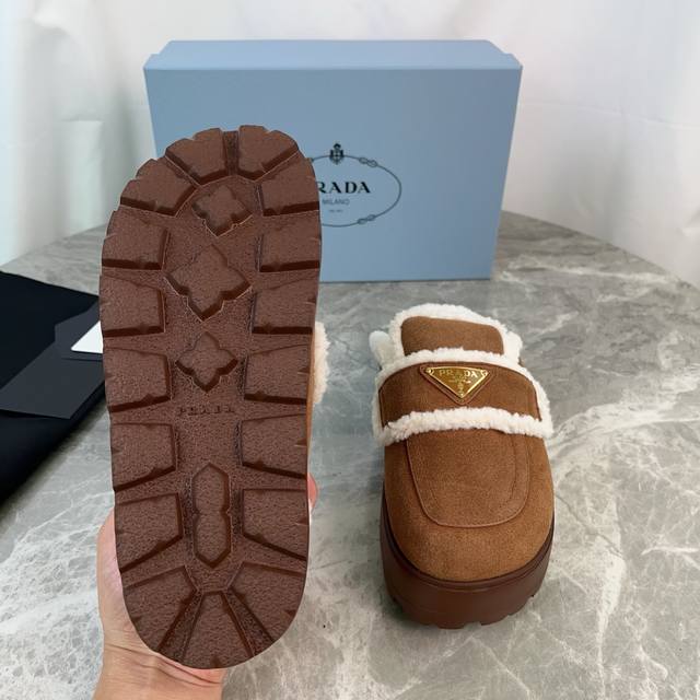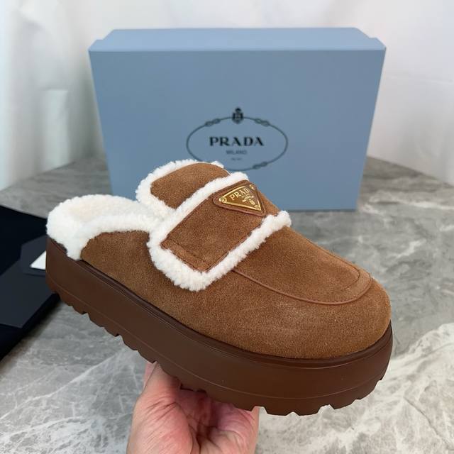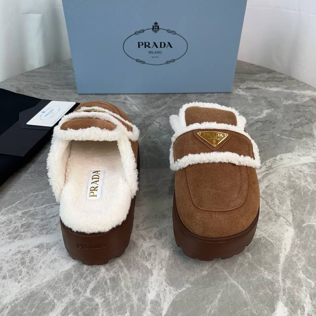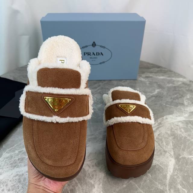 Latest P brand fleece slippers. Outer: Imported high-gloss cow suede. Lining: Imported lamb's wool. Mat: Lambswool. Sole: Ultra-light rubber foam sole, 6cm thick. Features the iconic triangle logo and original packaging. Size: 35-41. Custom sizes 40 and 41 are available.