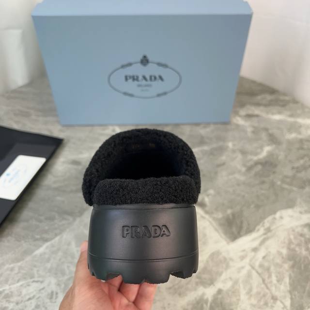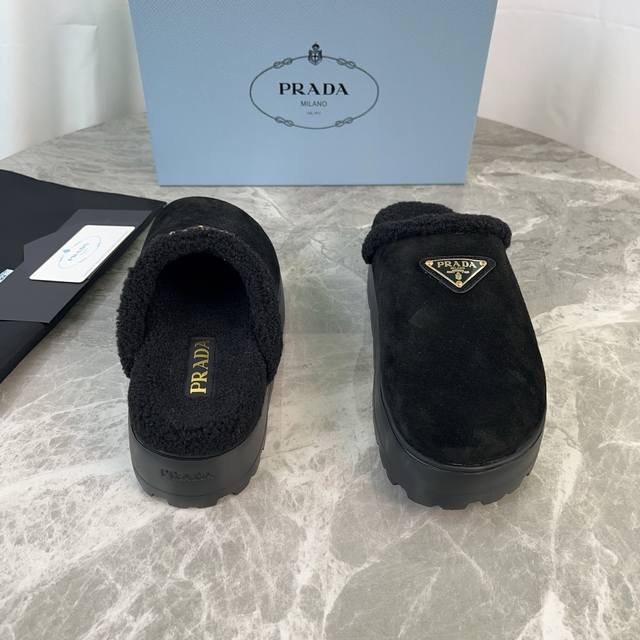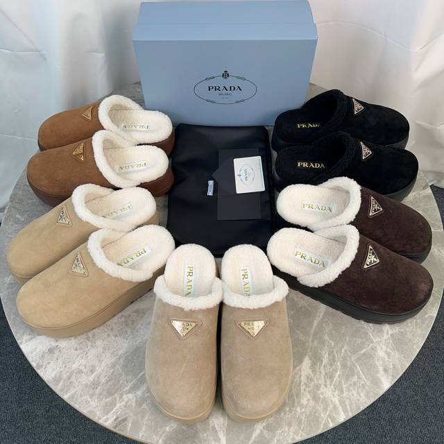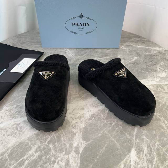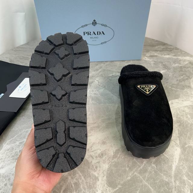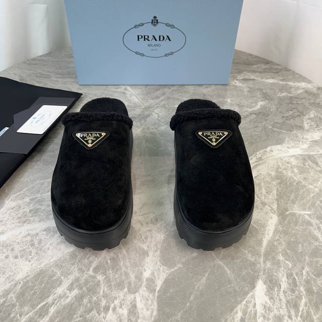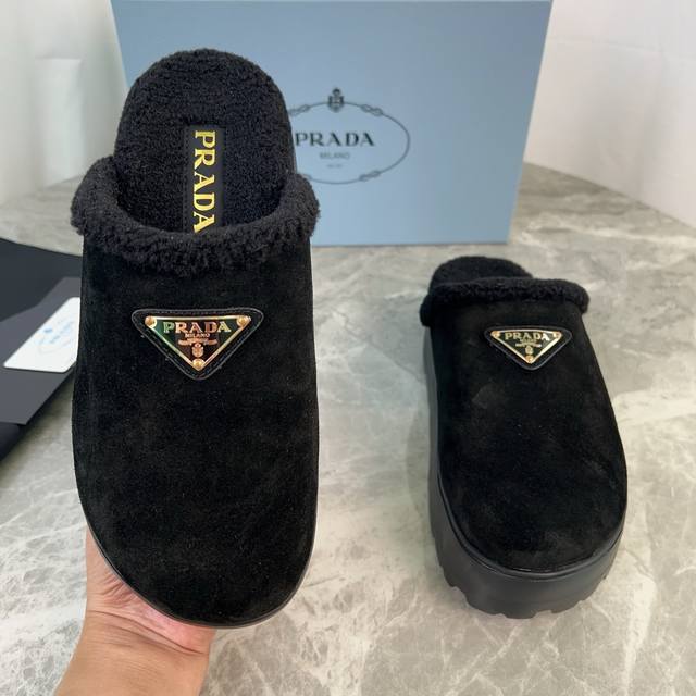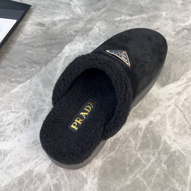 Latest P brand fleece slippers. Outer: Imported high-gloss cow suede. Lining: Imported lamb's wool. Mat: Lambswool. Sole: Ultra-light rubber foam sole, 6cm thick. Features the iconic triangle logo and original packaging. Size: 35-41. Custom sizes 40 and 41 are available.