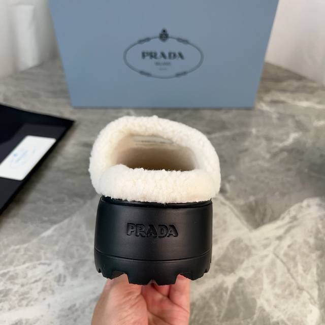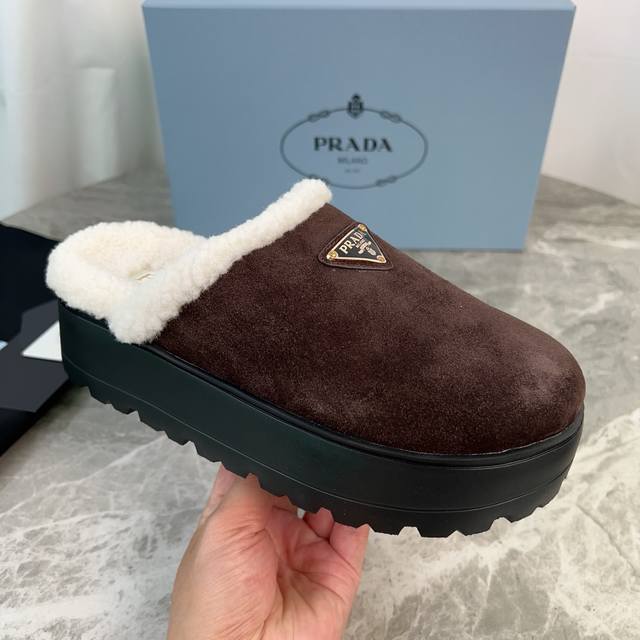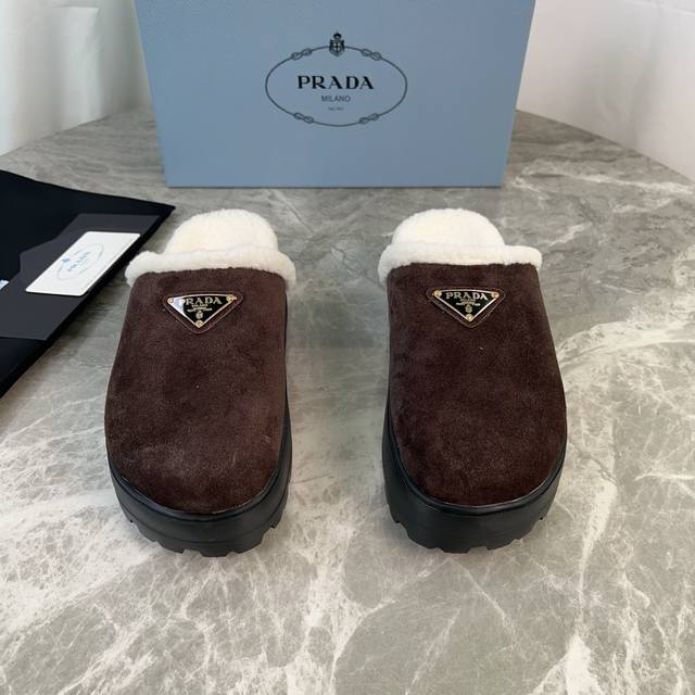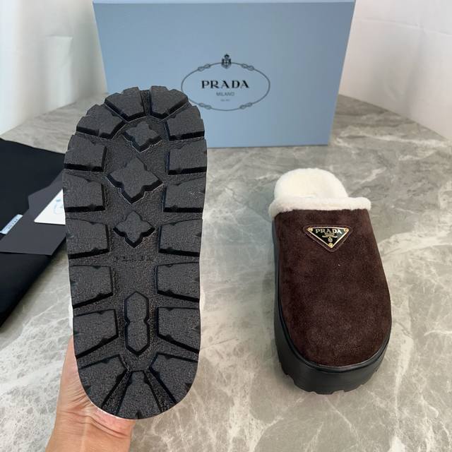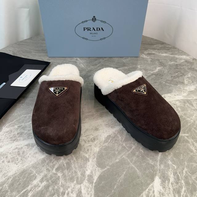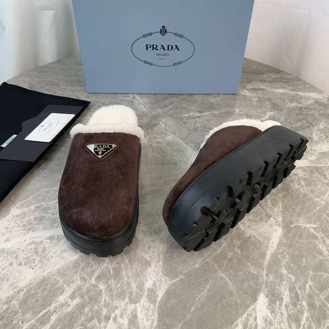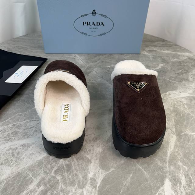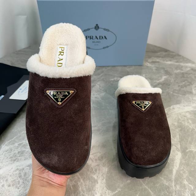 Latest P brand fleece slippers. Outer: Imported high-gloss cow suede. Lining: Imported lamb's wool. Mat: Lambswool. Sole: Ultra-light rubber foam sole, 6cm thick. Features the iconic triangle logo and original packaging. Size: 35-41 ( 40 and 41 are custom sizes available).
