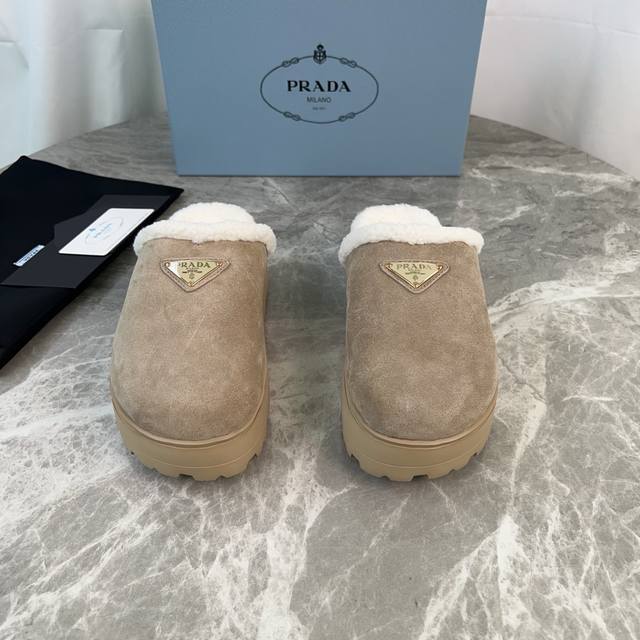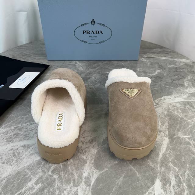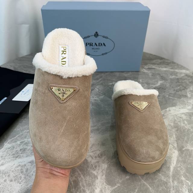 Latest P brand fleece slippers. Outer: Imported high-gloss cow suede. Lining: Imported lamb's wool. Mat: Lambswool. Sole: Ultra-light rubber foam sole, 6cm thick. Features the iconic triangle logo and original packaging. Size: 35-41. Custom sizes 40 and 41 are available.
