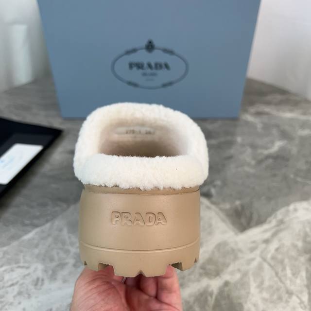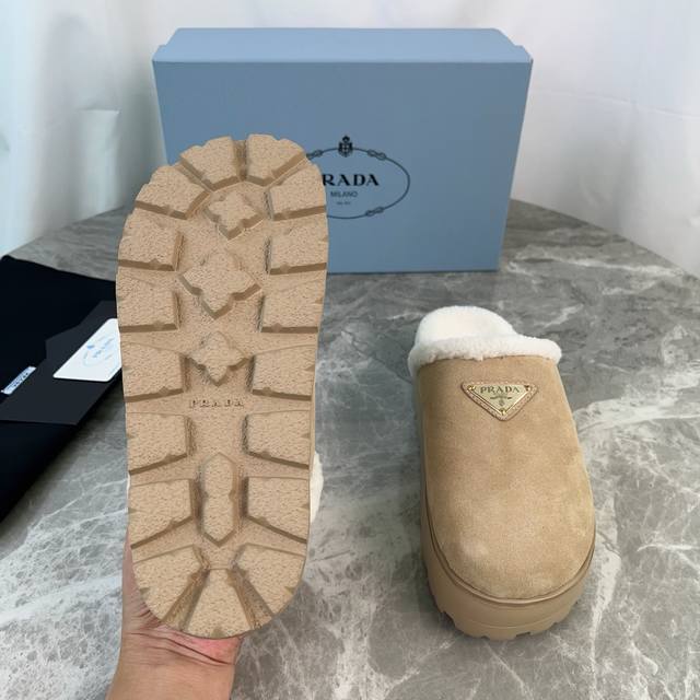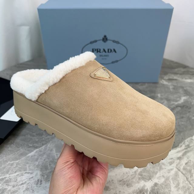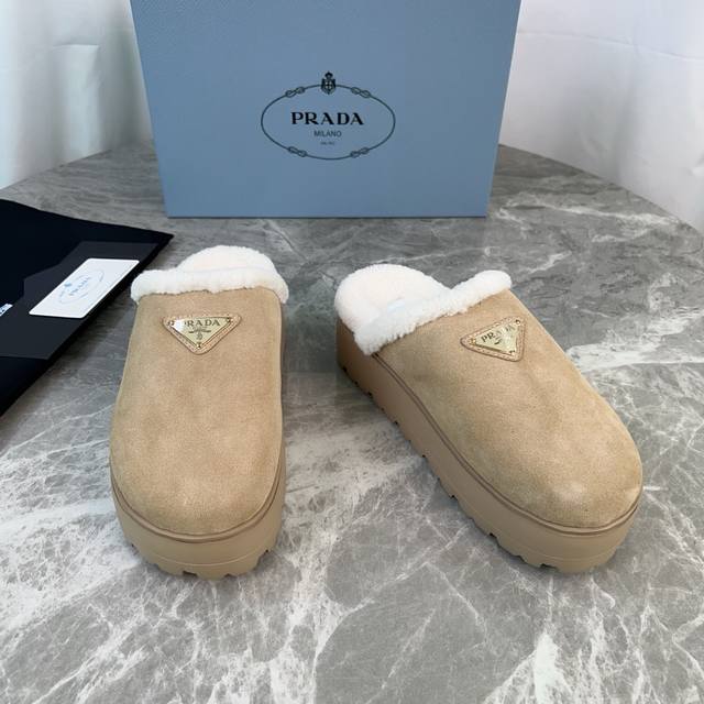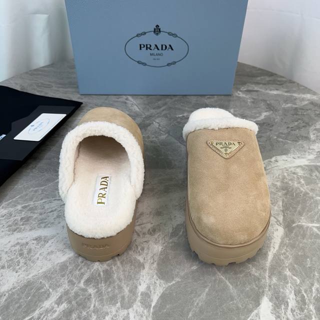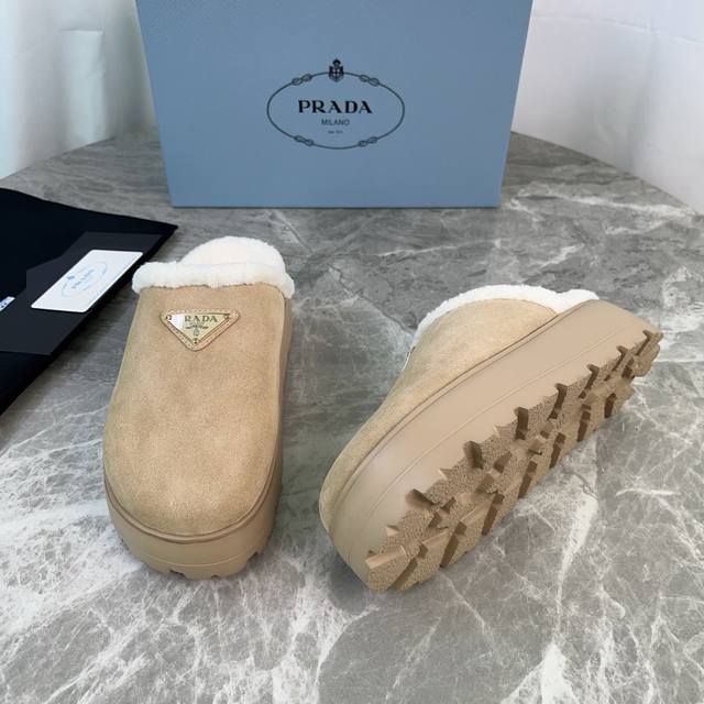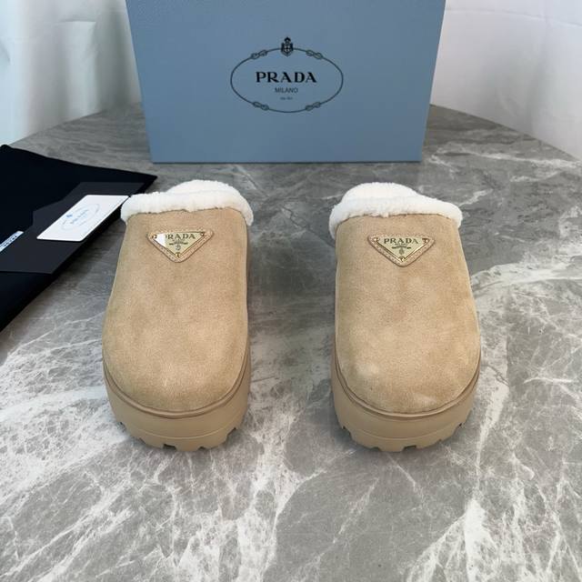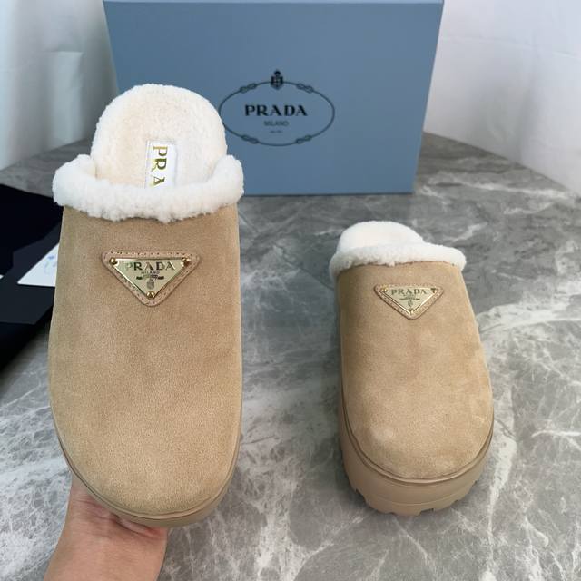 Latest P brand fleece slippers. Outer: Imported high-gloss cow suede. Lining: Imported lamb's wool. Mat: Lambswool. Sole: Ultra-light rubber foam sole, 6cm thick. Features the iconic triangle logo and original packaging. Size: 35-41. Custom sizes 40 and 41 are available.