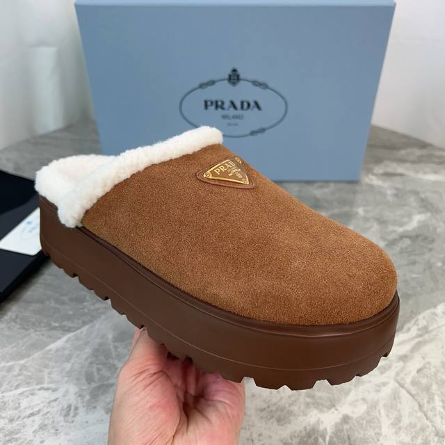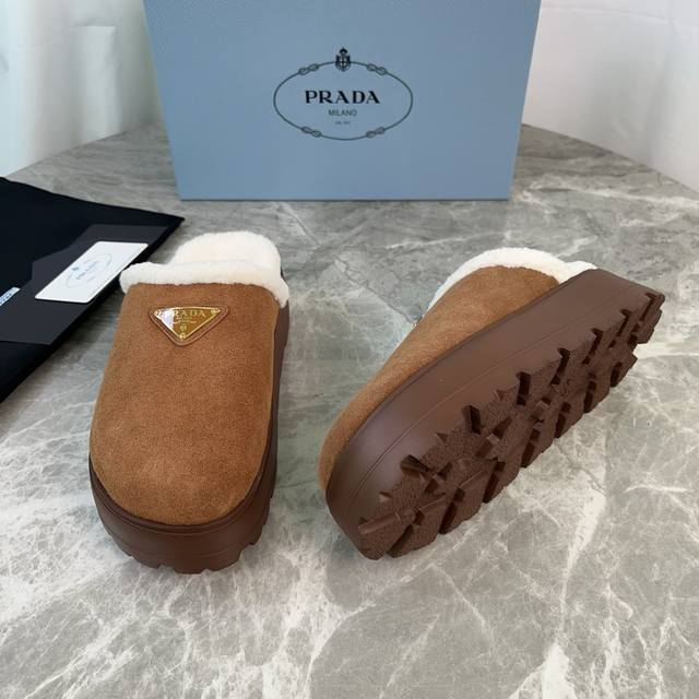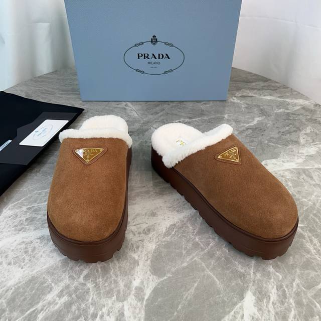 Latest P brand fleece slippers. Outer: Imported high-gloss cow suede. Lining: Imported lamb's wool. Mat: Lambswool. Sole: Ultra-light rubber foam sole, 6cm thick. Features the iconic triangle logo and original packaging. Size: 35-41. Custom sizes 40 and 41 are available.