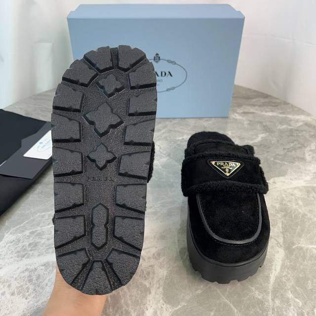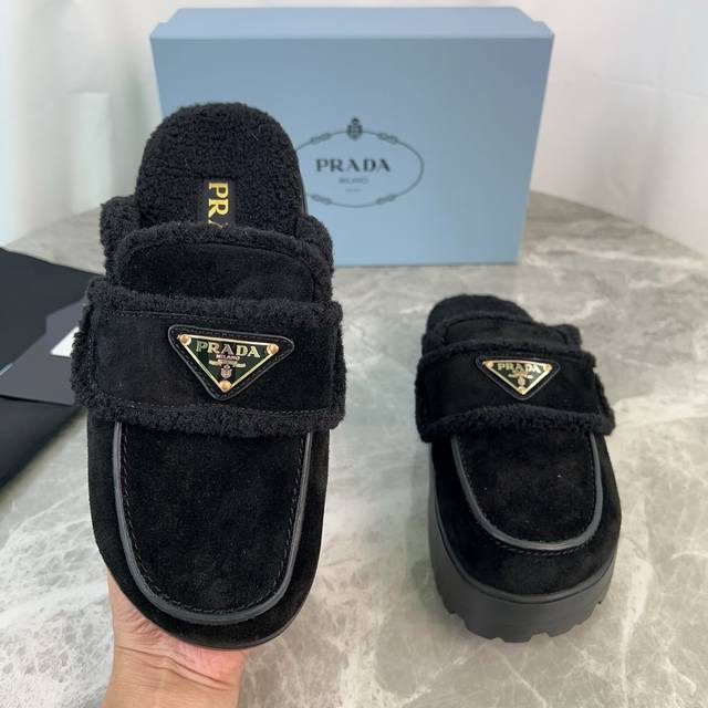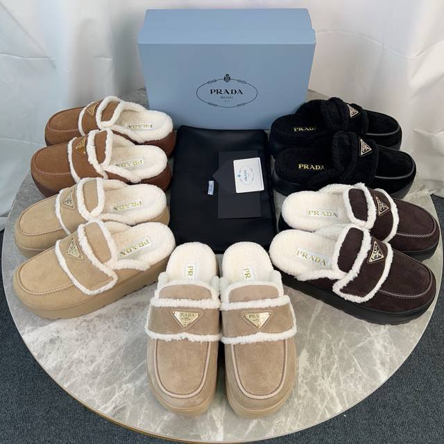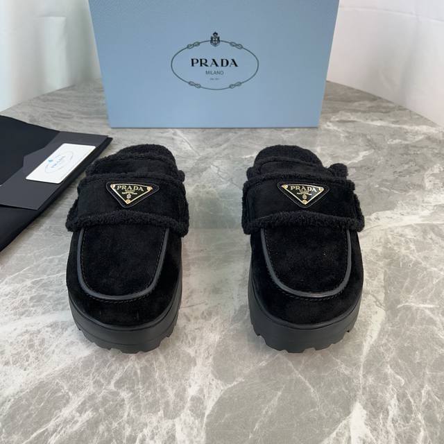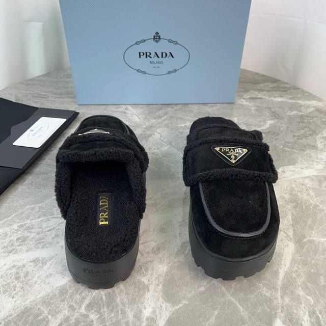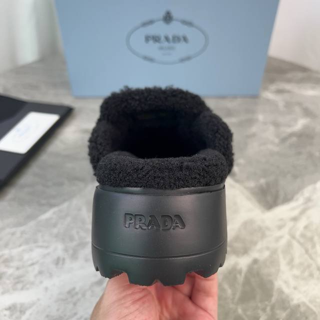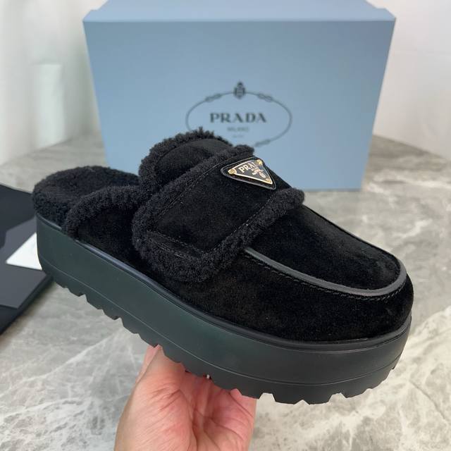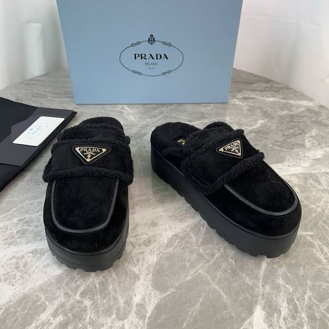 Latest P brand fleece slippers. Outer: Imported high-gloss cow suede. Lining: Imported lamb's wool. Mat: Lambswool. Sole: Ultra-light rubber foam sole, 6cm thick. Features the iconic triangle logo and original packaging. Size: 35-41. Custom sizes 40 and 41 are available.
