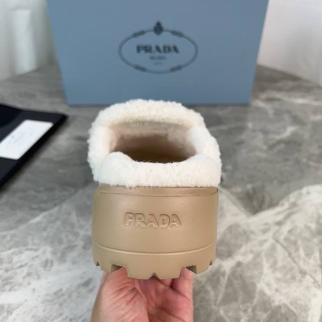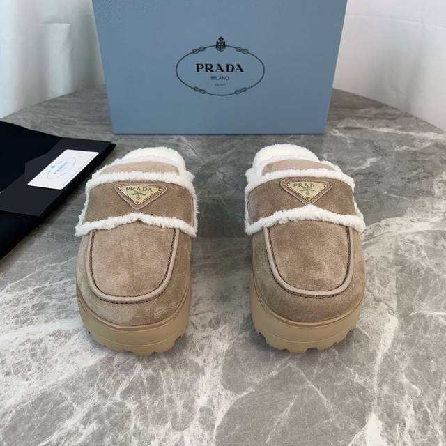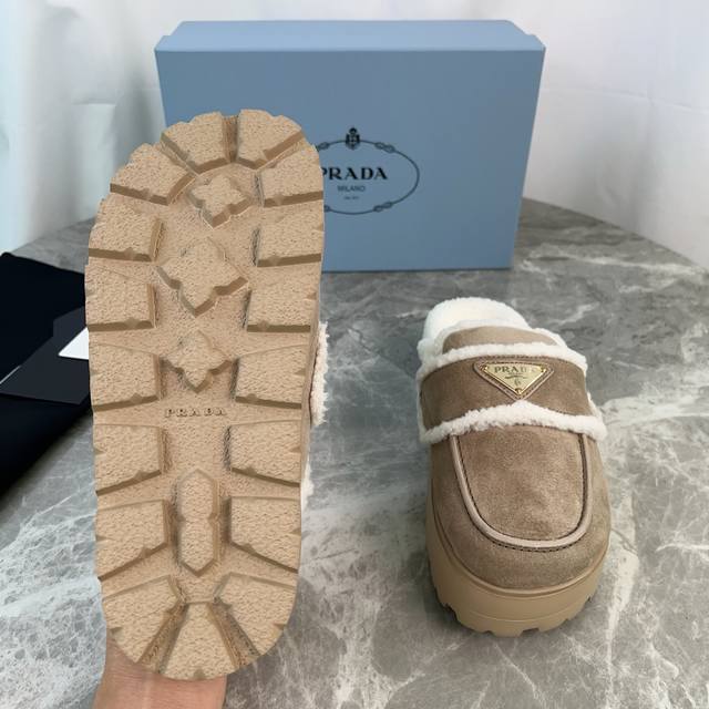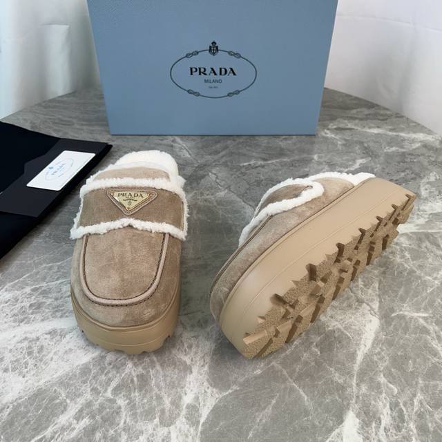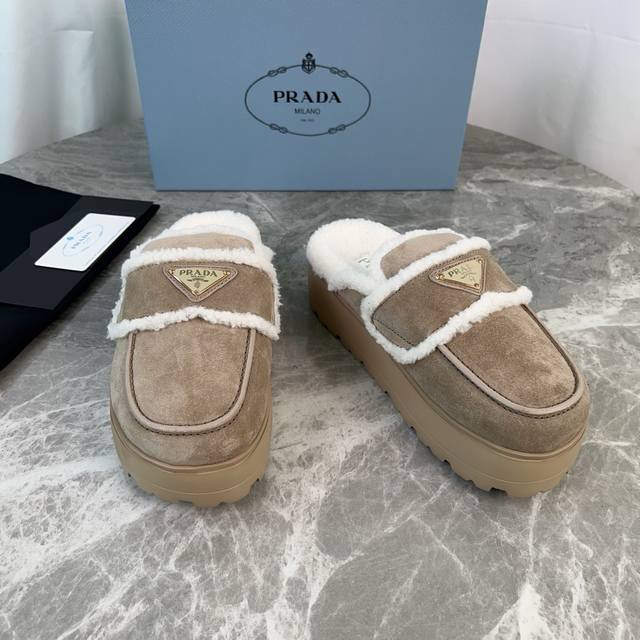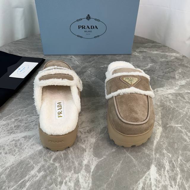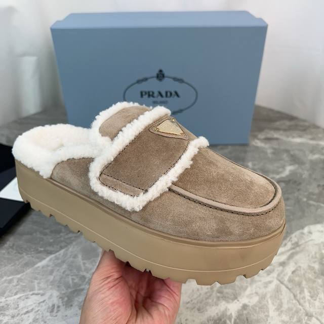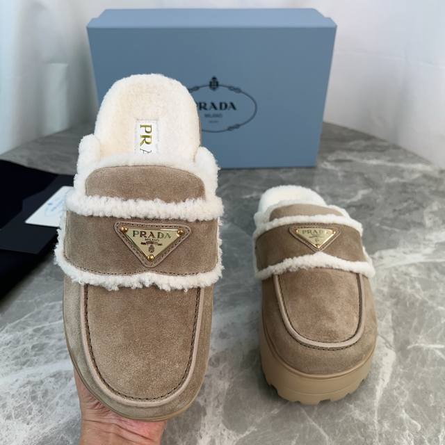 Latest P brand fleece slippers. Outer: Imported high-gloss cow suede. Lining: Imported lamb's wool. Mat: Lambswool. Sole: Ultra-light rubber foam sole, 6cm thick. Features the iconic triangle logo and original packaging. Size: 35-41. Custom sizes 40 and 41 are available.