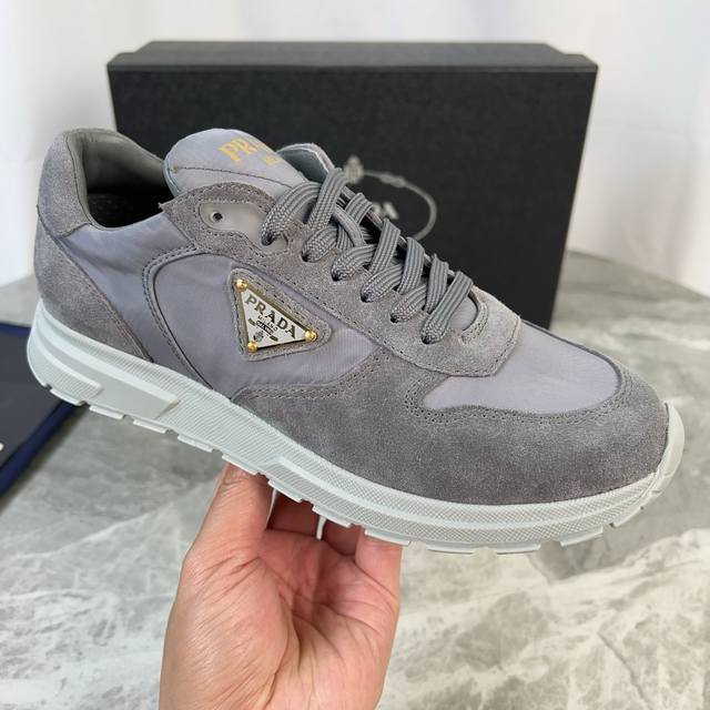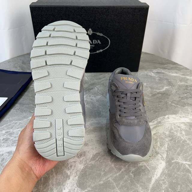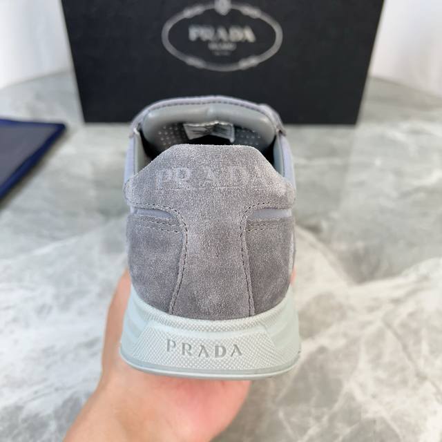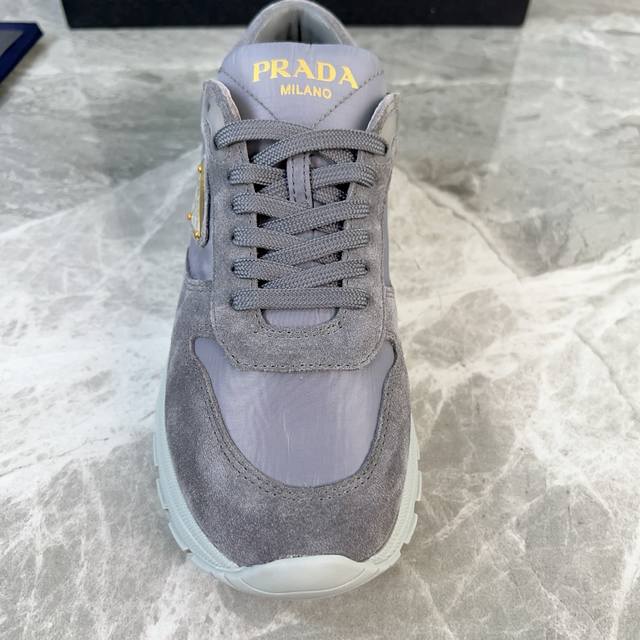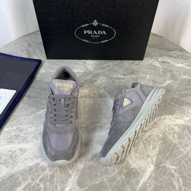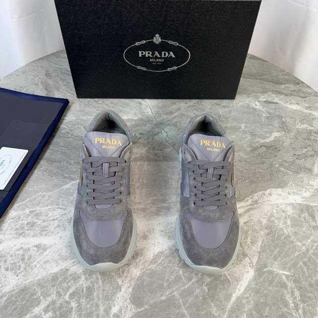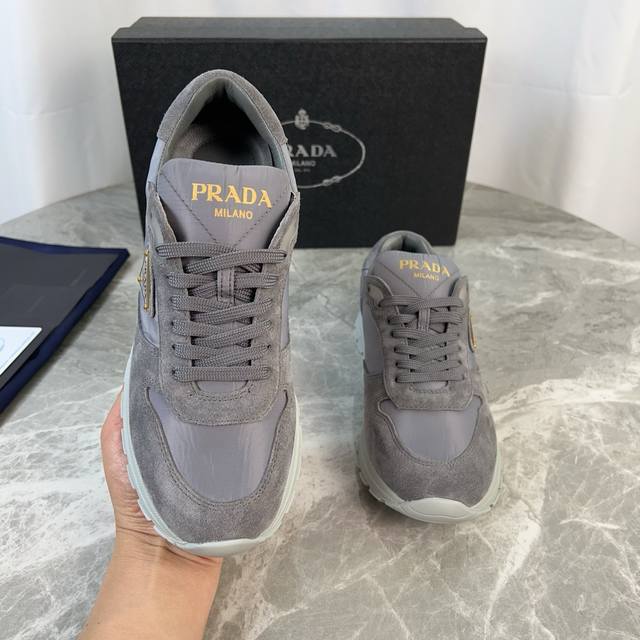 Latest P brand model. Outer: High-gloss cow suede + imported brand fabric. Lining: Super soft mixed sheepskin. Sole: Original TPU outsole. Features the iconic triangle logo and original packaging. Size: 35-41.