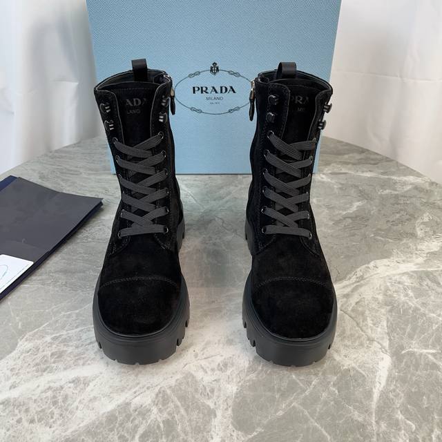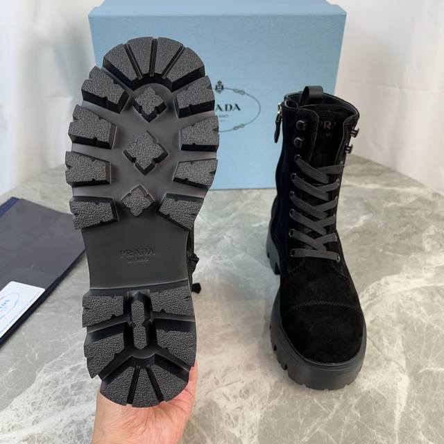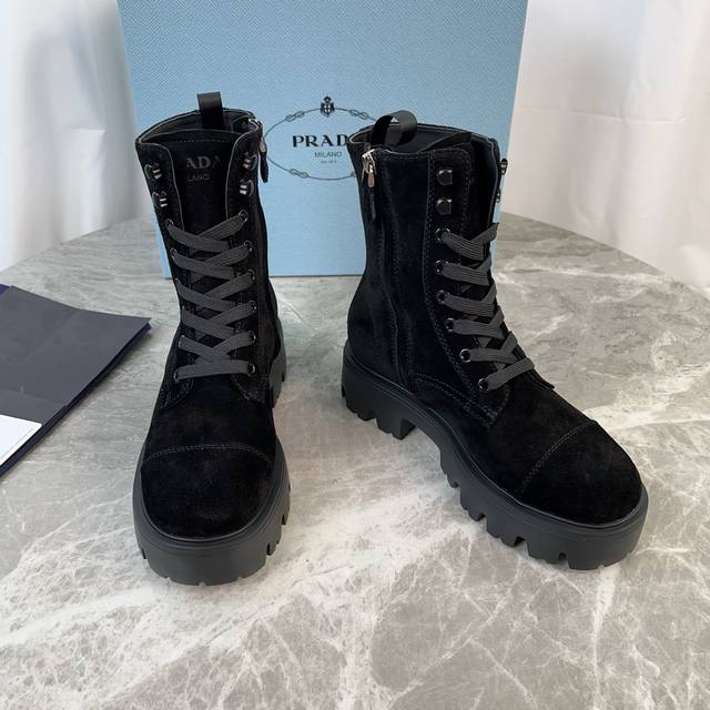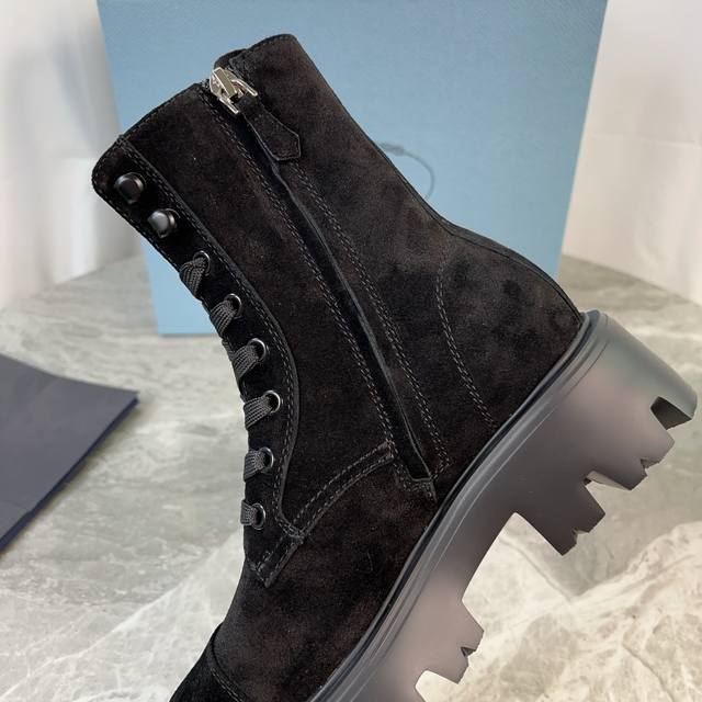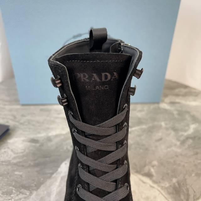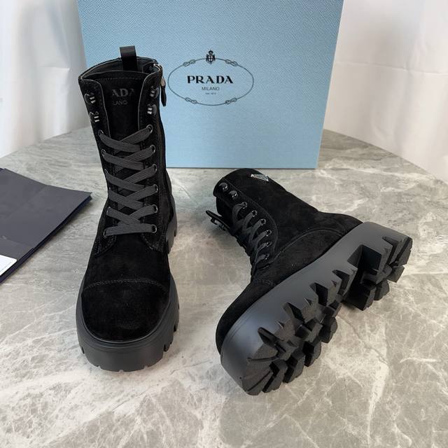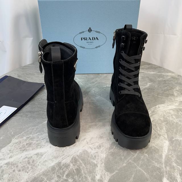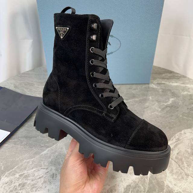 model. Outer: Imported full-grain cowhide, high-gloss suede. Lining: Imported calfskin. Pad: Imported calfskin. Sole: Original craftsmanship, 6cm thick sole. Features the iconic triangle logo and original packaging. Size: 35-42 (41.42 custom sizes available).