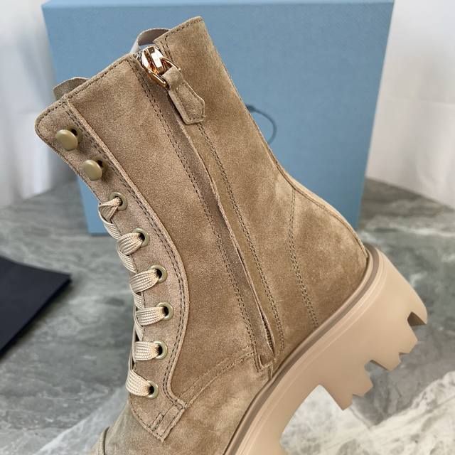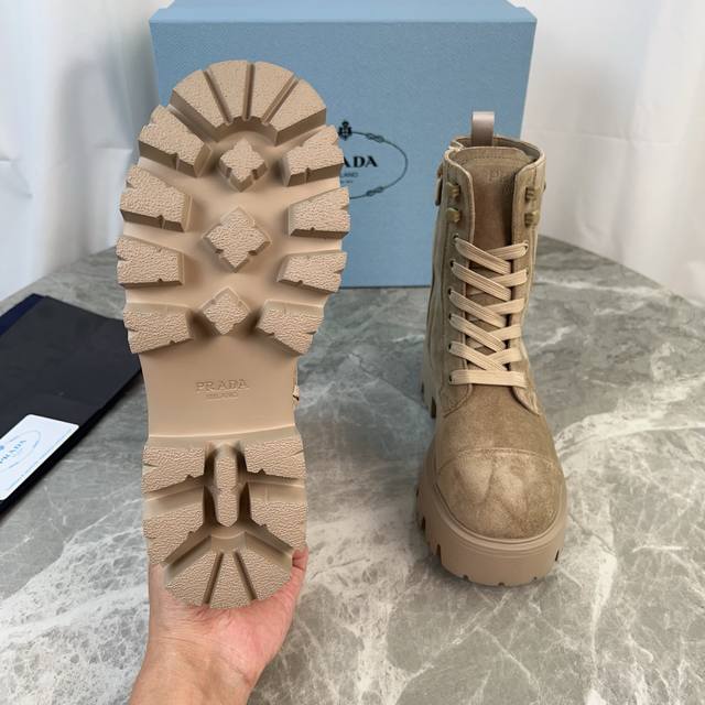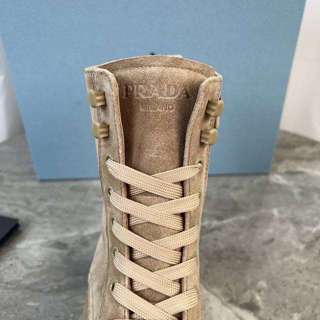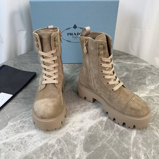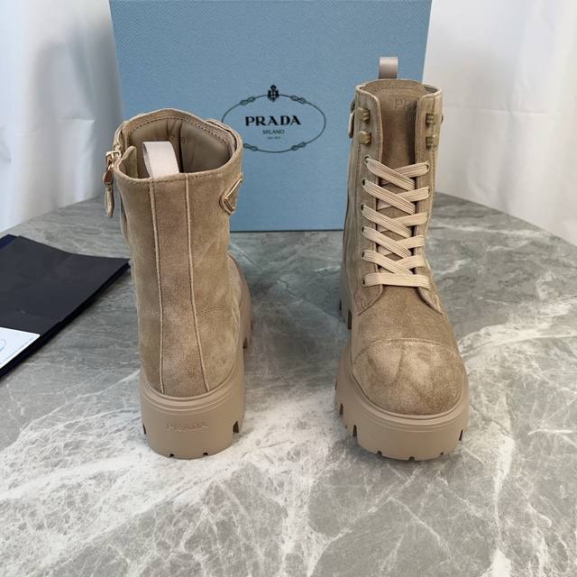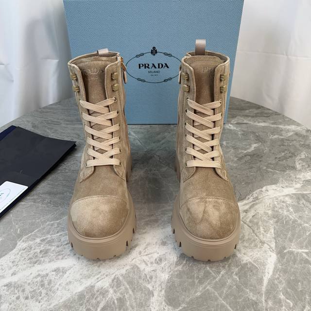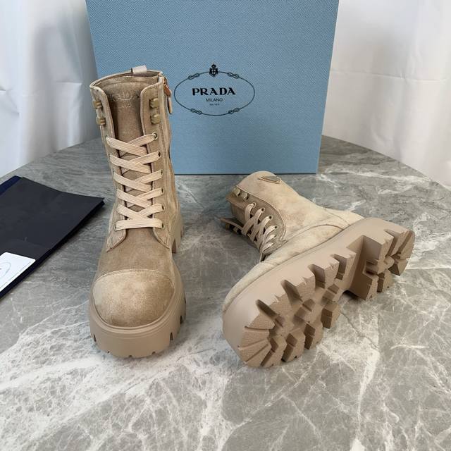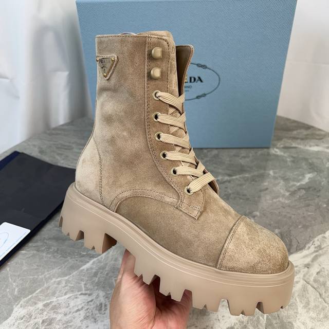 model. Outer: Imported full-grain cowhide, high-gloss suede. Lining: Imported calfskin. Pad: Imported calfskin. Sole: Original craftsmanship, 6cm thick sole. Features the iconic triangle logo and original packaging. Size: 35-42 (41.42 custom sizes available).