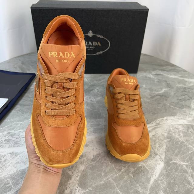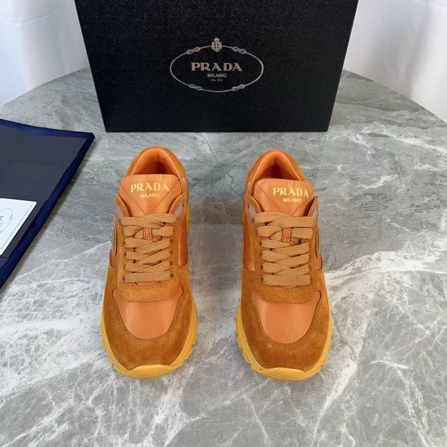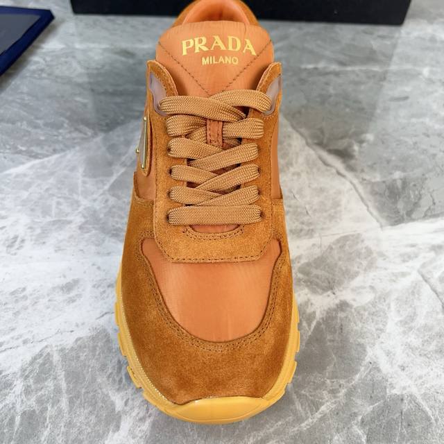 Latest P brand model. Upper: High-gloss cow suede + imported brand fabric. Lining: Super soft mixed sheepskin. Sole: Original TPU outsole. Features the iconic triangle logo and original packaging. Size: 35-41.