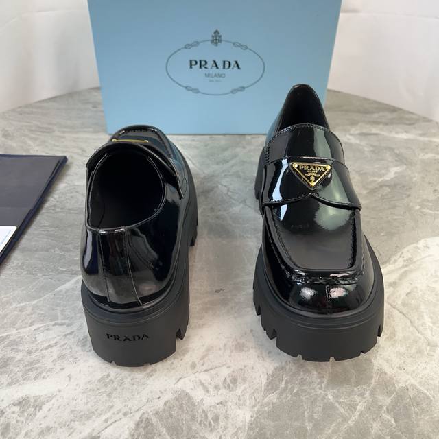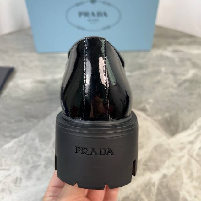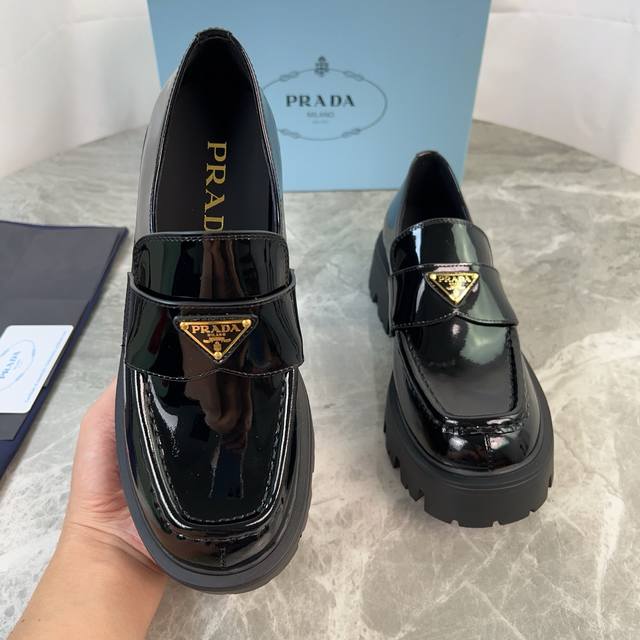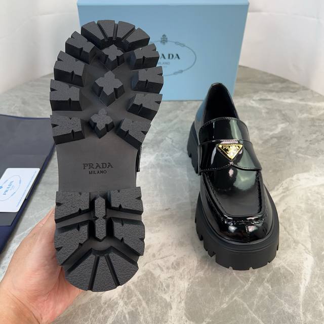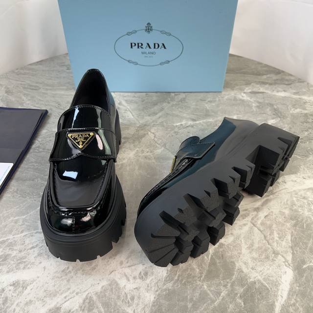 model. Upper: Imported split-edge beads, cow patent leather, high-gloss cow suede. Lining: Imported calfskin. Pad: Imported calfskin. Sole: Original craftsmanship, 6cm thick sole. Features the iconic triangle logo and original packaging. Size: 35-42 (41.42 custom sizes available).