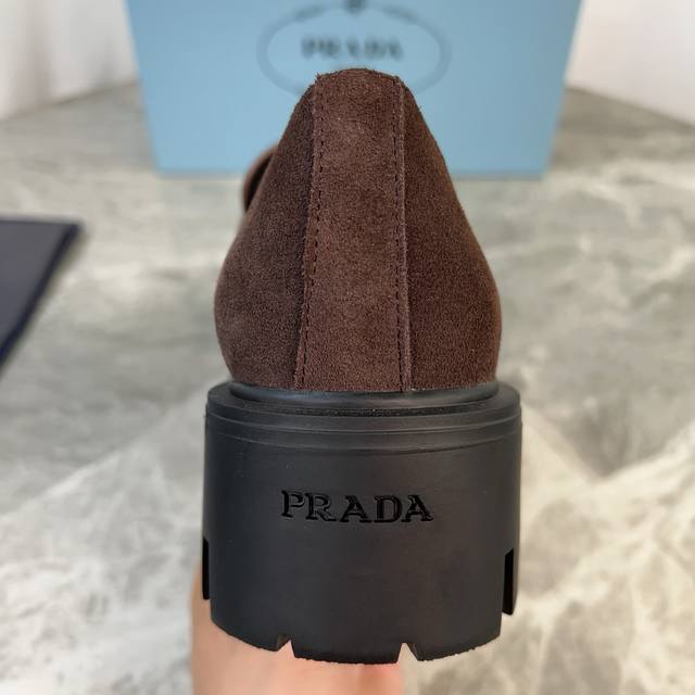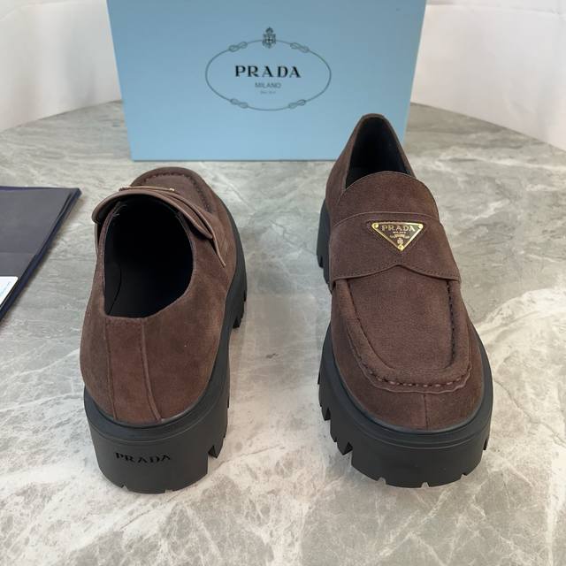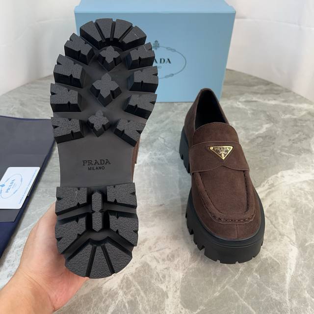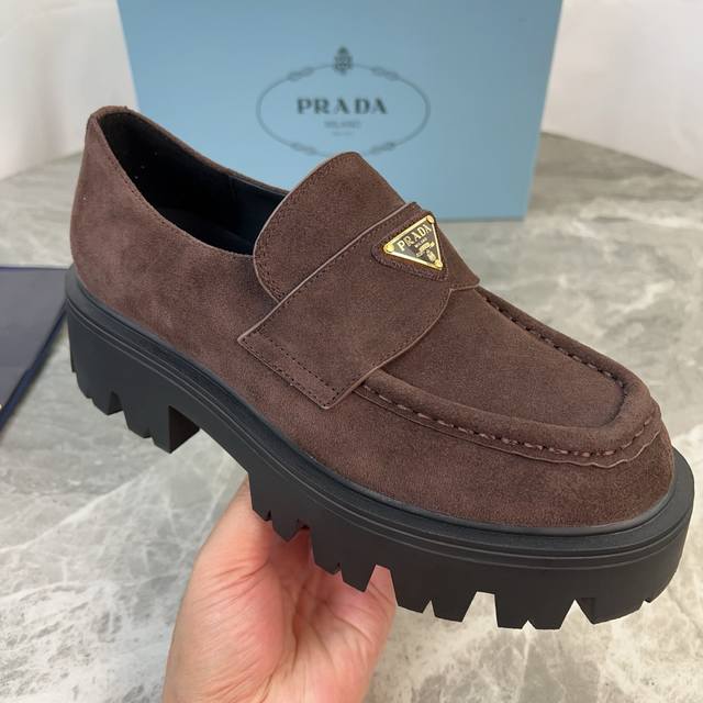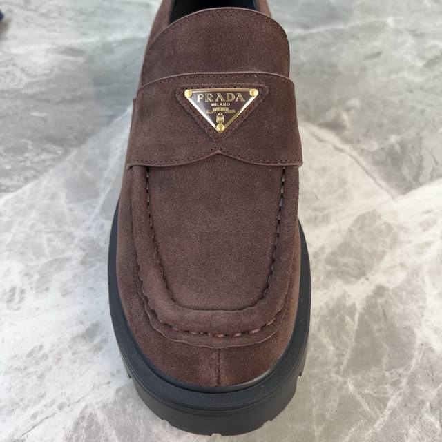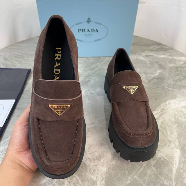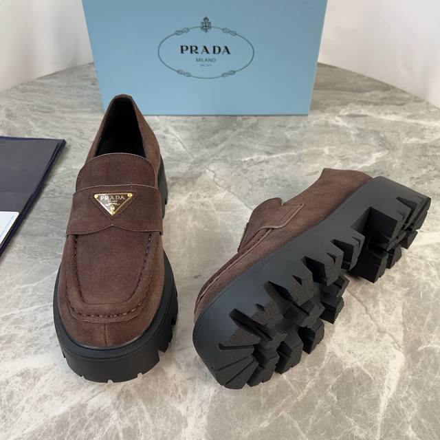 model. Upper: Imported split-edge beads, cow patent leather, high-gloss cow suede. Lining: Imported calfskin. Pad: Imported calfskin. Sole: Original craftsmanship, 6cm thick sole. Features the iconic triangle logo and original packaging. Size: 35-42 (41.42 custom sizes available).
