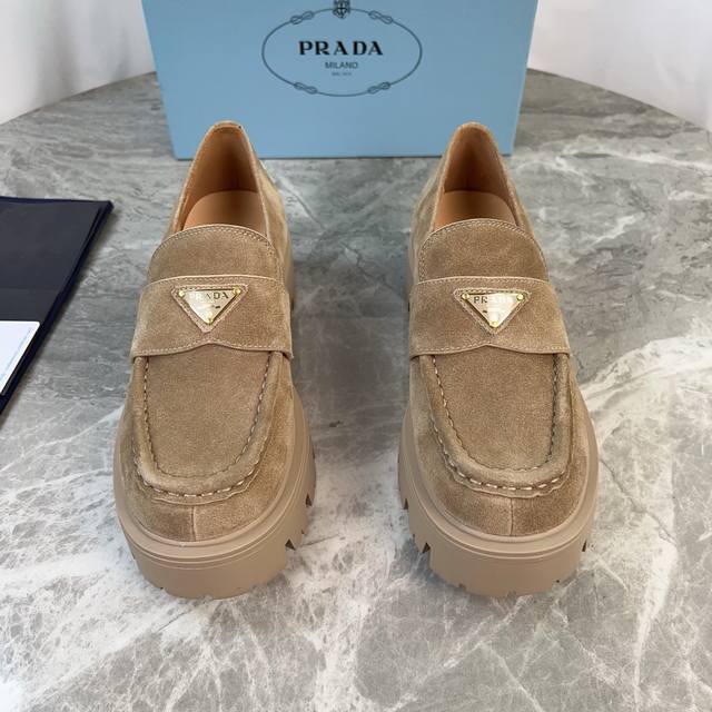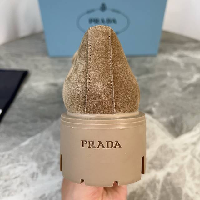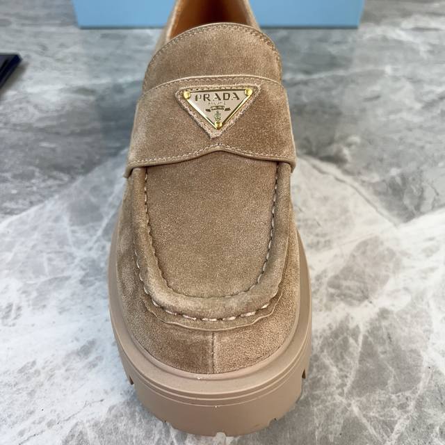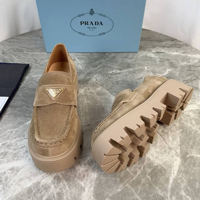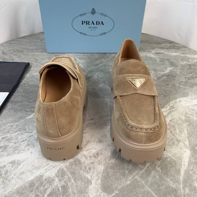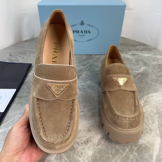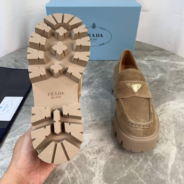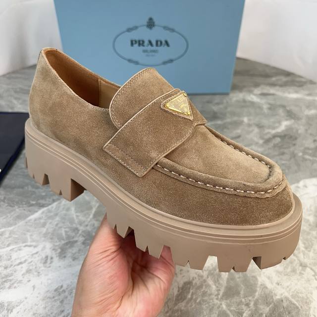 model. Upper: Imported split-edge beads, cow patent leather, high-gloss cow suede. Lining: Imported calfskin. Pad: Imported calfskin. Sole: Original craftsmanship, 6cm thick sole. Features the iconic triangle logo and original packaging. Size: 35-42 (41.42 custom sizes available).