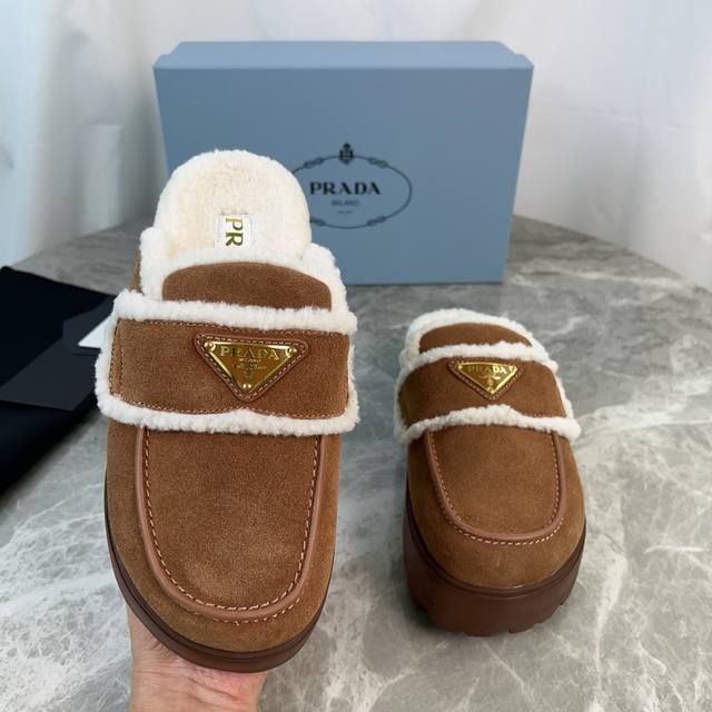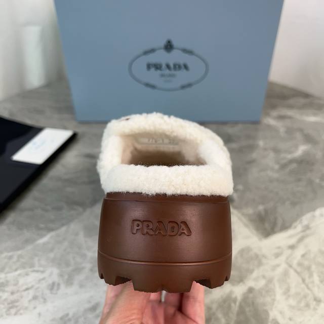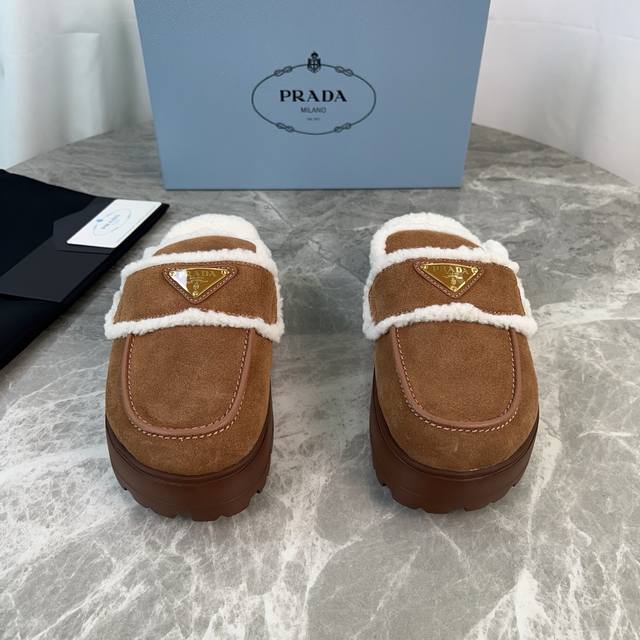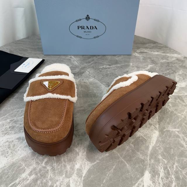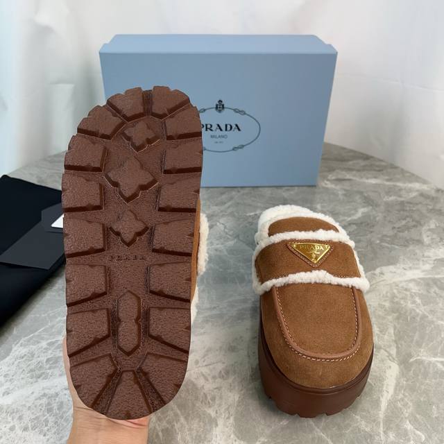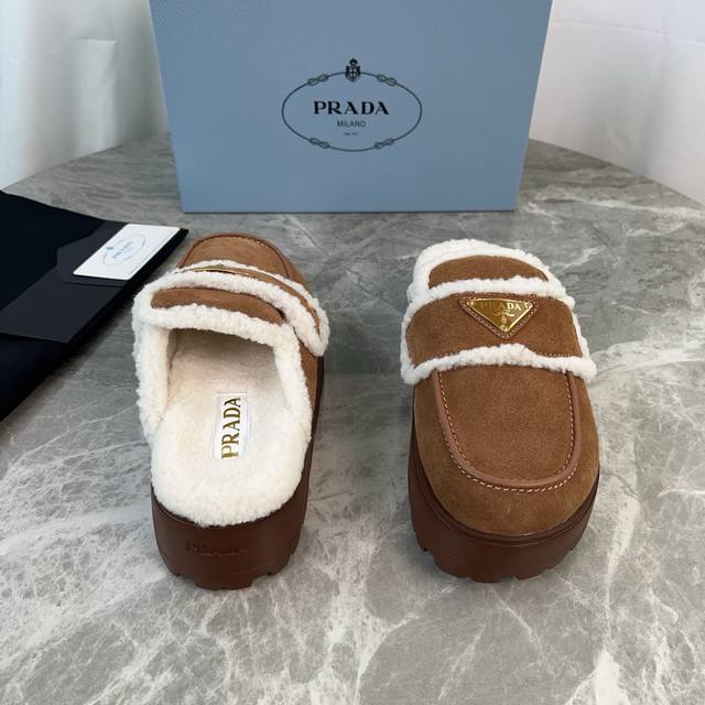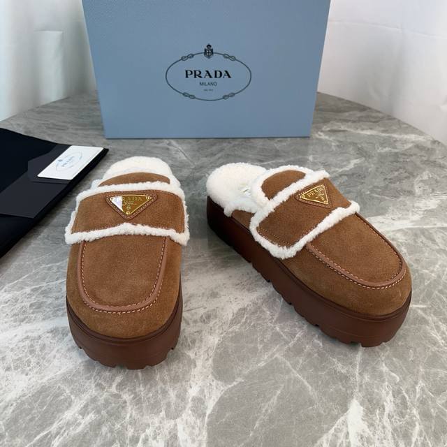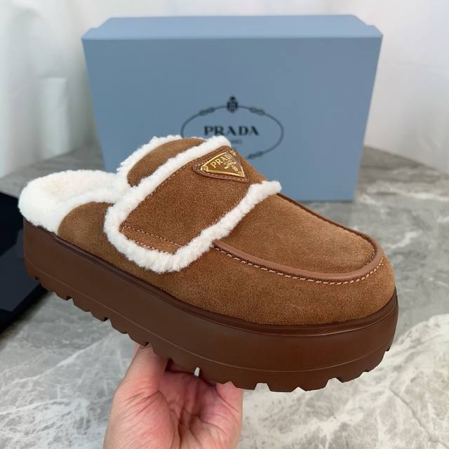 Latest P-brand fleece slippers. Outer: Imported high-gloss cow suede. Lining: Imported lamb's wool. Mat: Lambswool. Sole: Ultra-light rubber foam sole, 6cm thick. Features the iconic triangle logo and original packaging. Size: 35-41. Custom sizes 40 and 41 are available.