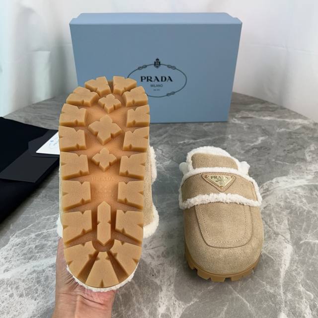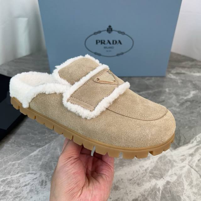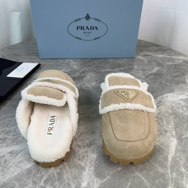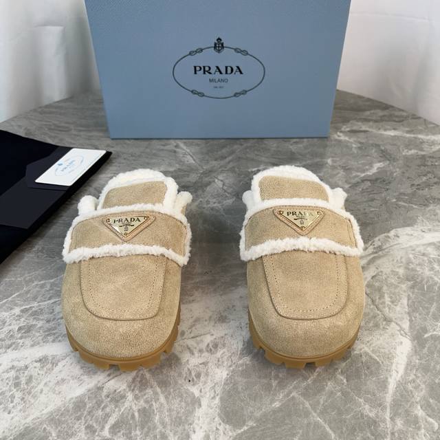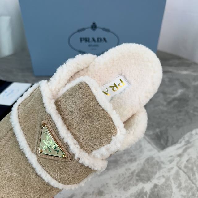 Latest P-brand fleece slippers. Outer: Imported high-gloss cow suede. Lining: Imported lamb's wool. Mat: Lambswool. Sole: Original molded non-slip patterned outsole. Features the iconic triangle logo and original packaging. Size: 35-41. Custom sizes 40 and 41 are available.