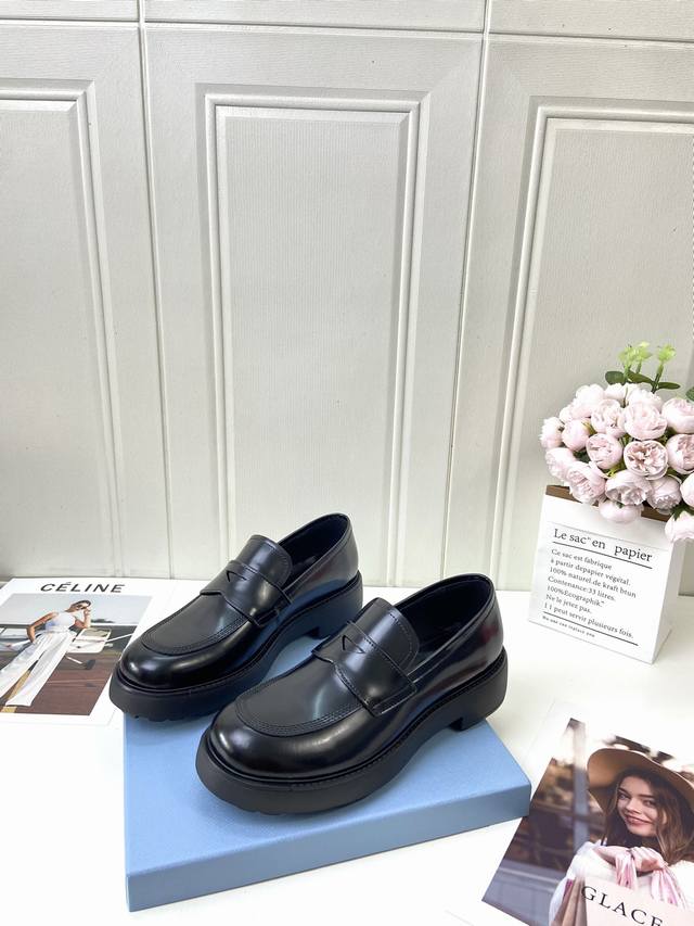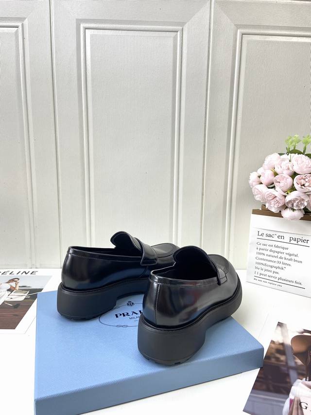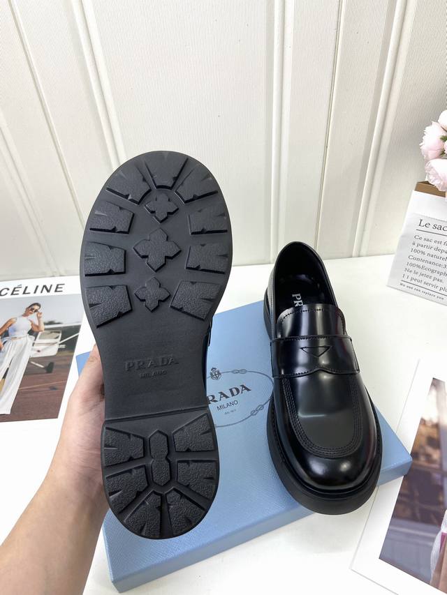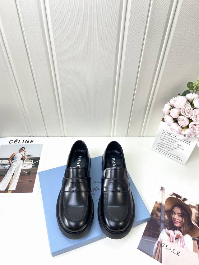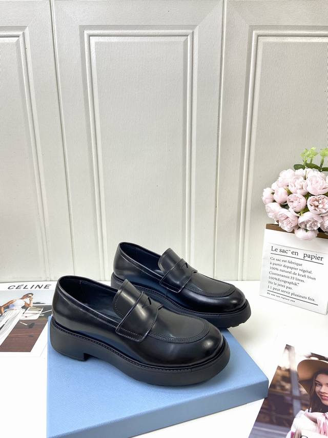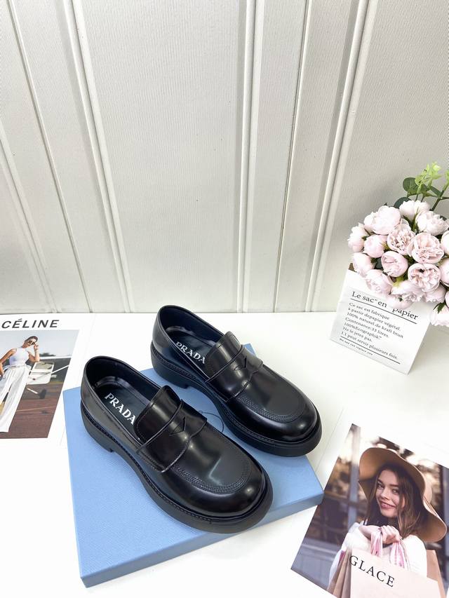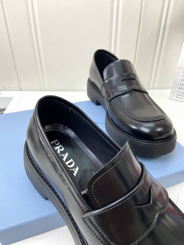 Latest Prada lace-up derby shoes, micro-logo shiny round-toe spliced loafers, purchased original one-to-one development, one-to-one private mold of the outsole, the fabric is made of imported original open-edge beads, inner cowhide, cowhide padding, outsole height 5cm, outsole original rubber foam sole, size 39-46