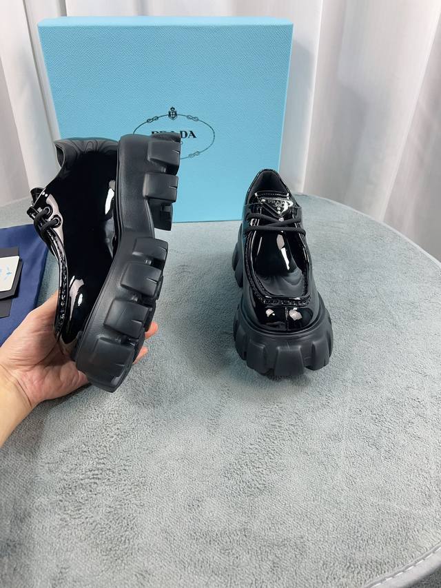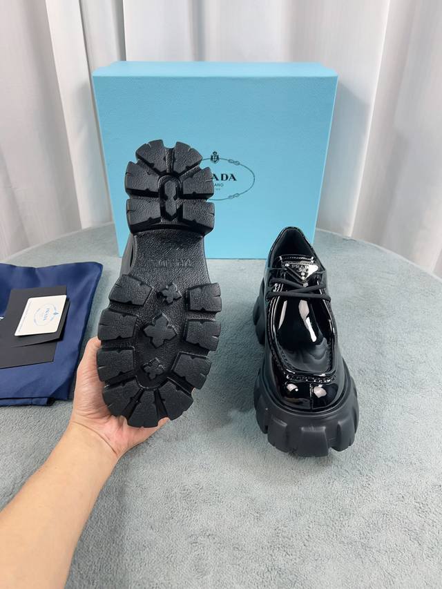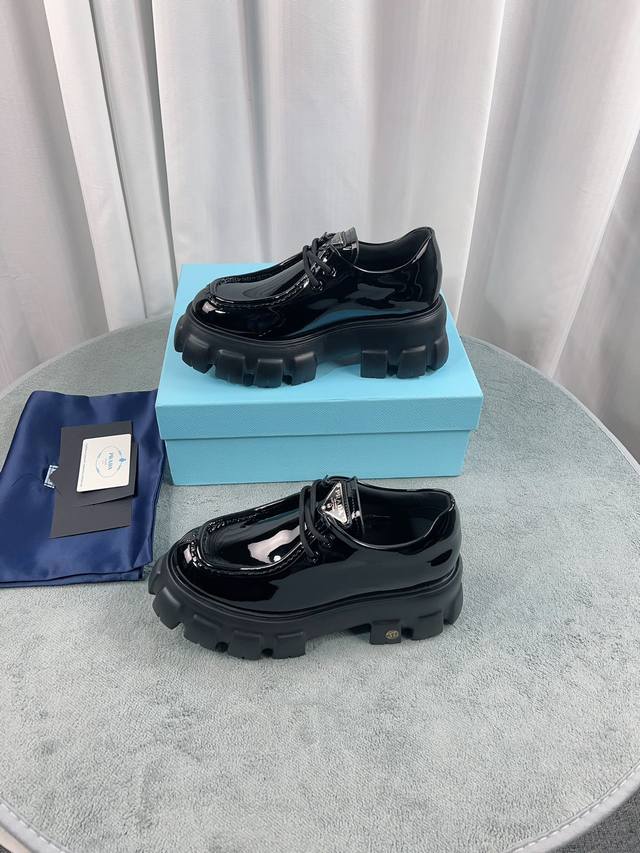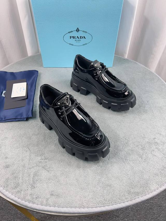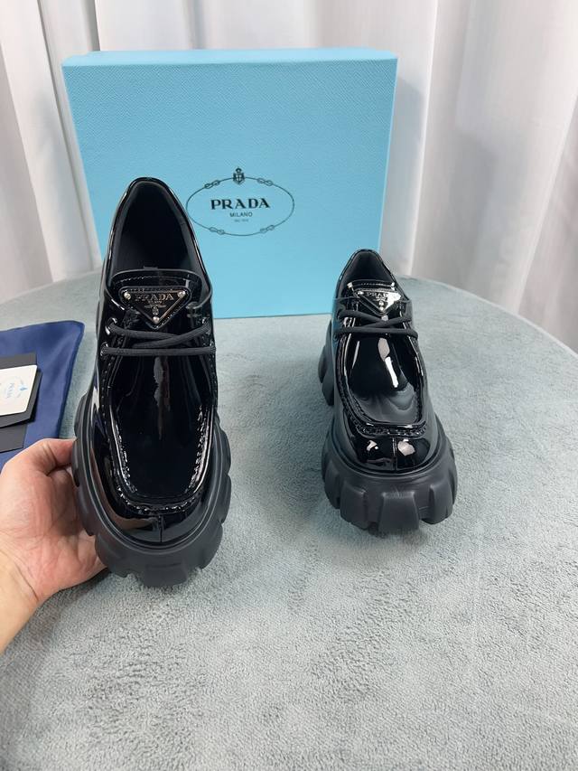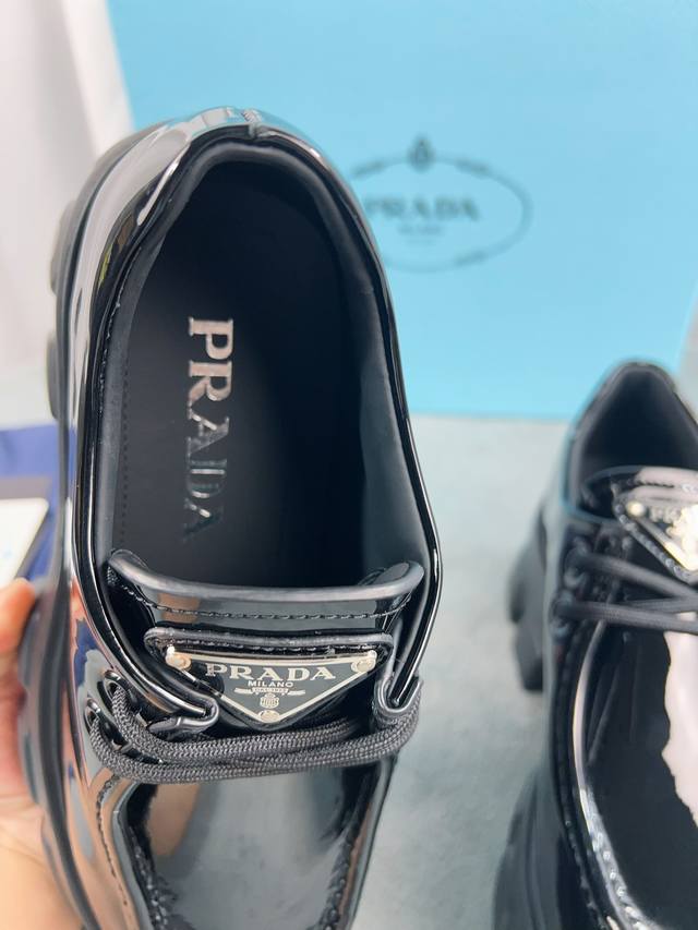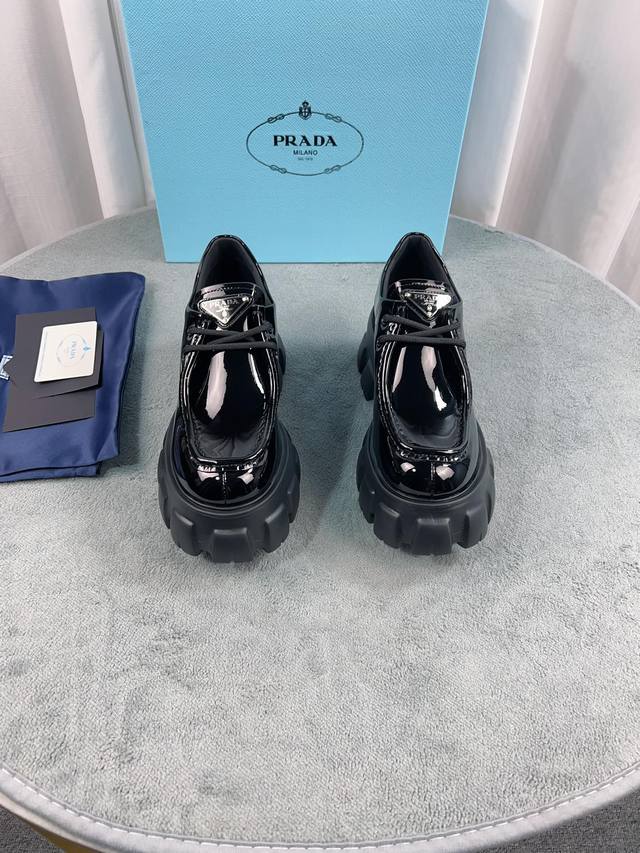 Latest Prada Loafers Upper: Imported split-edge beads, patent leather Lining: Imported mixed sheepskin lining, insole Sole: Original Italian platform foam outsole Sizes: 35-41 Sizes 40 and 41 are custom-made and non-refundable/non-exchangeable
