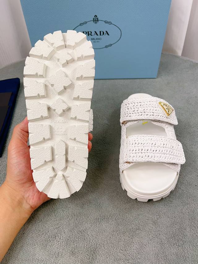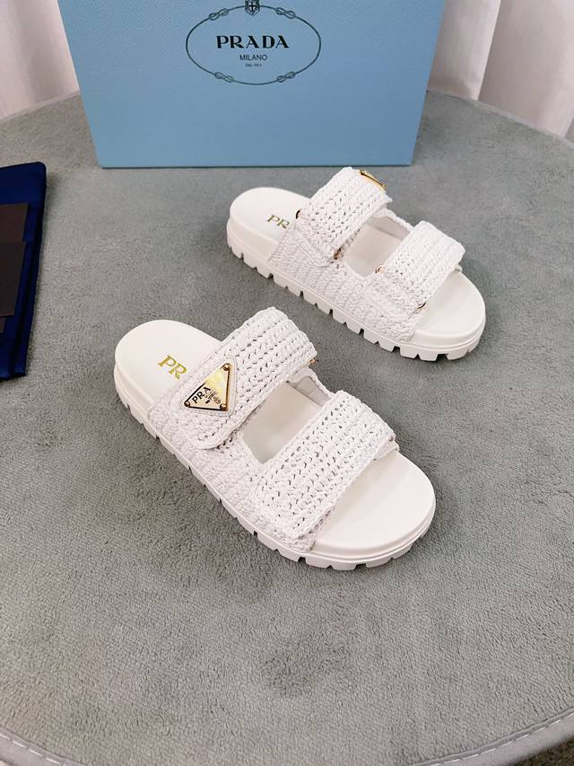 Latest Prada model. Outer: Original custom raffia leather. Lining: Imported mixed sheepskin. Sole: Original 1:1 molded sole. Heel height: 2.5cm. Size: 35-41.
