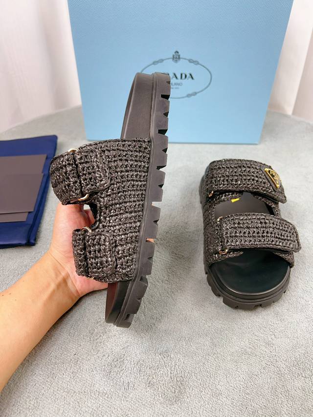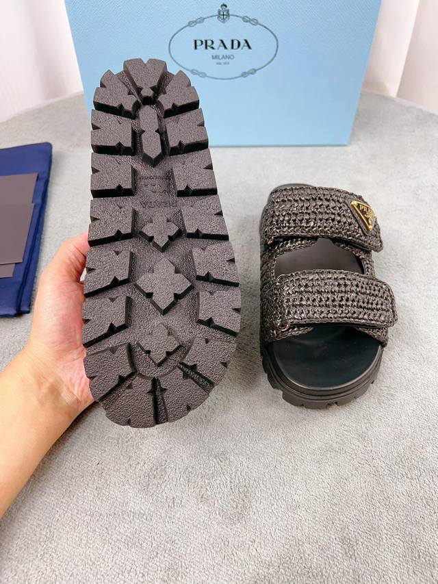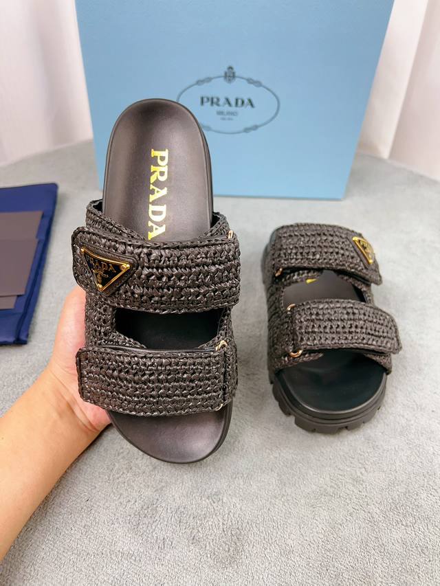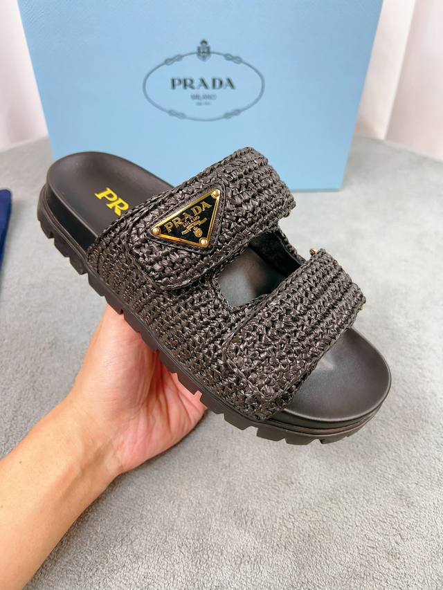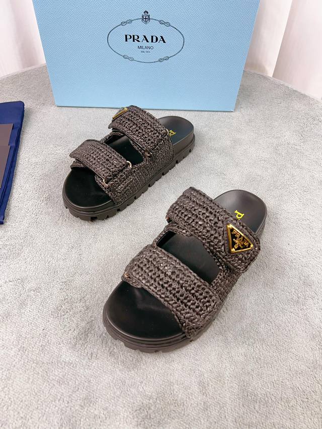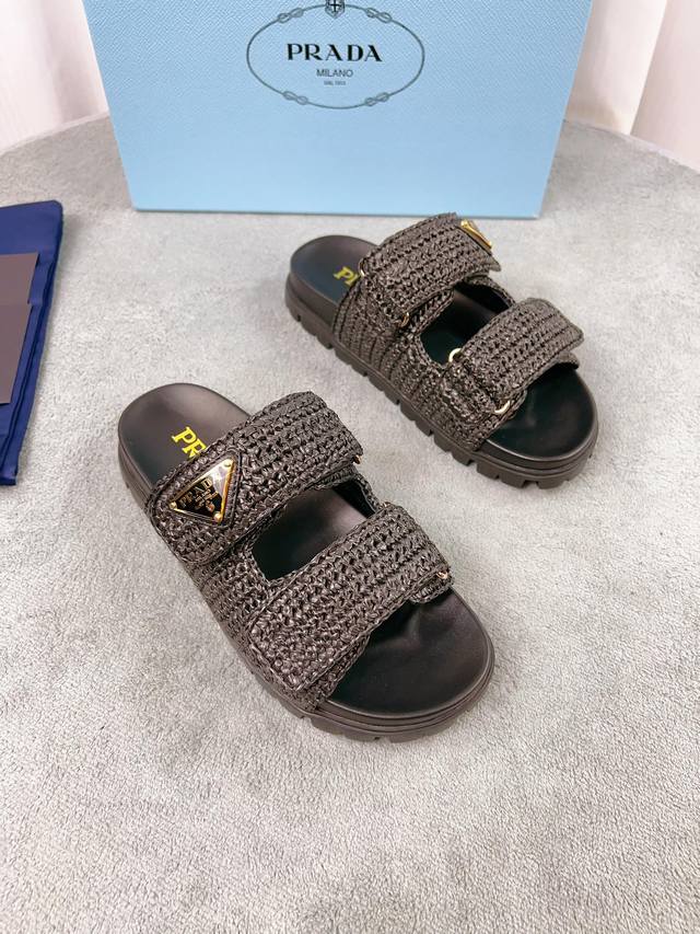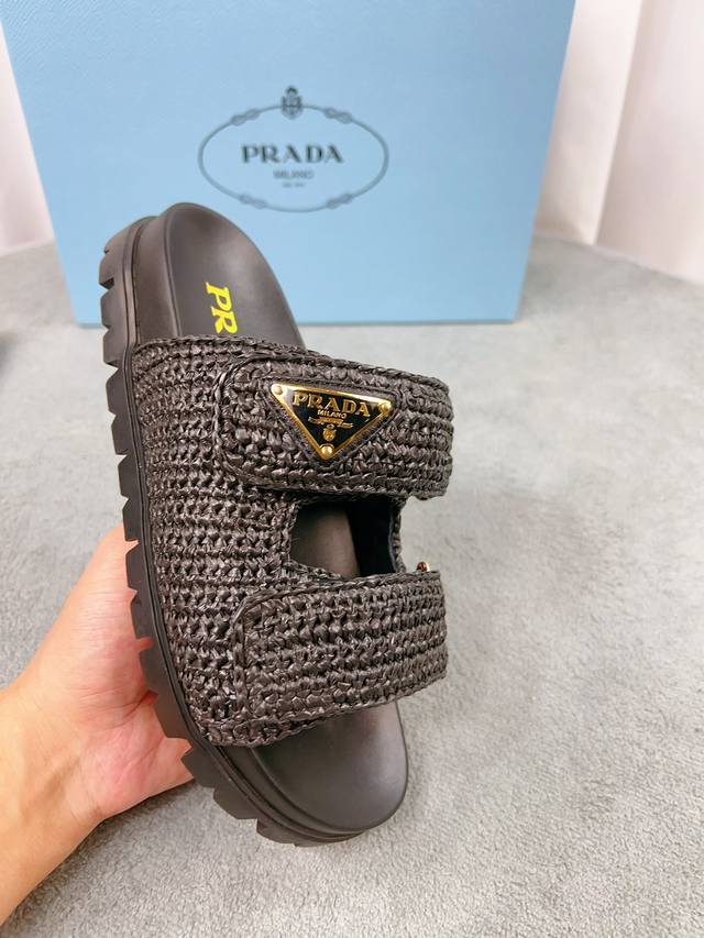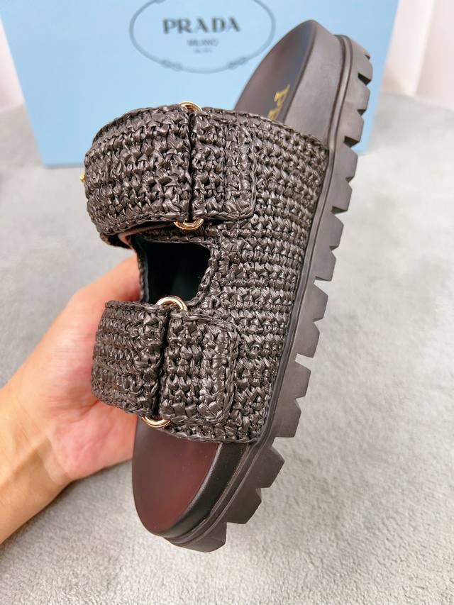 Latest Prada model. Upper: Original custom raffia leather. Lining: Imported mixed sheepskin. Sole: Original 1:1 molded sole. Heel height: 2.5cm. Size: 35-41.
