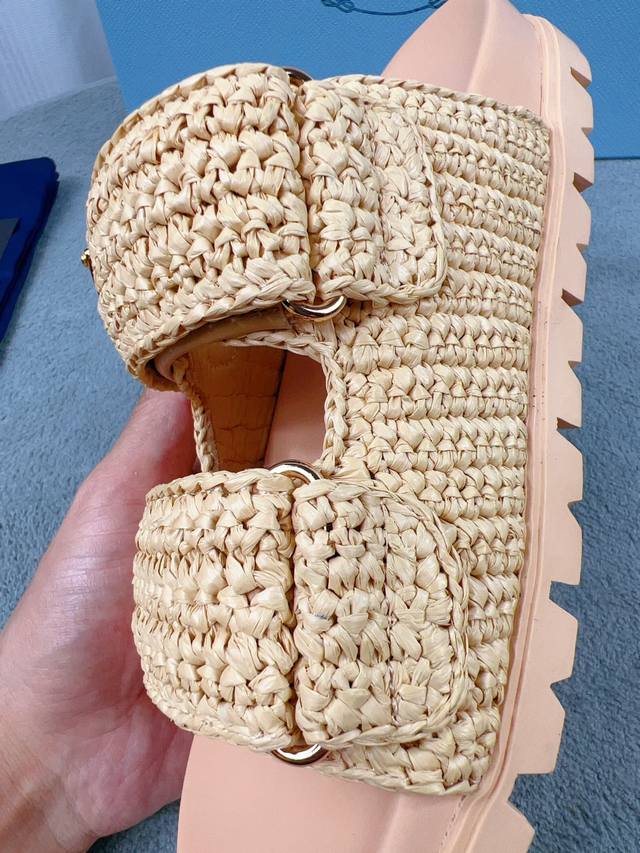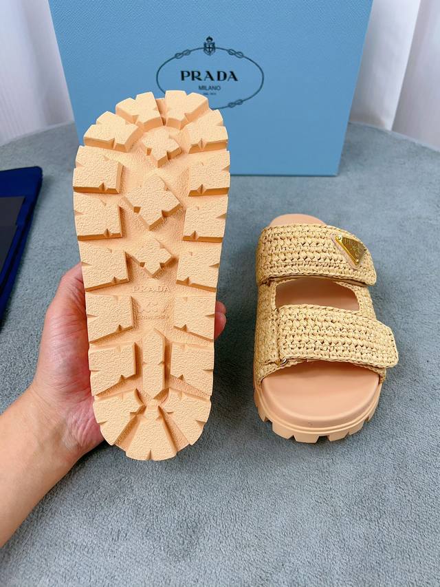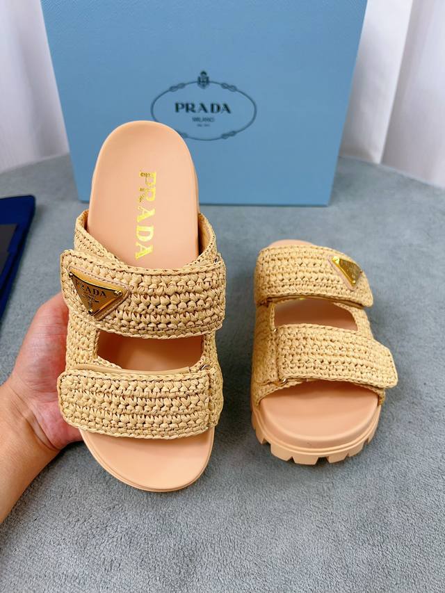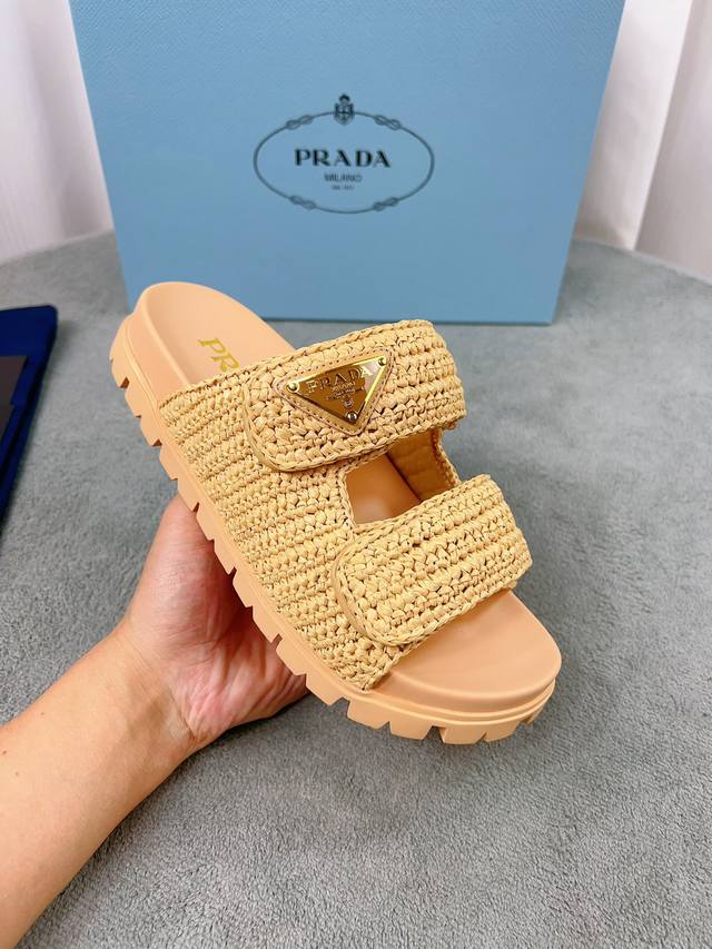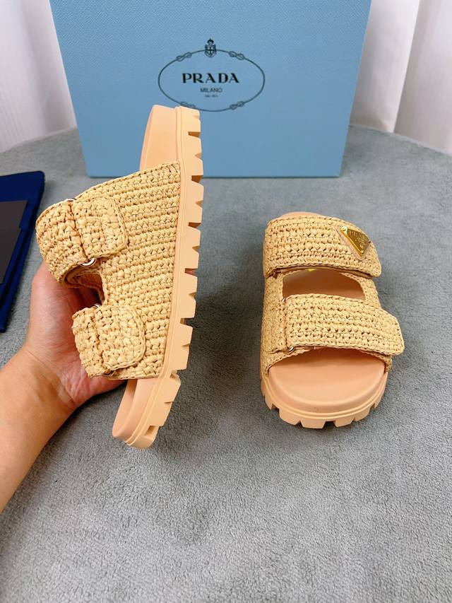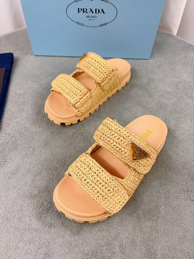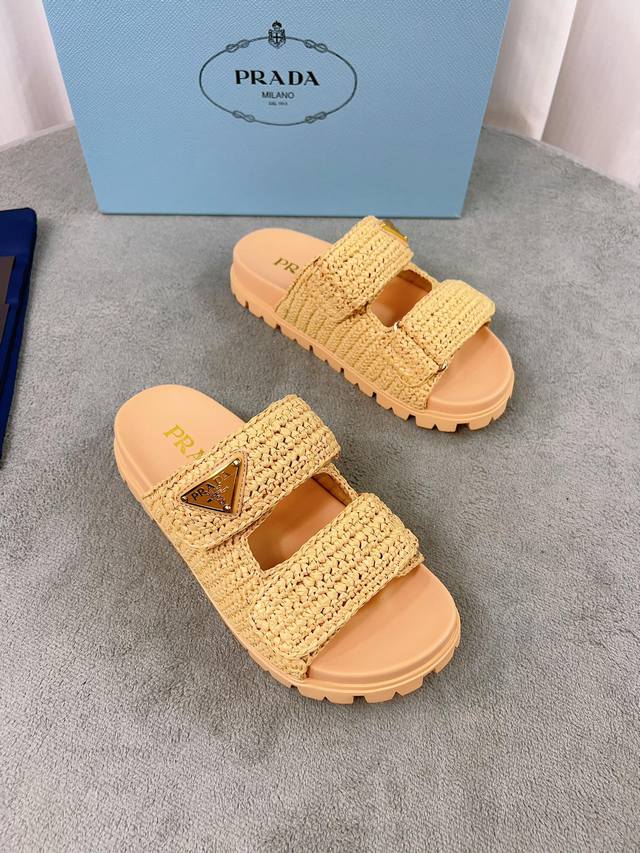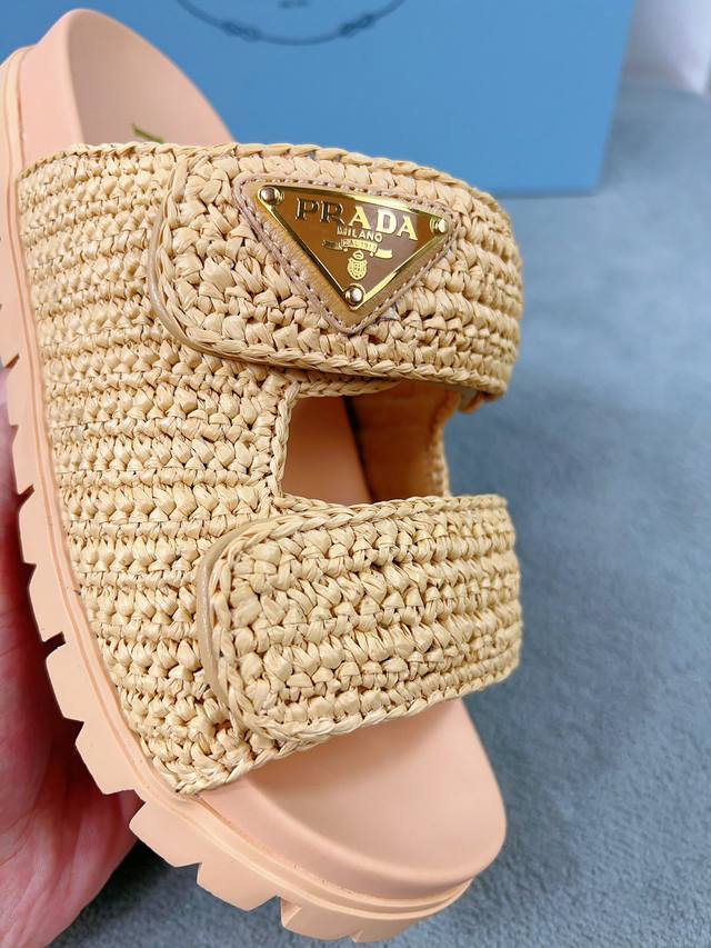 Latest Prada model. Upper: Original custom raffia leather. Lining: Imported mixed sheepskin. Sole: Original 1:1 molded sole. Heel height: 2.5cm. Size: 35-41.