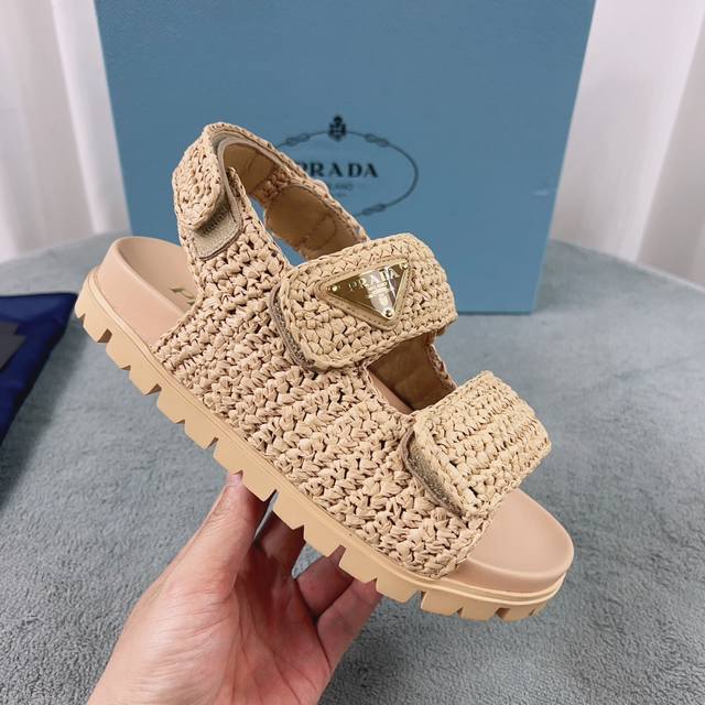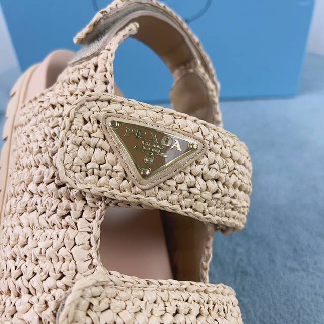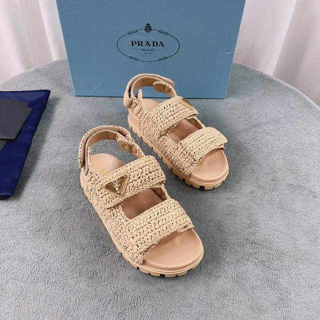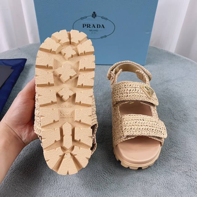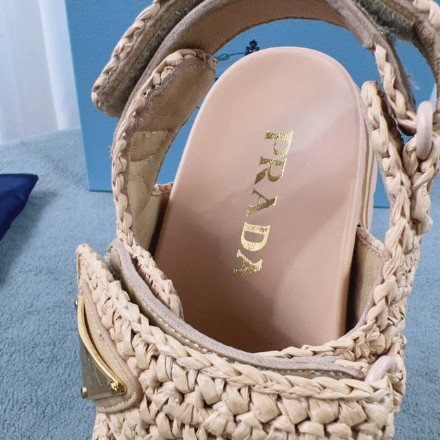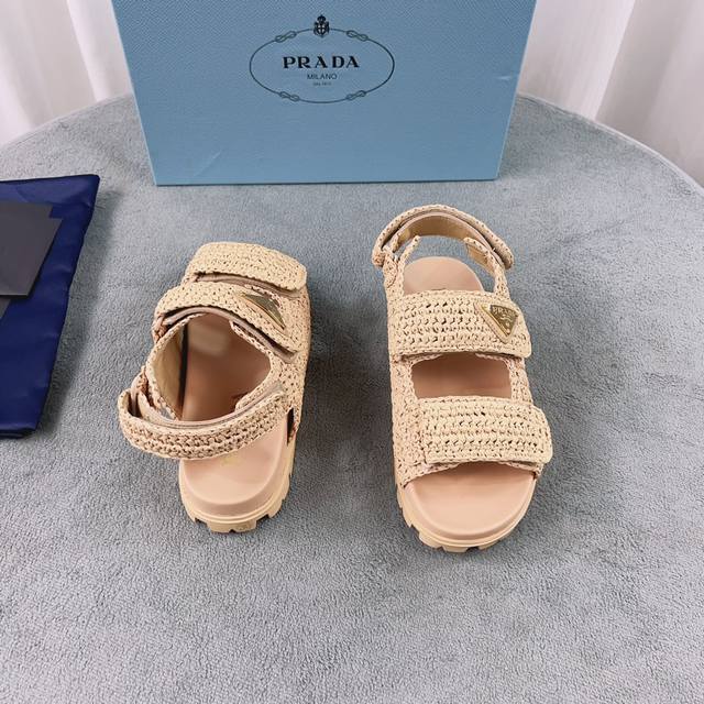 Latest Prada model. Upper: Original custom raffia leather. Lining: Imported mixed sheepskin. Sole: Original 1:1 molded sole. Heel height: 2.5cm. Size: 35-41.