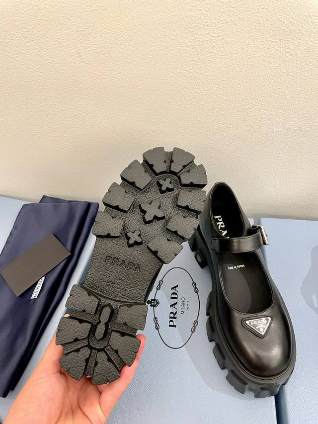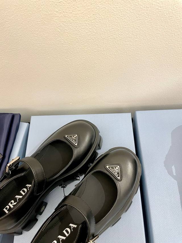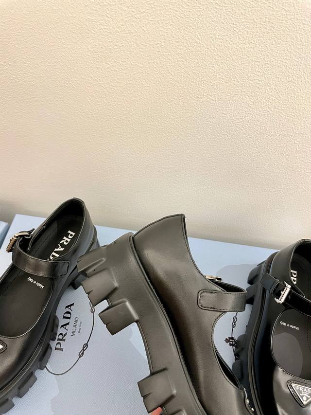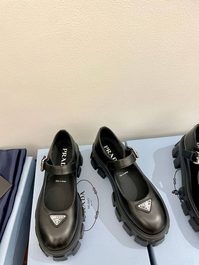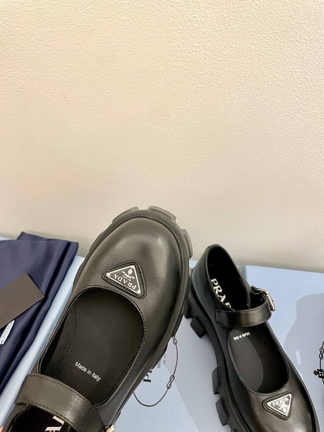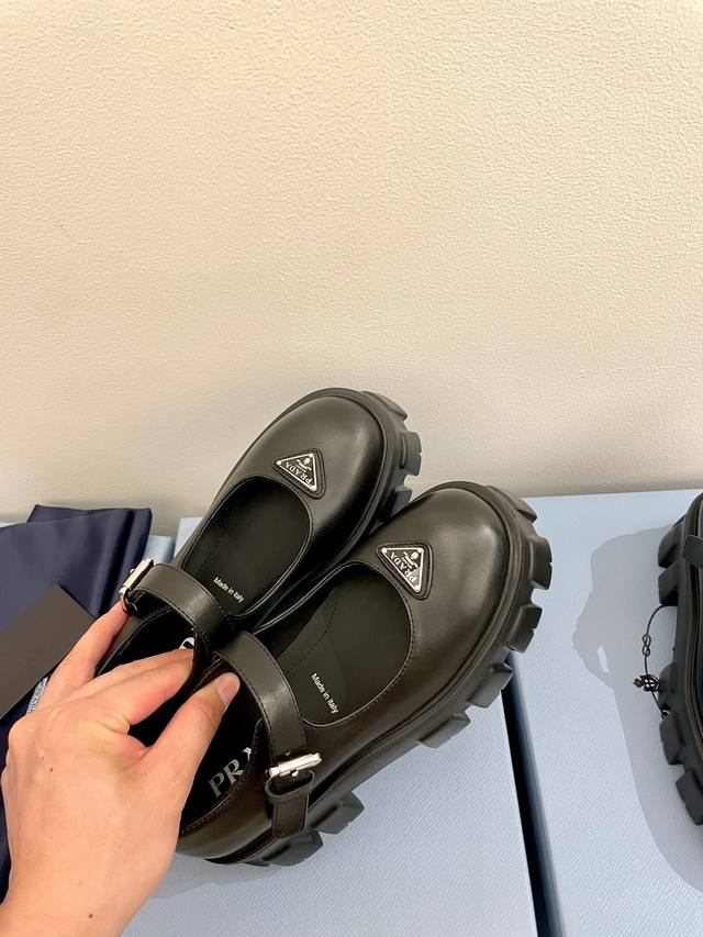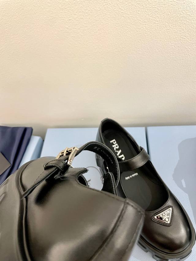 The iconic Monolith shoe's geometric design and bold silhouette give this Mary Jane a fresh new style. The mixed-style shoe combines classic lines with bold details, inspired by the inherent duality of Prada's aesthetic. The upper features a strap and metal buckle