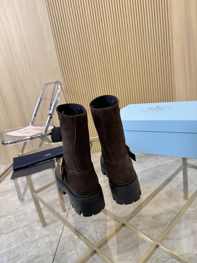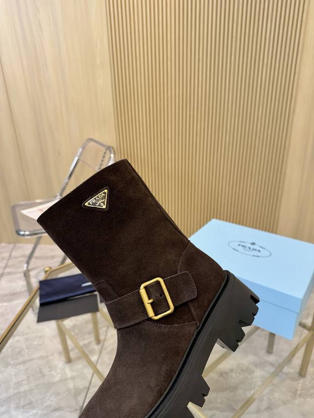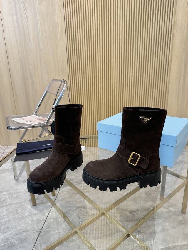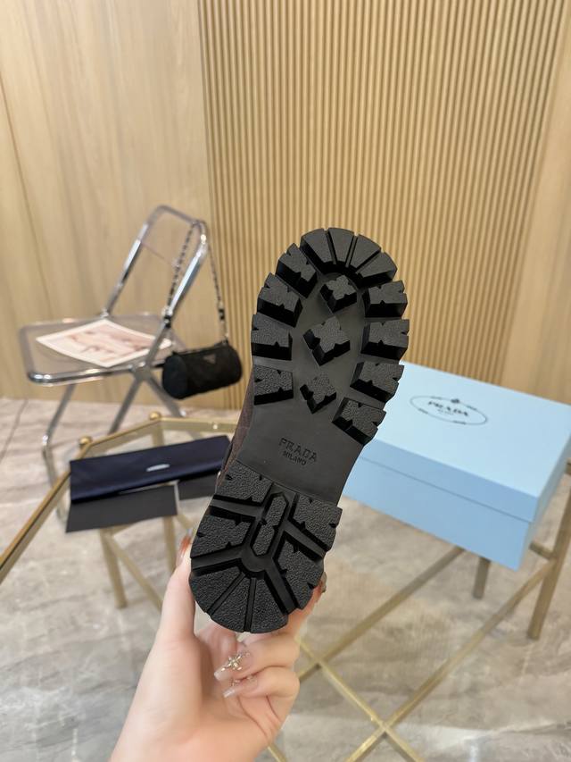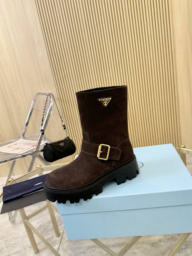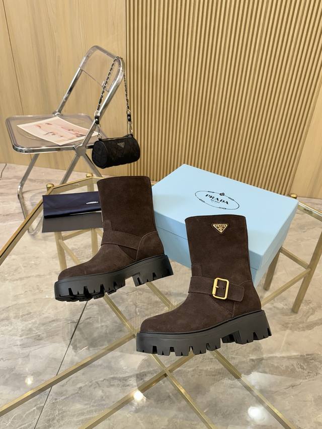 Leather Suede Prada* 25Ss Classic Triangle Logo Slip-on Women's Boots A must-have for winter, this is definitely a hot item this year!! Super stylish! Prada boots are truly amazing! They look sophisticated and make your legs look slimmer, perfectly capturing your elegance. Upper: Cowhide/Nubuck Lining: Cowhide Outsole: Original molded outsole Size: 35-41