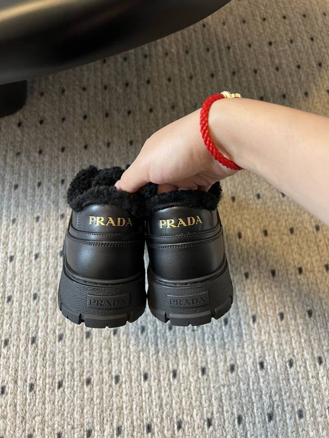 Very warm shoes, look cute too, wear on the feet without making the feet look big, look soft and tender, and have good warmth retention. Made of imported calfskin material, with lambskin lining, the sole is a high-density foam sole, light and comfortable, with a perfect height-increasing effect. The triangle label adds a sense of luxury.