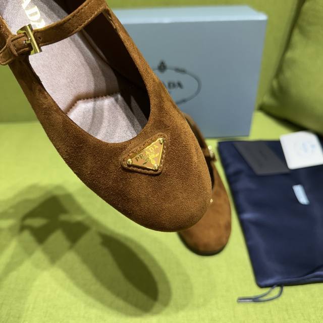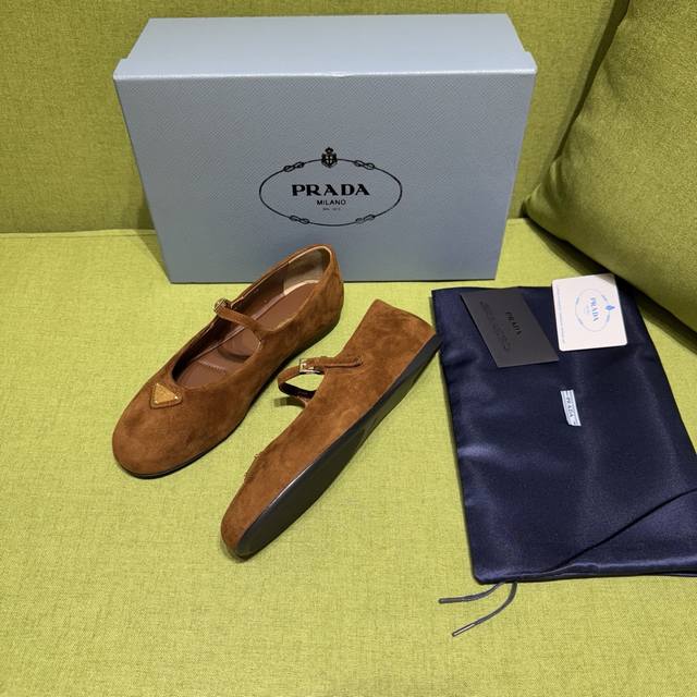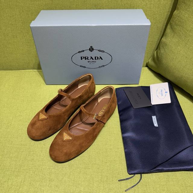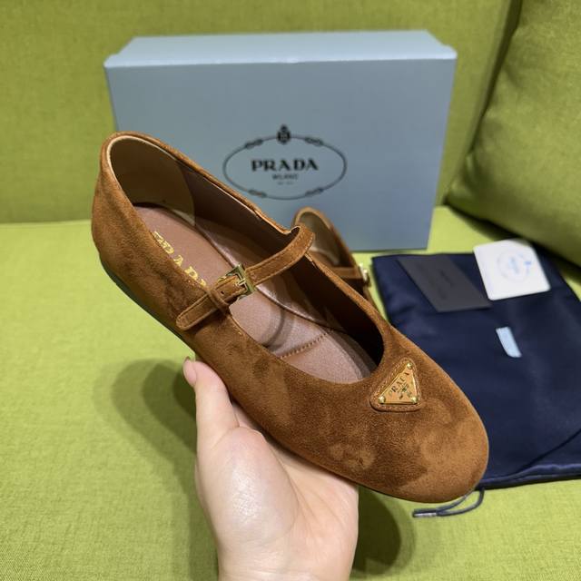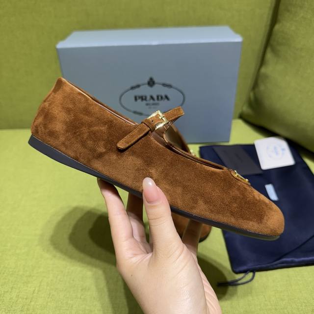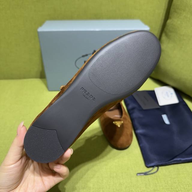 New color Prada 2025 Autumn New Arrival. Recommended by major bloggers on Xiaohongshu, 1-to-1 development showcasing classic charm. Original TPU outsole, imported mixed sheepskin lining. This suede leather ballet flat exudes elegant charm with its tapered silhouette. It features a round toe design, a rubber sole, classic lines paired with elegant details, and is adorned with an enamel triangular metal logo. Sizes: 35-42. Custom sizes 35-40-42 are non-refundable. Factory price: [Price not provided]