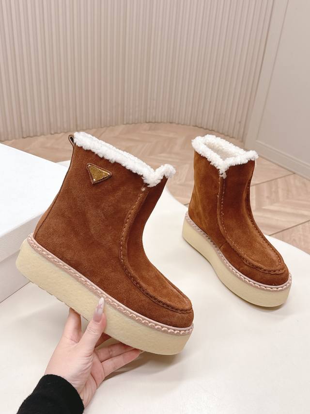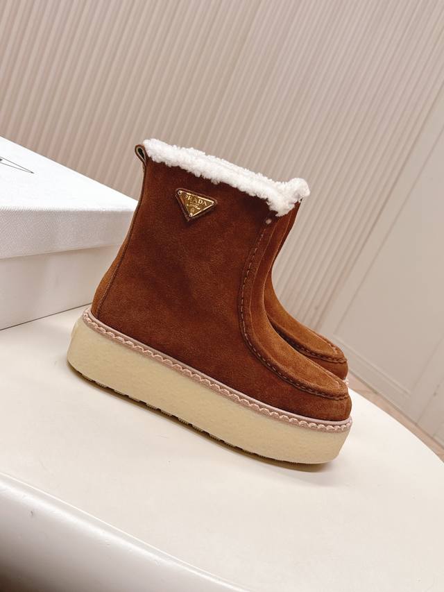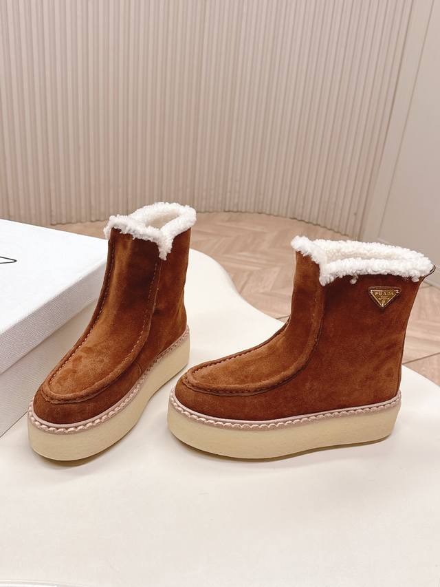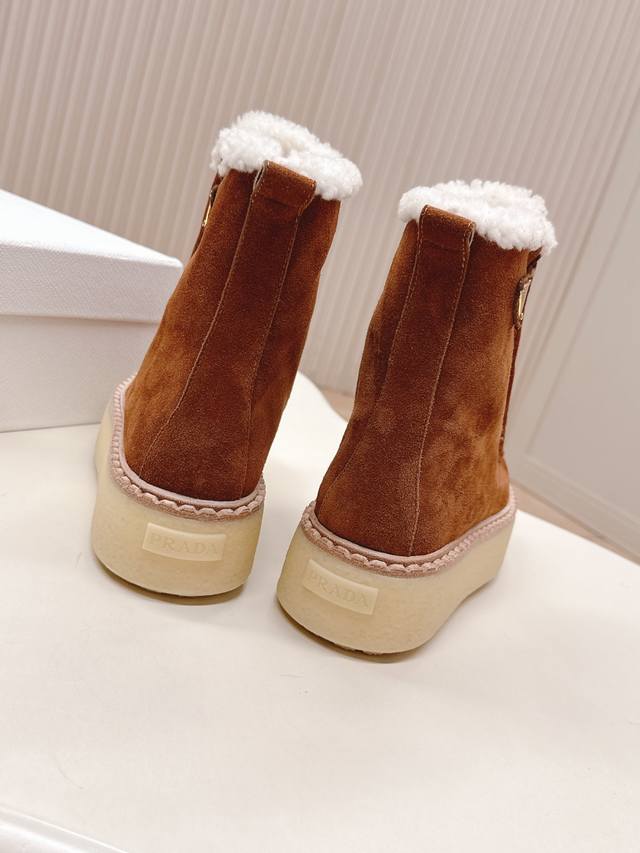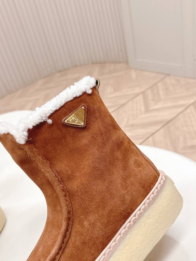 New color series of ankle boots, high-tops, low-tops, and slippers!! Prada triangle logo wool shoes, platform boots, snow boots, and semi-slippery styles! High-grade cow wool, genuine lamb's wool, genuine leather welt, two-tone TPU outsole. Material details can be compared with the original, distinguishing it from ordinary versions on the market! Sizes: 35-39, 40, 41. Custom orders are non-refundable and non-exchangeable.