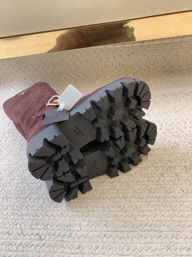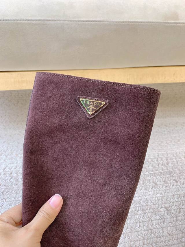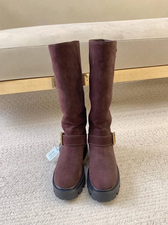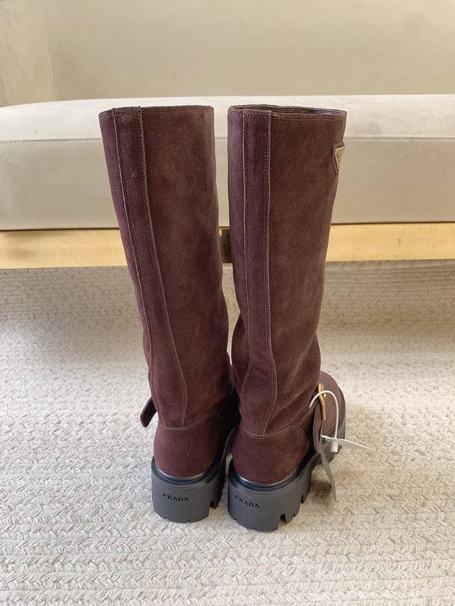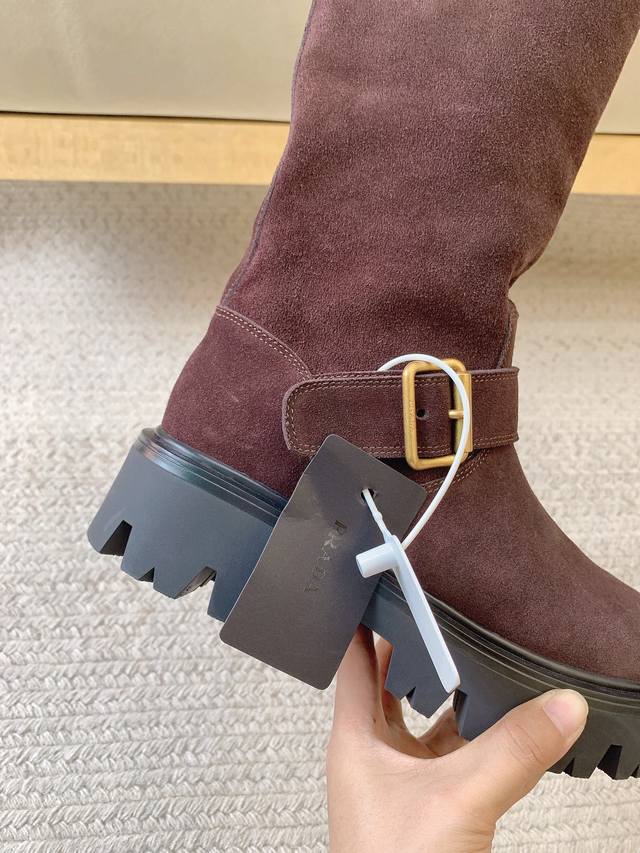 New Prad Ss25 Triangle Label Thick-Soled Tall Boots, Original Last, Top Quality. Materials: Upper: Imported cow suede, imported cow leather; Lining: Imported sheepskin; Outsole: Imported custom rubber sole. Sizes: 35-39 (34, 40, 41 are custom-made, no returns or exchanges).