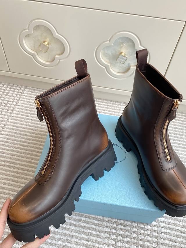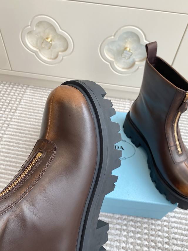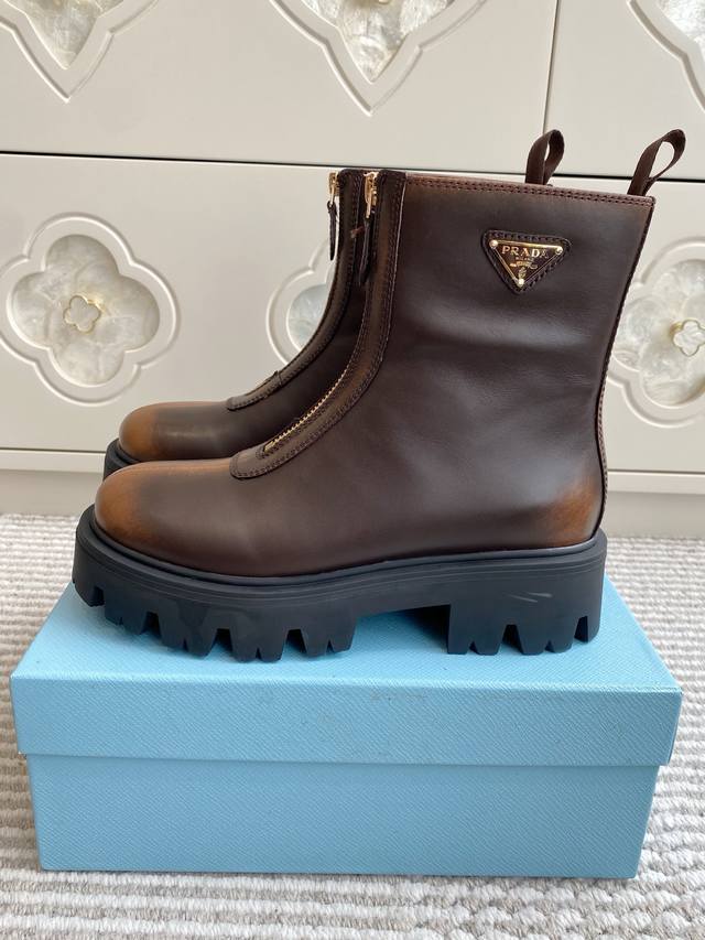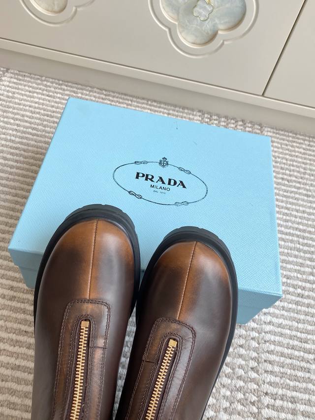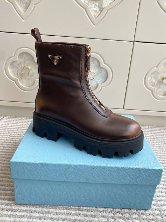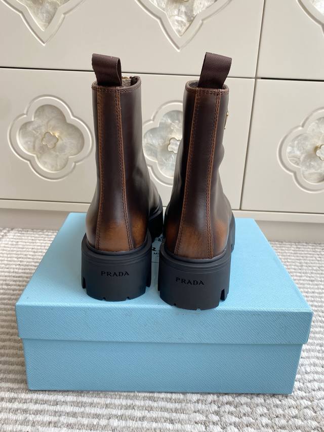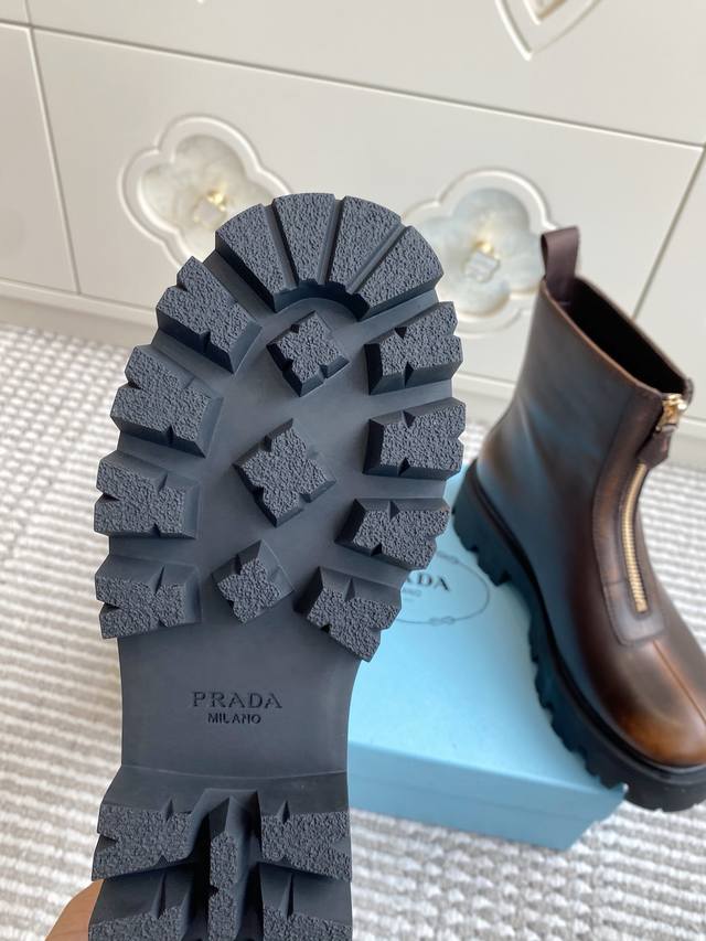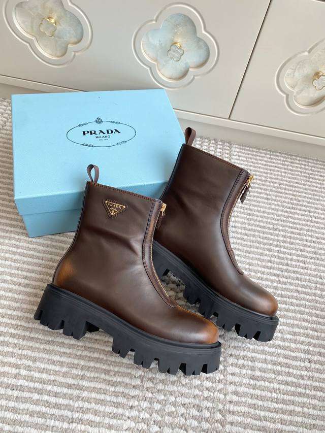 # New Prada thick-soled motorcycle boots. Top quality. Exquisite lines and craftsmanship define these leather boots, embellished with the iconic triangular logo. A unique metal buckle adds a touch of personality to the motorcycle style, complemented by a thick rubber sole. Upper: Imported cowhide suede. Lining: Sheepskin. Rubber outsole with original molded tread pattern. Sizes: 35-39, 40, 41. Custom made. No returns or exchanges.