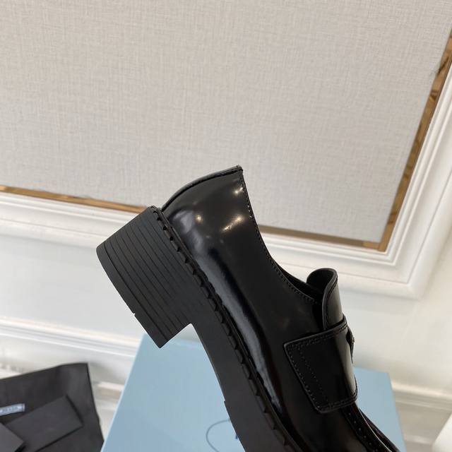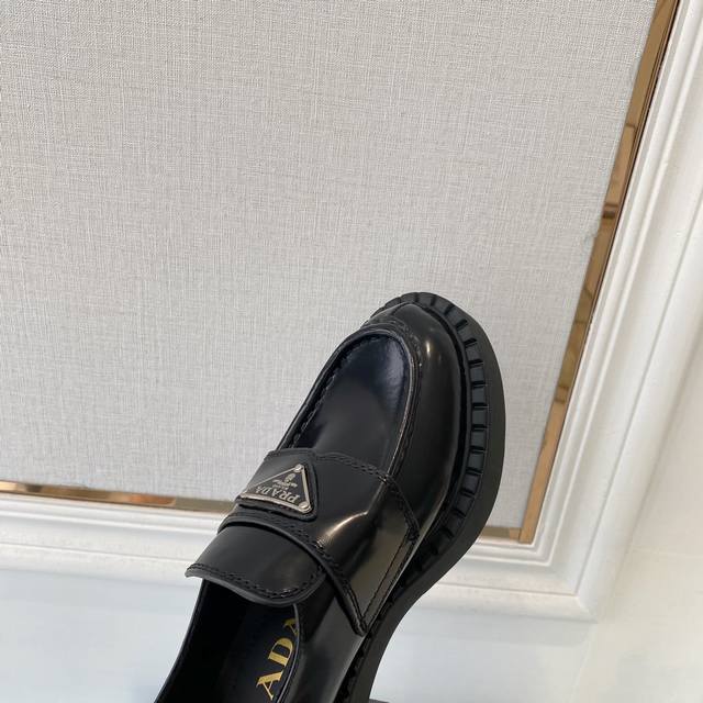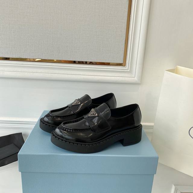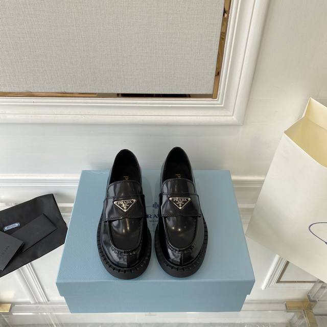 New women's and men's style black split-hem platform casual leather shoes. Adorned by Liu Wen and many other online celebrities, these Prad platform shoes are incredibly popular this year. They offer both height and a casual look, showcasing meticulous attention to detail. Features include: imported split-hem platform leather lining, platform sole with logo, and non-slip sole. These shoes are very comfortable and feel great on the feet. Heel height is 6cm. Sizes: 34-40. Comes with original packaging.