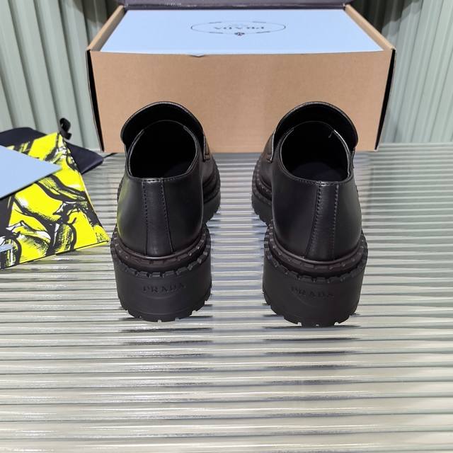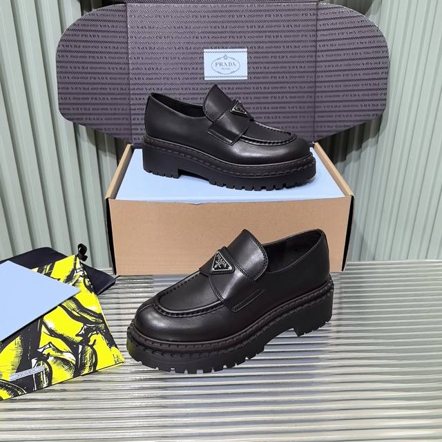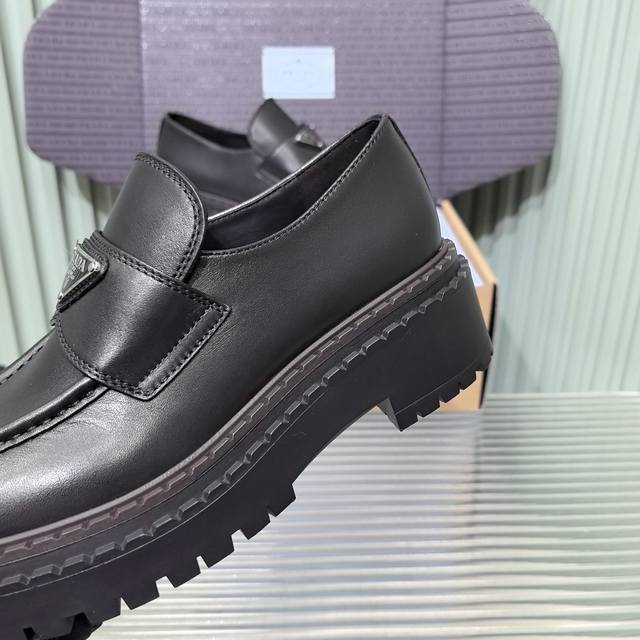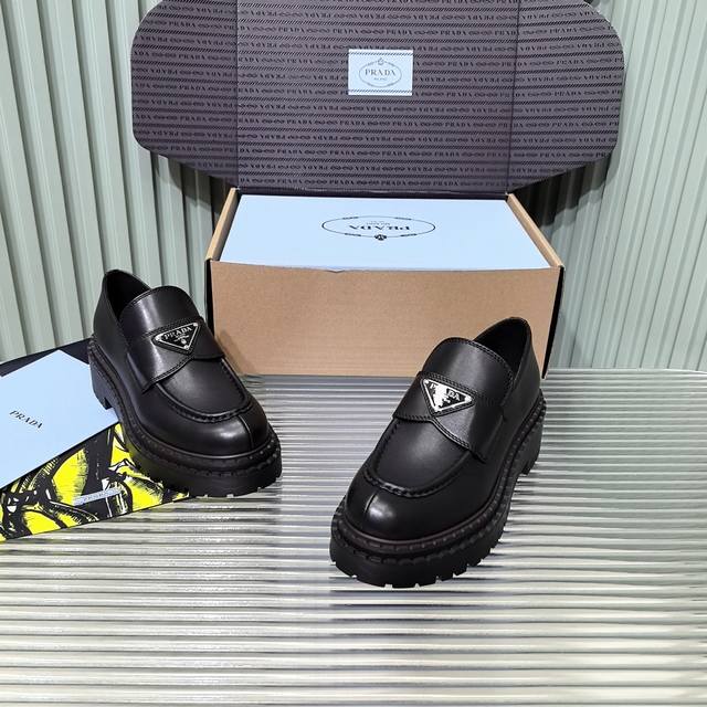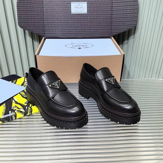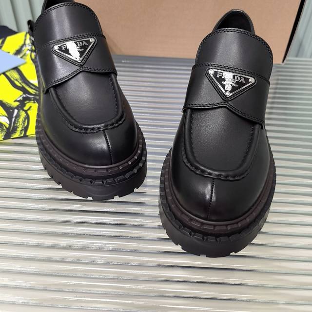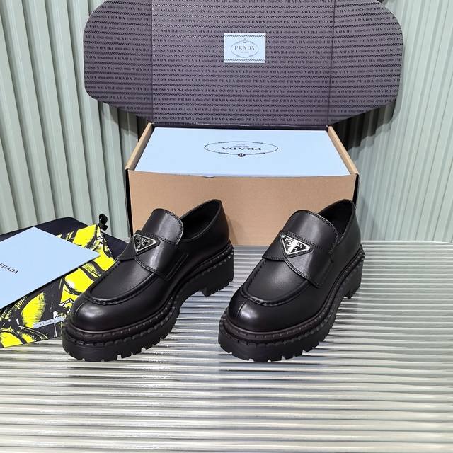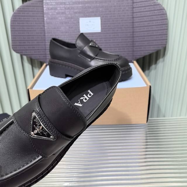 * _Prada British retro triangle logo loafers, large factory quality, rubbed color thick sole