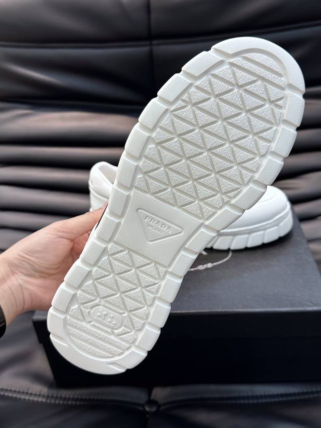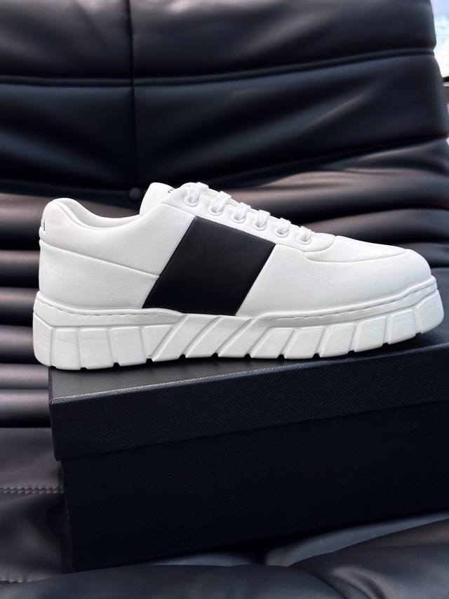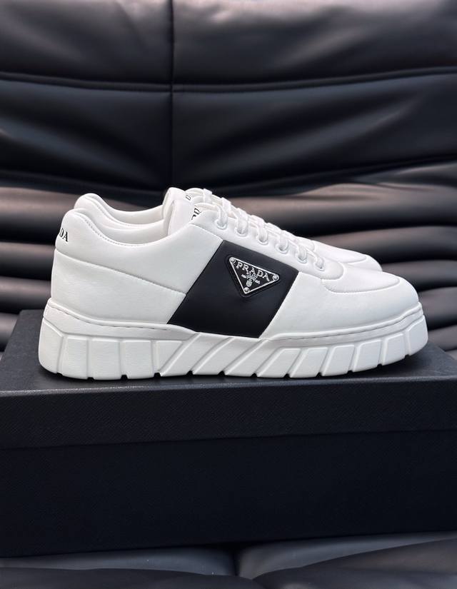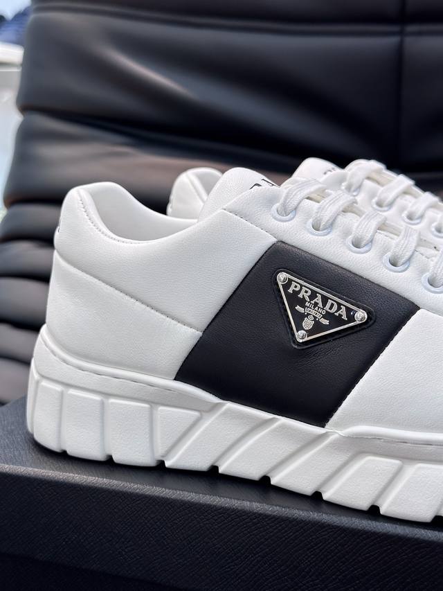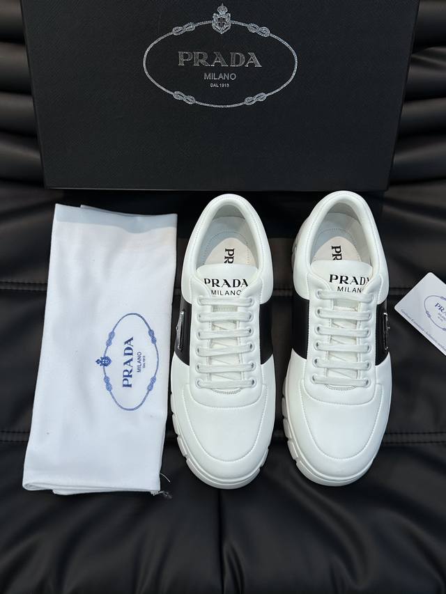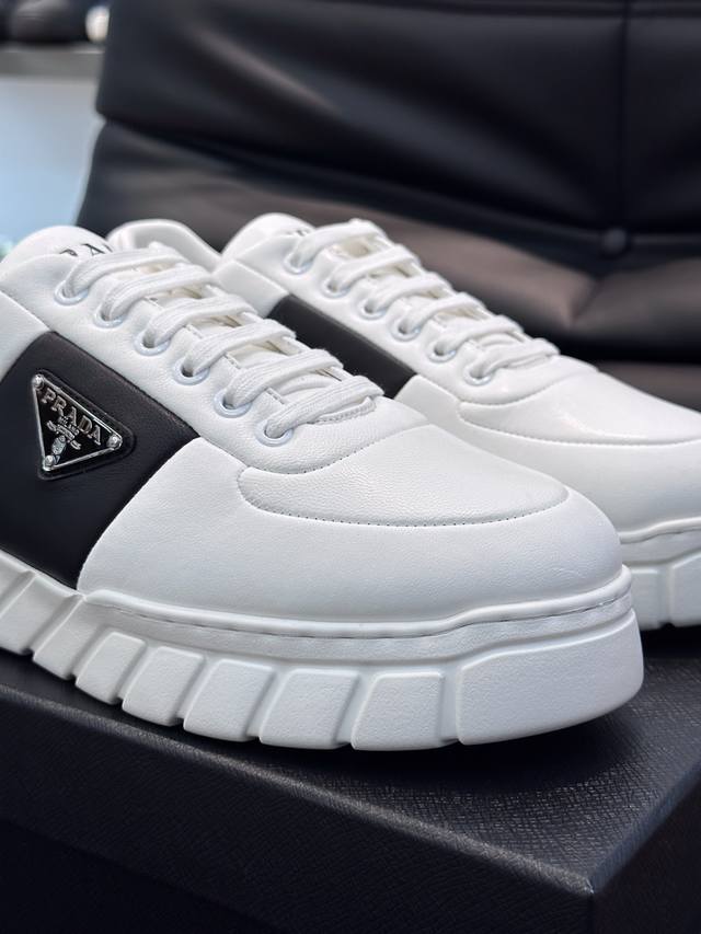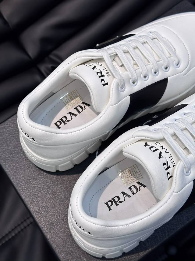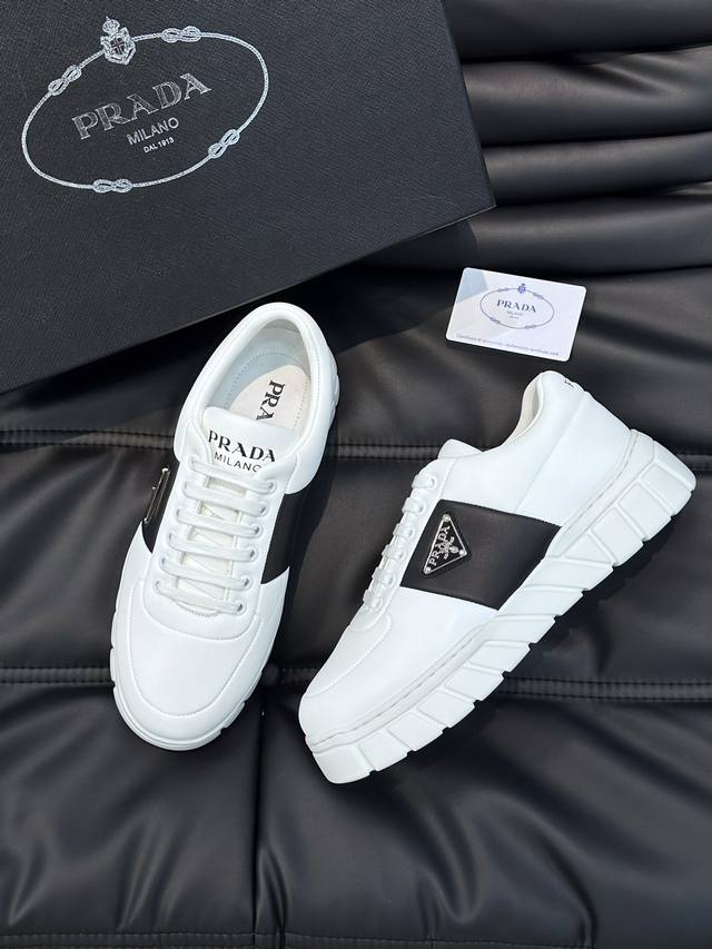 Prad* Prad* High-end men's platform casual sneakers, perfectly replicating the original details, crafted from imported matte cowhide, exuding quality, full calfskin lining and insole for breathability and comfort, classic black and white enamel metal logo decoration embodies the brand's style, genuine leather tongue, Prad logo badge on the tongue and heel further enhances the brand's style, lightweight textured rubber outsole provides a light and comfortable feel with an added height of approximately 4cm, excellent comfort and breathability, comes with original packaging. Size: 38-44.