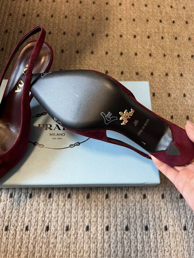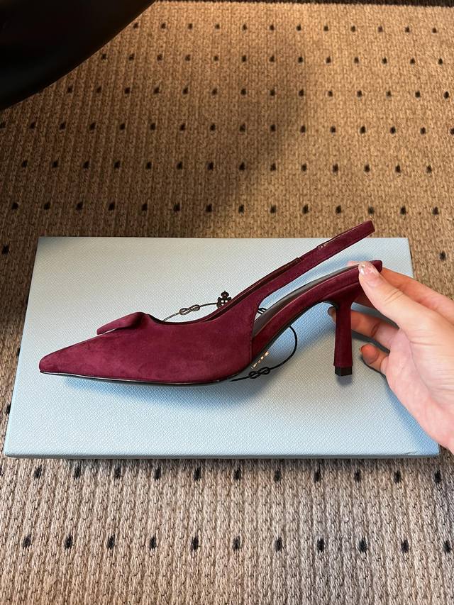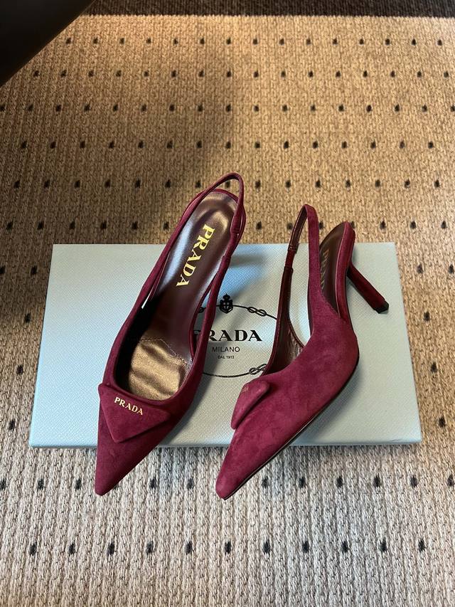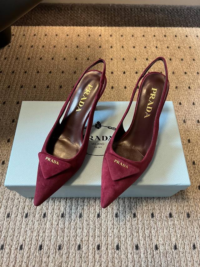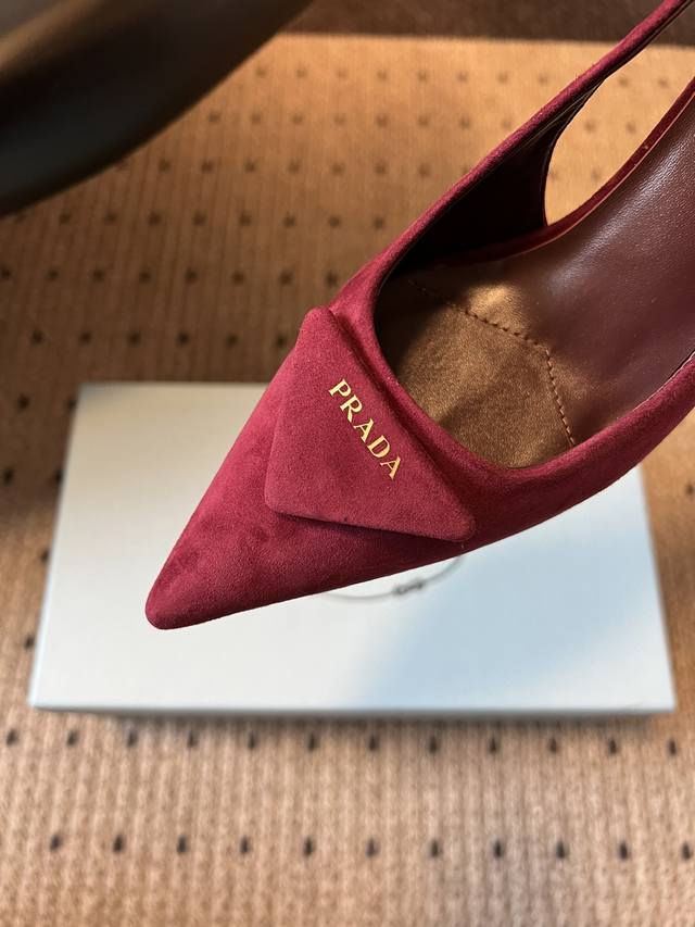 Prad*25Ss Retro Triangle Logo Pointed Toe Kitten Heel. The Prad triangle logo is embedded at the toe, a highly recognizable symbol of the brand, reinforcing visual memorability. The pointed toe silhouette flatters the foot shape while adding an elegant and sophisticated touch, consistent with Prad's refined style. The thin strap at the heel combines decoration and practicality, securing the ankle, improving stability, and reducing the heaviness of high heels. The moderate heel height ensures comfort while maintaining a powerful presence, suitable for the workplace or daily commutes. The shoe features a genuine leather lining that is skin-friendly and breathable, reducing stuffiness and friction discomfort during prolonged wear. Upper: Sheepskin; Lining: Sheepskin; Outsole: Genuine Leather; Size: 35-41; Sizes 40 and 41 are custom-made and non-refundable; Heel Increase: 6cm.