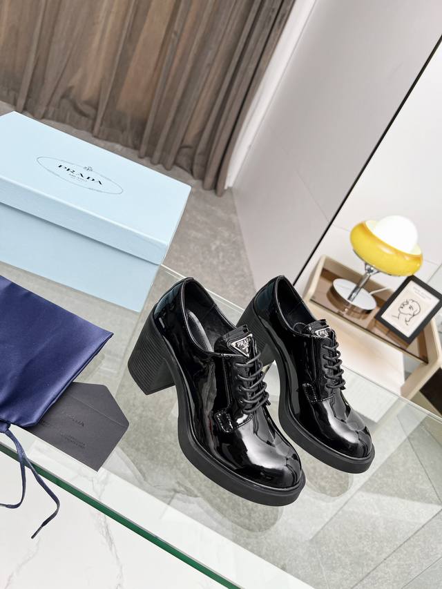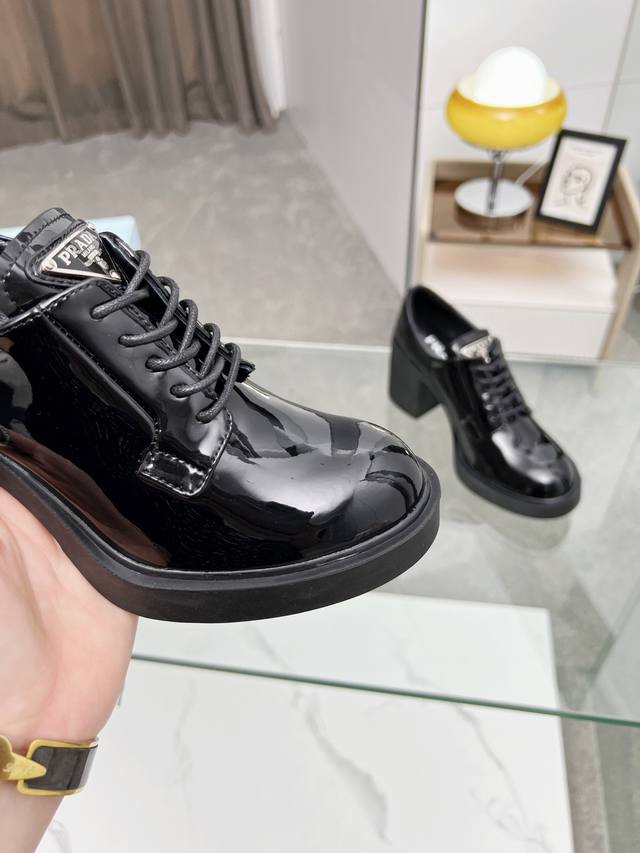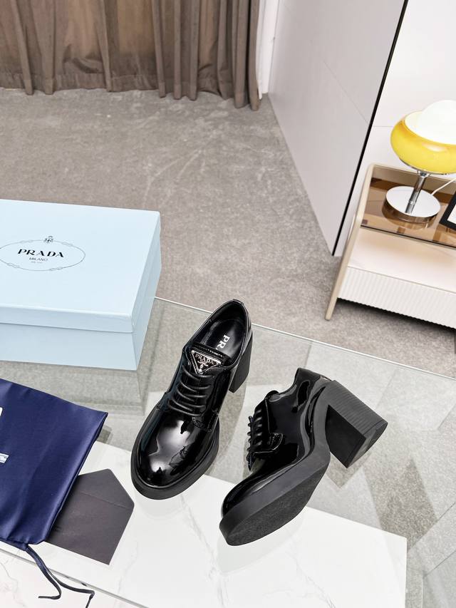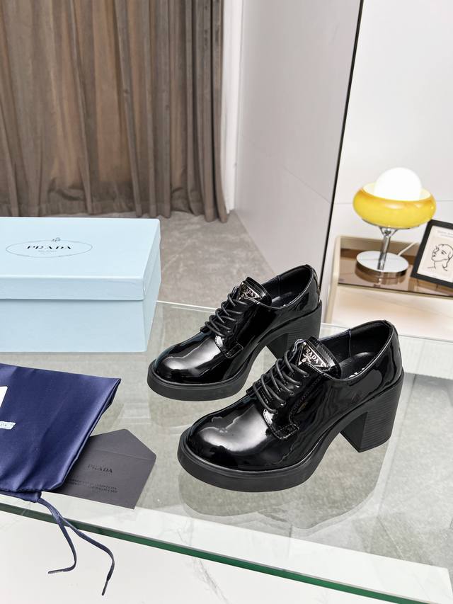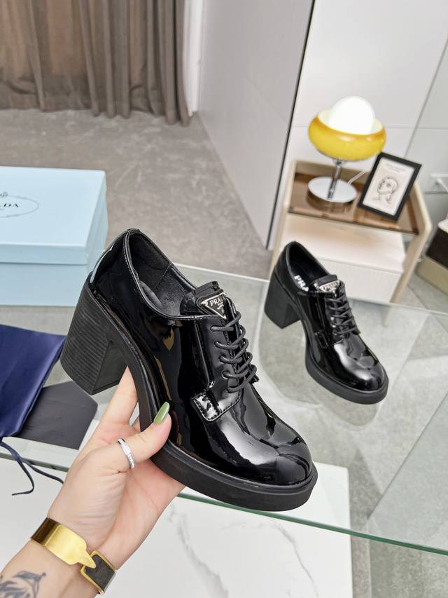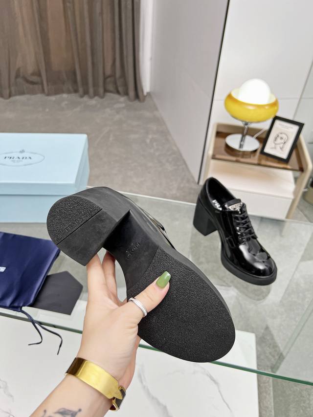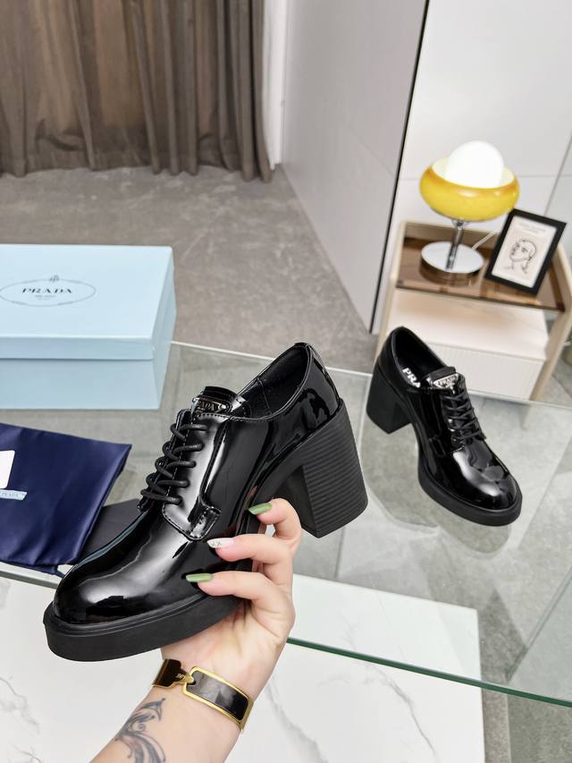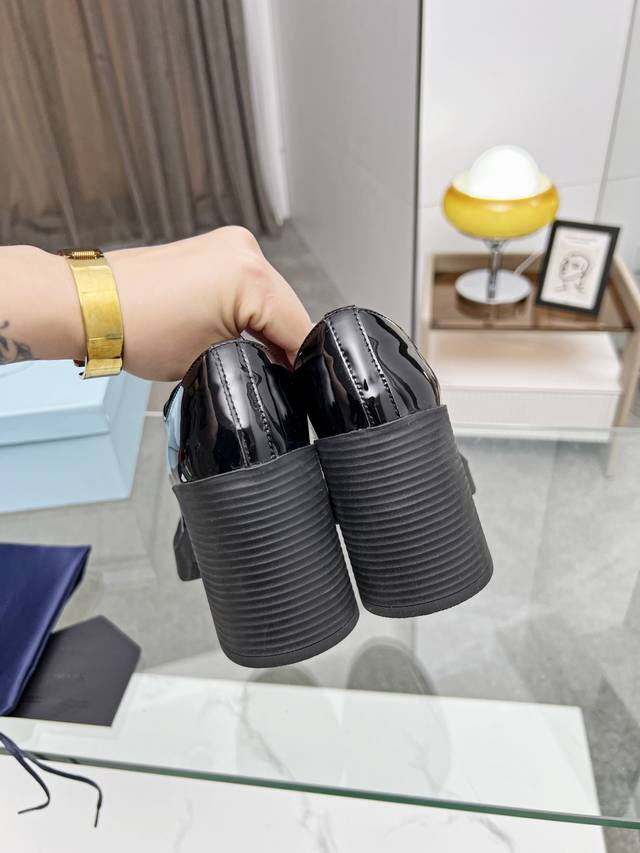 Prada 223 Spring/Summer New Arrival: Mary Jane Shoes! A super hot item from the Glow pop-up store! A must-have from the S-series, these round-toe, triangle-buckle Mary Jane shoes are the same style worn by internet celebrities like Qiao Xin, Cheng Xiao, and Liu Lingzi! Stylish and versatile, a great item! Exclusive new arrival! For ladies who love wearing heels but are afraid of getting tired, check this out! The square block heel will make your steps light and comfortable, 100% fatigue-free, and incredibly stable! The triangle logo has the same texture as the original. Available in patent leather and split-edge beaded cowhide. Heel height 8cm. Size: 35-40. 41 Made to order.