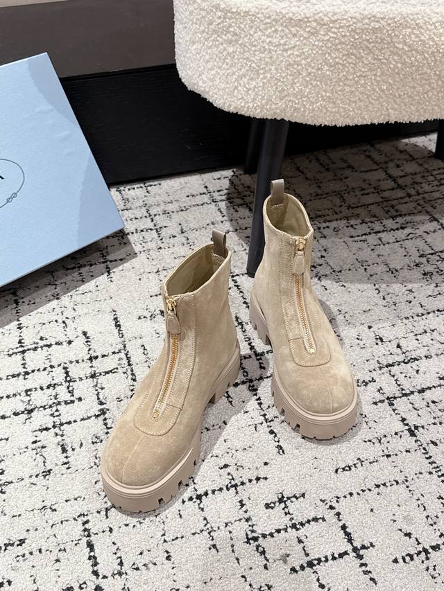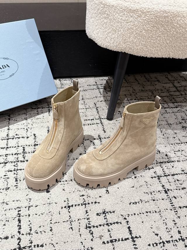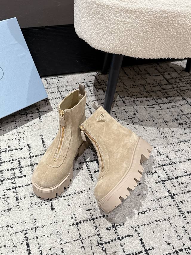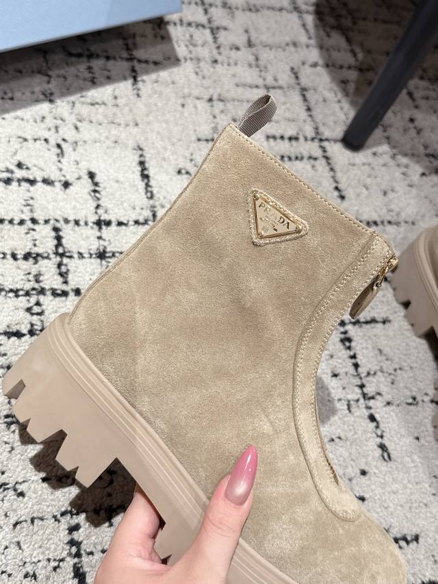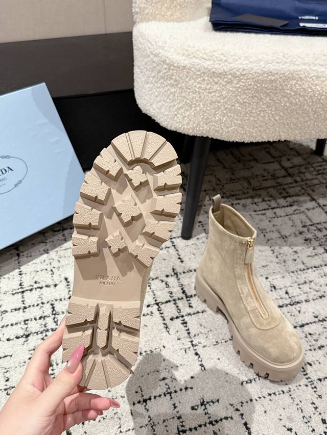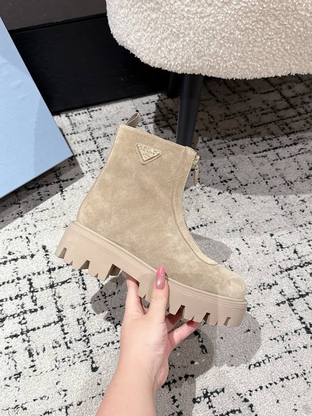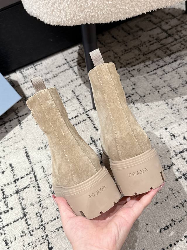 Prada 25 Classic Triangle Logo Slip-on Women's Ankle Boots - A must-have for winter, this is definitely a hot item this year!! Super stylish! Prada boots are truly amazing! They look sophisticated and make your legs appear slimmer, perfectly capturing a chic and elegant look. Material: Imported high-gloss cowhide leather; Lining: Silk cowhide lining; Outsole: Rubber foam sole, lightweight and comfortable! Size: #35-41; Size 41 is custom-made and non-refundable.