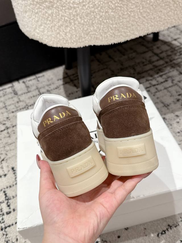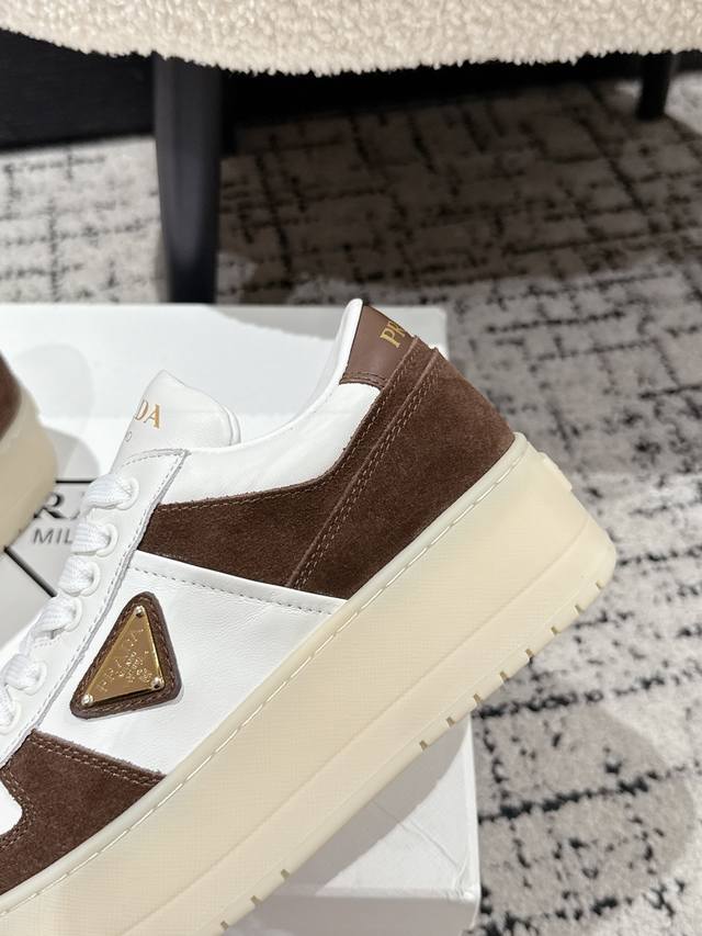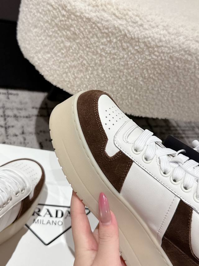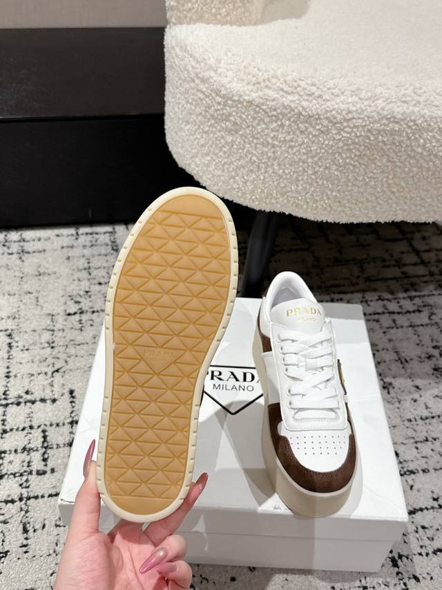 Sporty design with exquisite details. Crafted from perforated leather, the distinctive platform sole presents a unique modern style. The Prada logo is interpreted from different angles, adorned with the iconic enamel triangular metal logo, showcasing a unique classic style