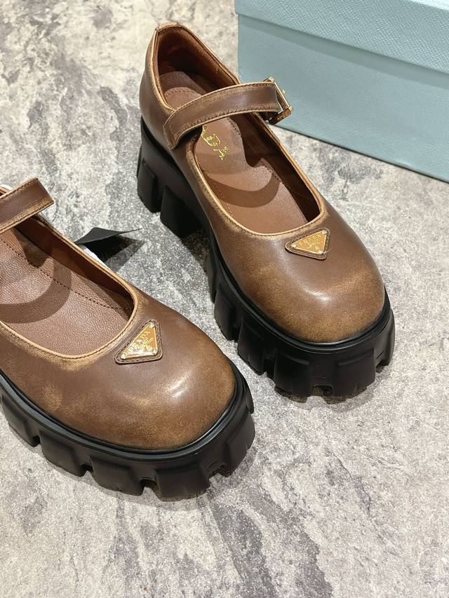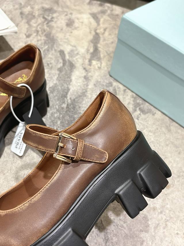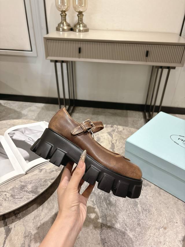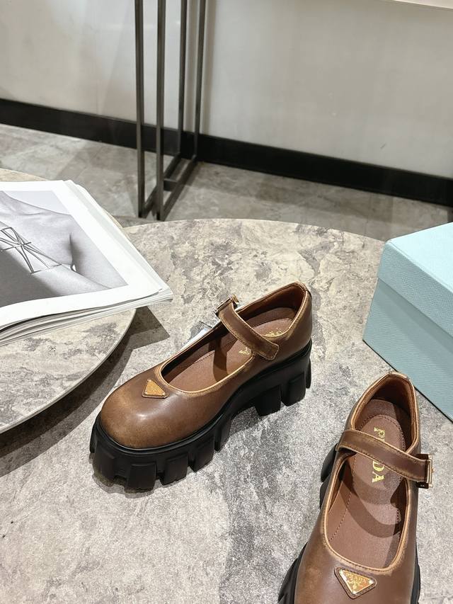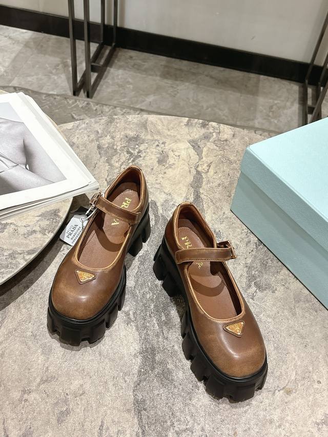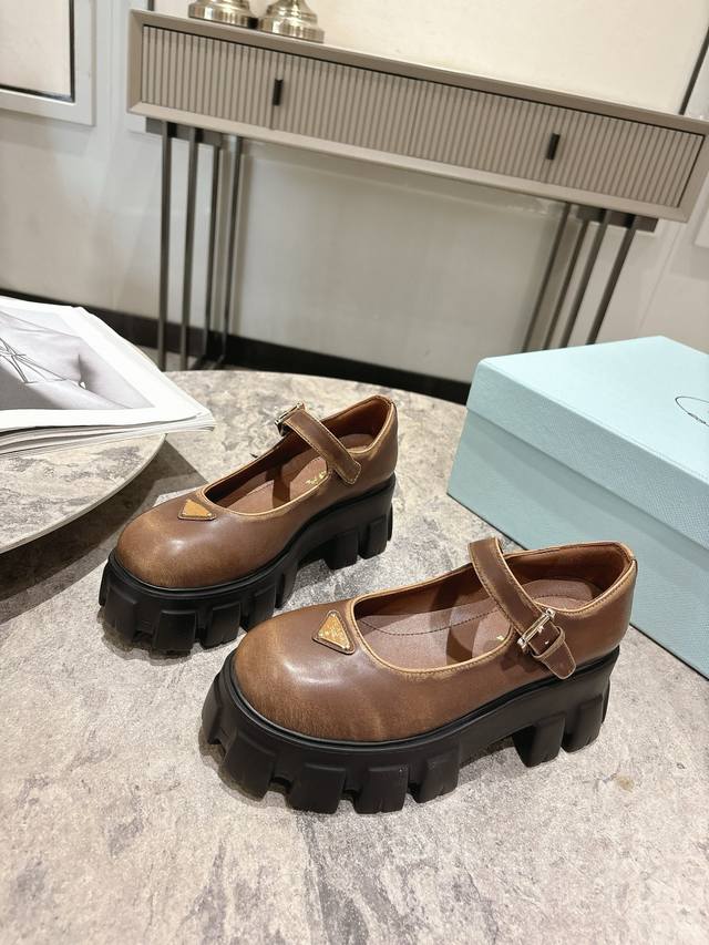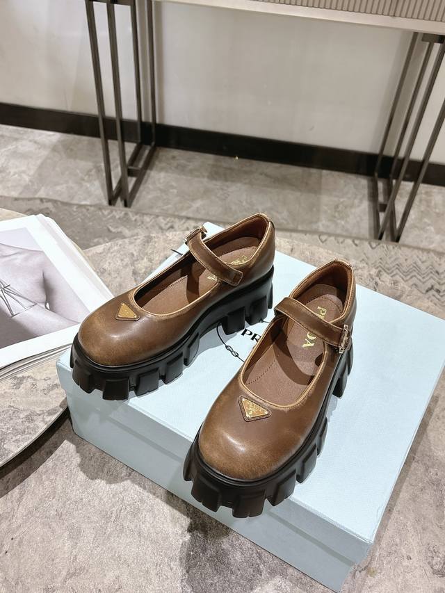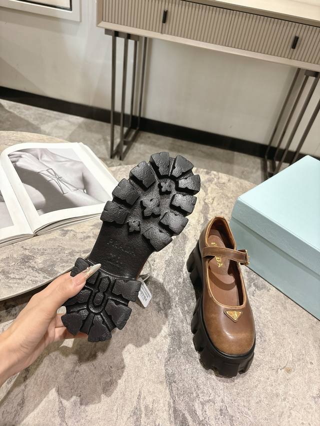 prada 25Fw Latest Monolith Mary Jane Shoes Triangle Buckle Platform Loafers DDD The iconic Monolith shoe's geometric design and bold silhouette give this Mary Jane a fresh new style. This mixed-style shoe combines classic lines with bold details, inspired by the inherent duality of Prada's aesthetic. The upper features a strap and a metal buckle with an enamel metal triangle logo DDD The retro-chic and avant-garde chunky sole paired with a leather upper makes the shoe lightweight and comfortable. Vibrant colors cater to a variety of styles for fashionable individuals! The iconic logo print combined with a vintage beach sandal silhouette