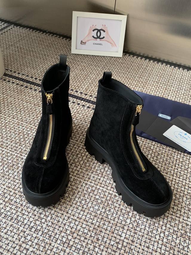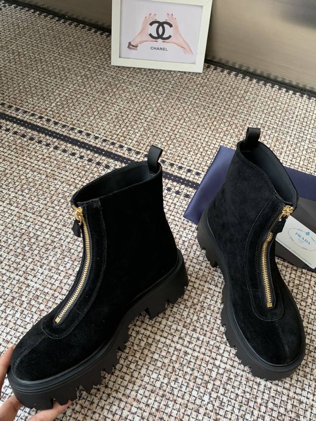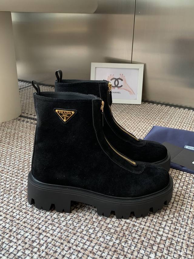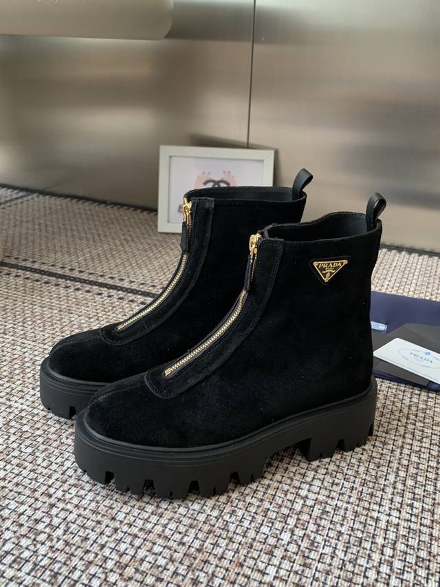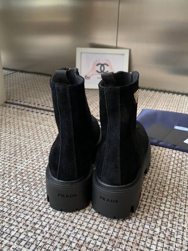 Prada 25Ss classic triangle logo slip-on boots for women. A must-have this winter, this is definitely the year's hottest item! They're so pretty! Prada boots are truly amazing! They're so stylish and slim, and they're the perfect balance of style and style. Upper: Cowhide. Lining: Cowhide. Outsole: Original mold. Sizes: 35-41. 40.41 made to order, no returns or exchanges.
