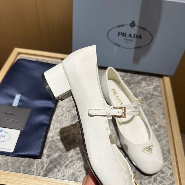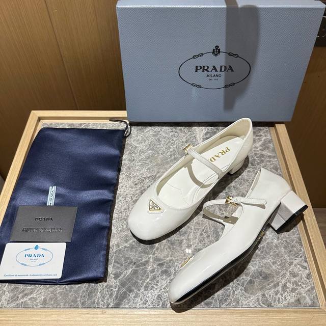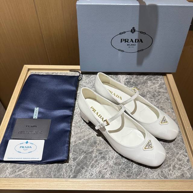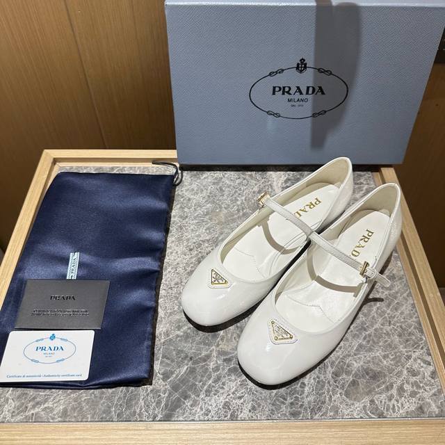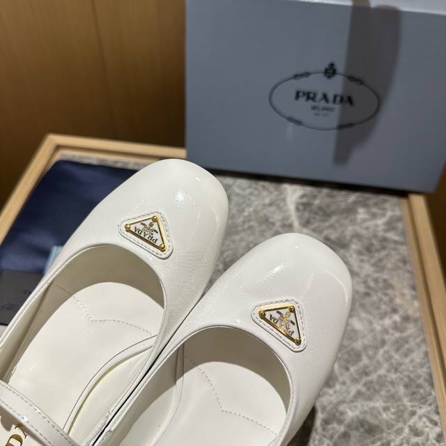 ) Ballet mid-heel shoes feature an elegant tapered silhouette with a lace-up design, adorned with the iconic enamel triangular metal logo. (