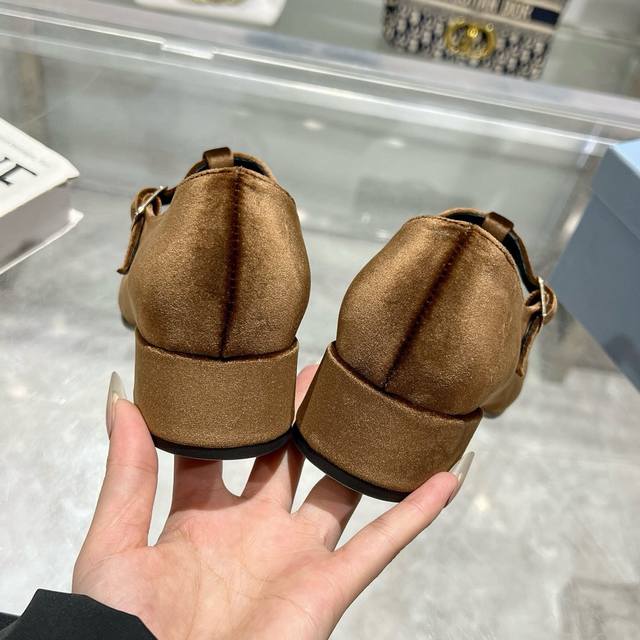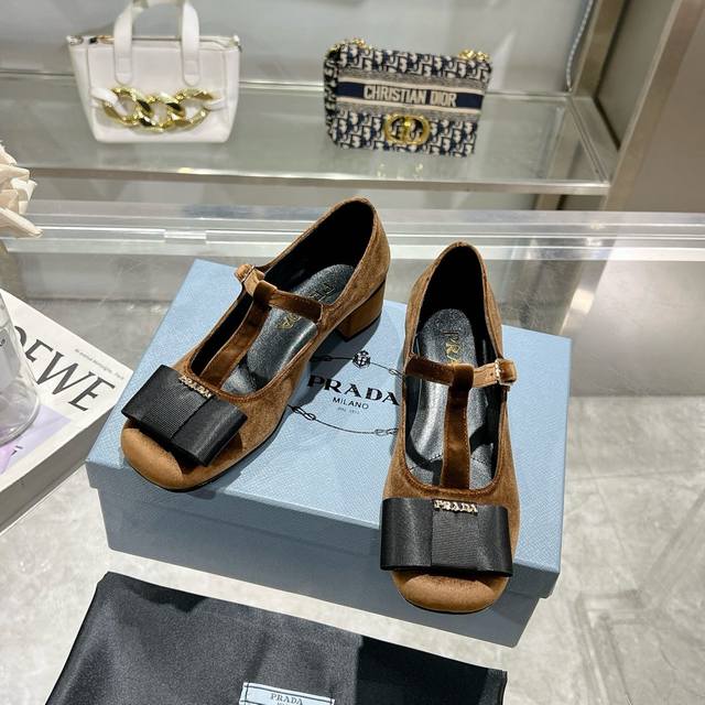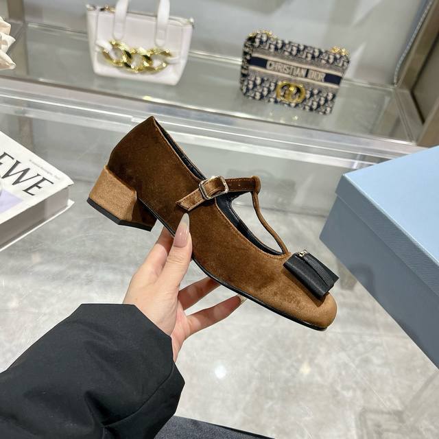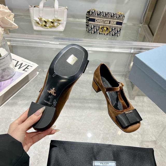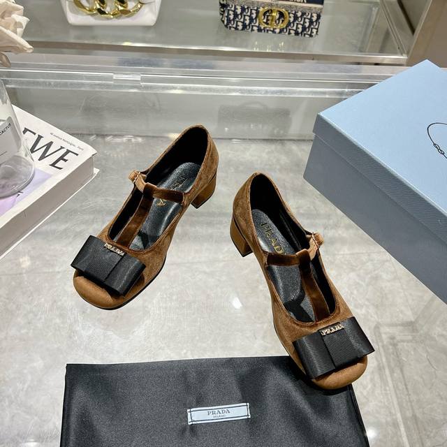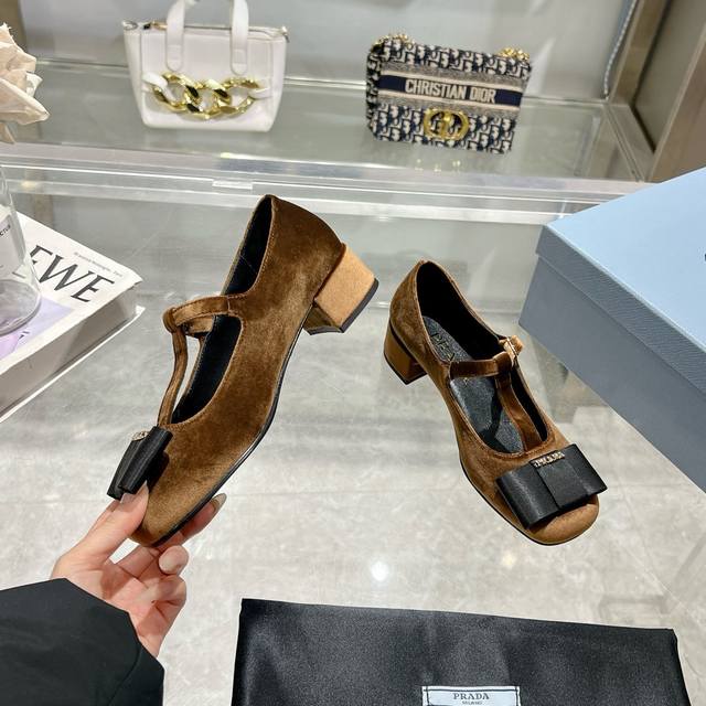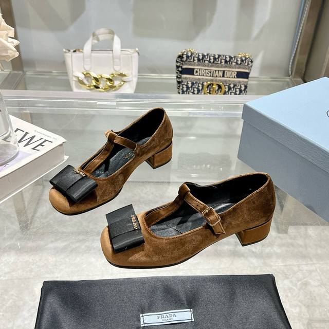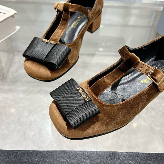 Prada 25Ss Early Spring New Arrival. Recommended by major bloggers on Xiaohongshu, showcasing classic charm. Features a genuine leather outsole and imported mixed sheepskin lining. These velvet high heels blend elegance with modern sophistication, with a delicate bow adding a touch of romance. The upper is adorned with a grosgrain bow and metal buckle. Metal letter logo. Velvet upholstery. Heel height 4.5cm. Sizes: 35-40. 41 is custom-made and non-refundable.