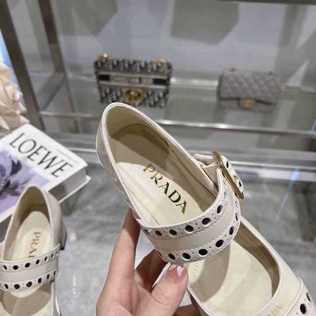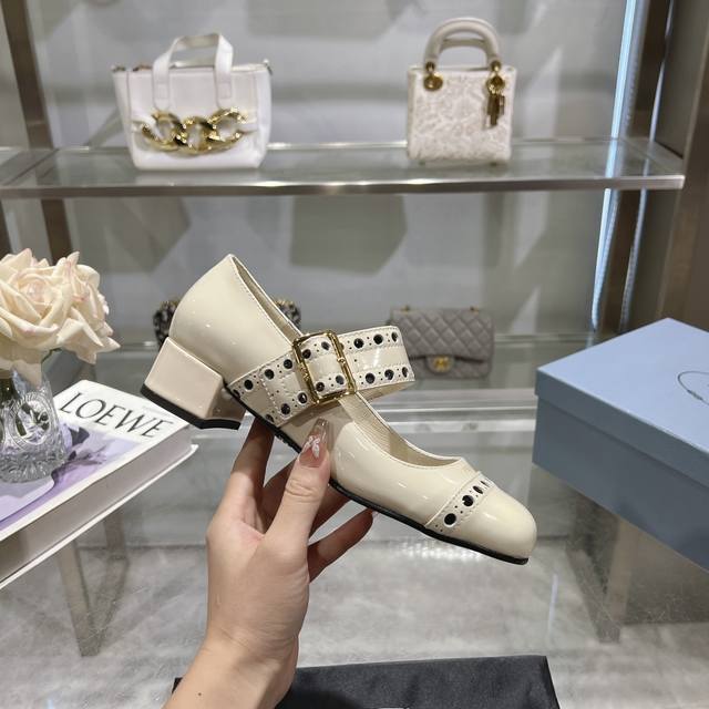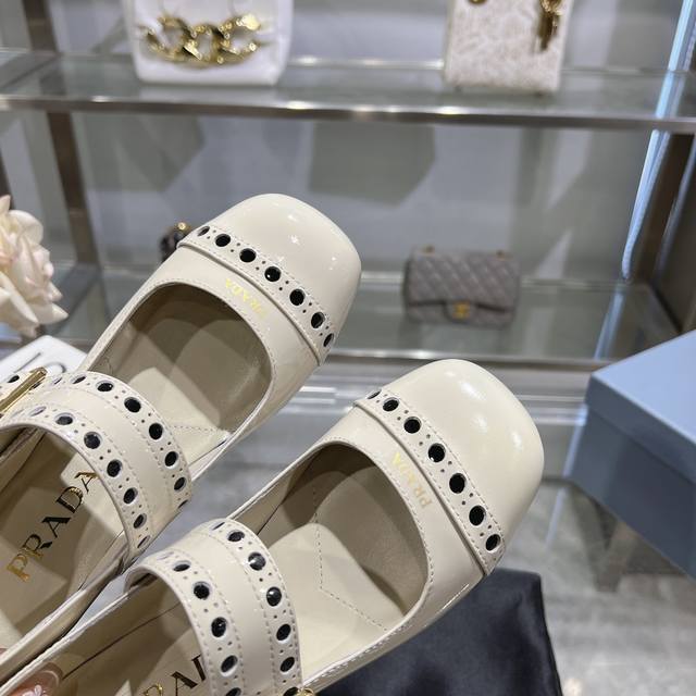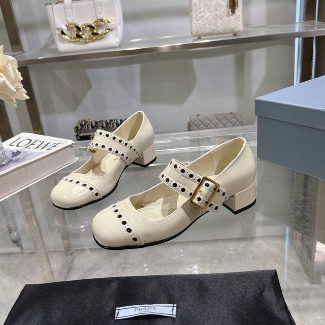 Prada 25th Anniversary New Runway Style Square-Round Toe Perforated Mary Jane Chunky Heel Shoes. Factory Price. These stylish high heels are made of patent leather with perforated details, and the contrasting colors exude a retro vibe. The upper is made of imported cow patent leather, the insole is made of sheepskin, and the outsole is made of Italian injection-molded genuine leather. Heel height: 3.5cm. Sizes: 35-40, 41 can be customized, no returns or exchanges.