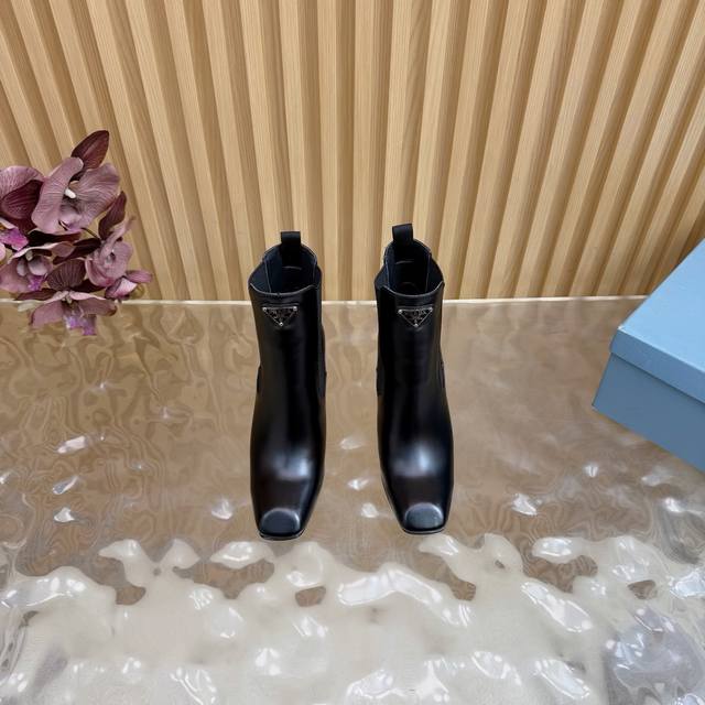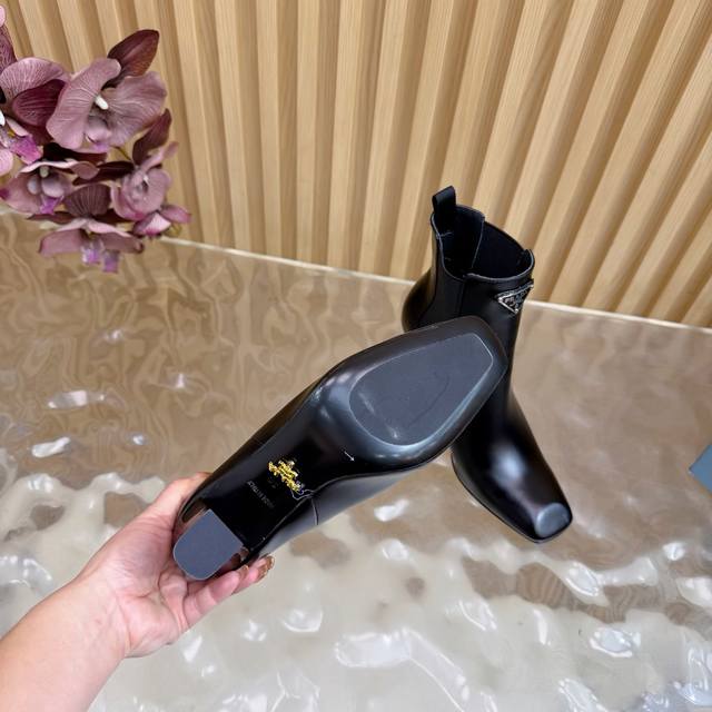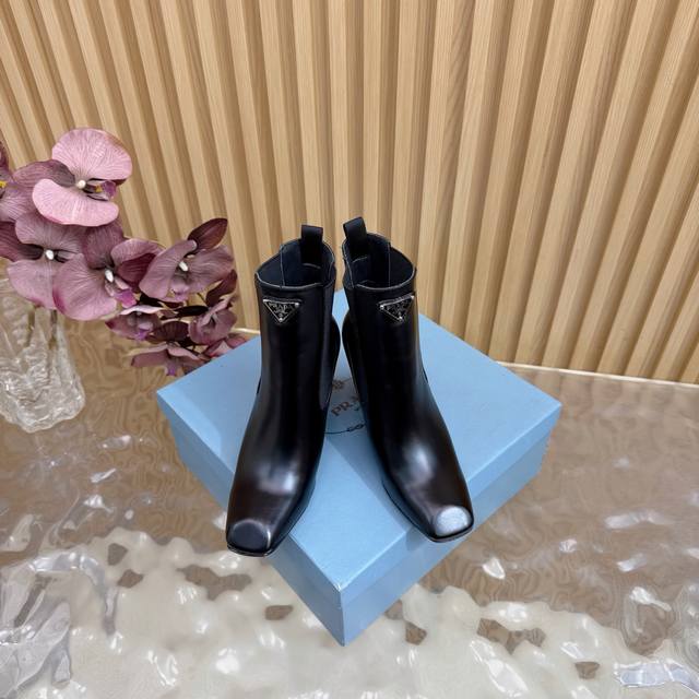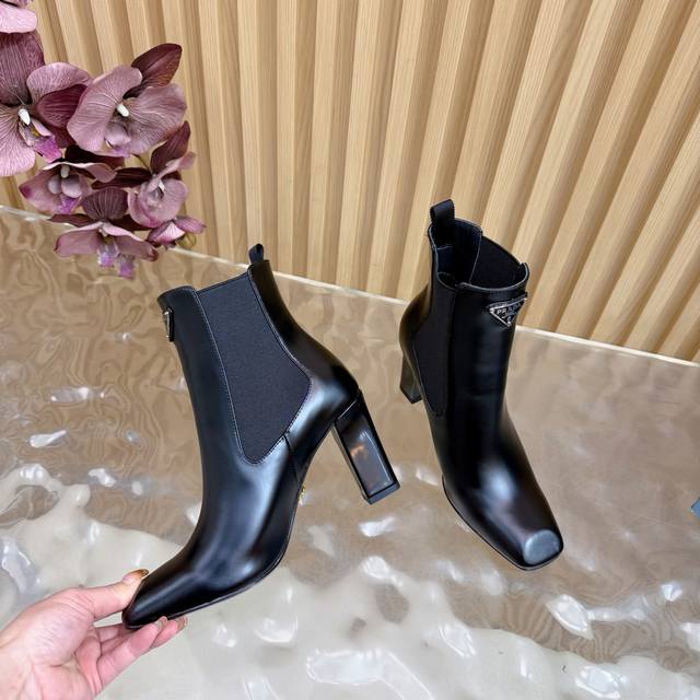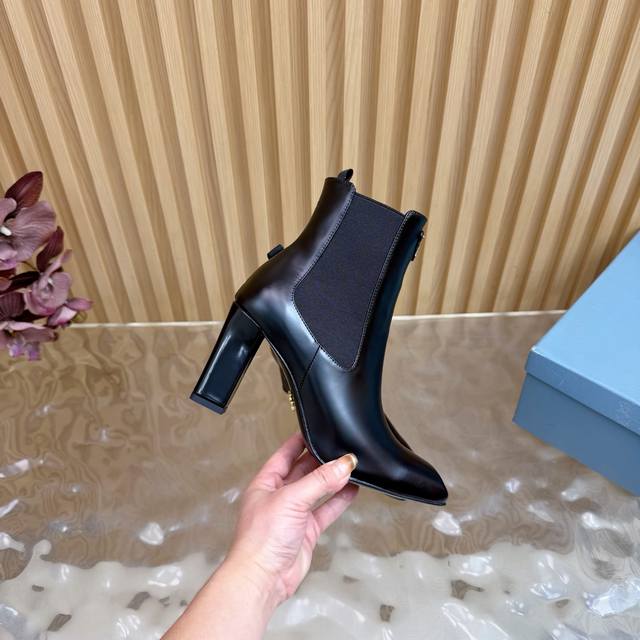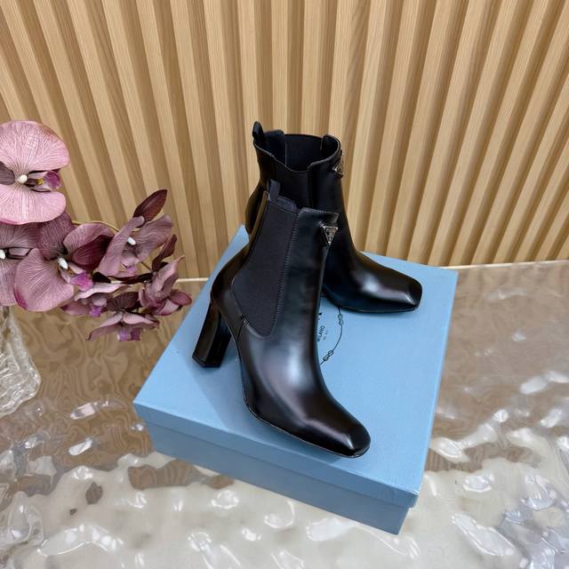 Prada 25Wf Autumn/Winter New Arrival Triangle Logo High-Heeled Ankle Boots DDD A more sleek look when walking, featuring a chunky heel design DDD Stable support for a commanding presence, the height is just right DDD No foot fatigue even after long walks DDD Pair them with jeans for an instant fashionista look DDD For the workplace, pair them with suit pants for a sharp and professional look. DDD Whether you're shopping or attending an important occasion, these boots are perfect for it DDD Made with original cowhide leather with open-edge beads DDD Both the inner lining and insole are made of cowhide DDD Heel height: 8.5cm DDD Italian imported genuine leather outsole DDD Size: 35-40 41 (Made to order, no returns or exchanges) DDD