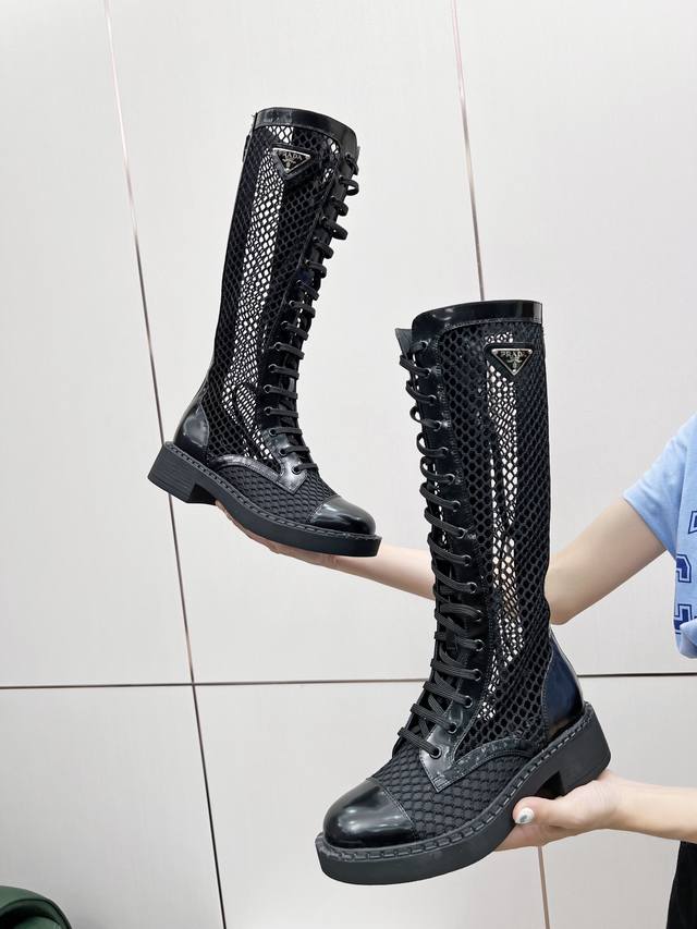 Prada 2630 You can't stop loving military boots! For the warm season, a special solution is needed, and fishnet is a great idea, perfectly matching this season's ocean theme. Original 1:1 replica! Triangle buckle zipper molded! Imported environmentally friendly split-edge cowhide and pearlescent sheepskin double-layer lining! Environmentally friendly rubber foam outsole for lightweight comfort! Heel height 4.5cm, sizes 35-40.