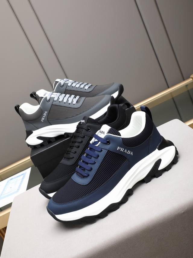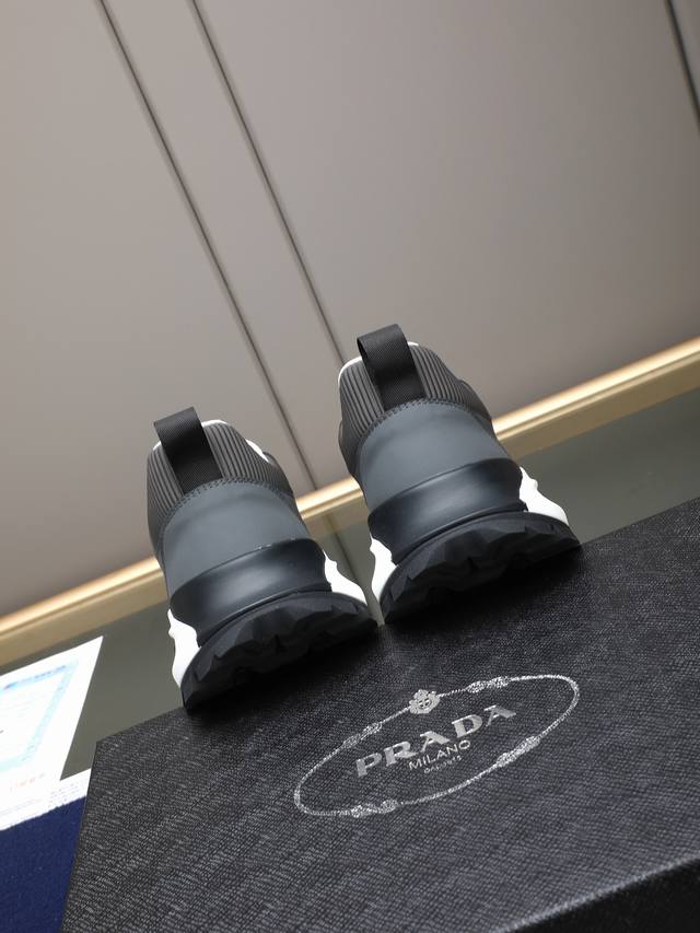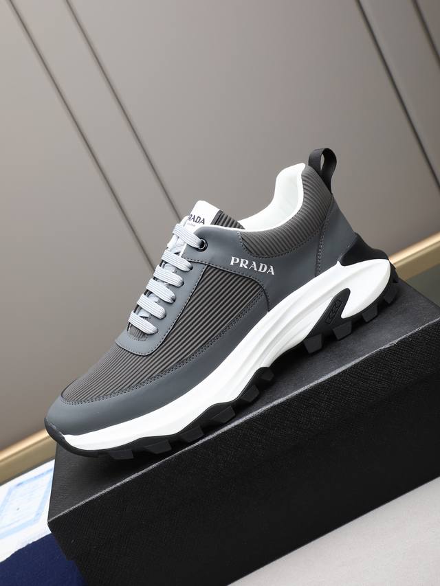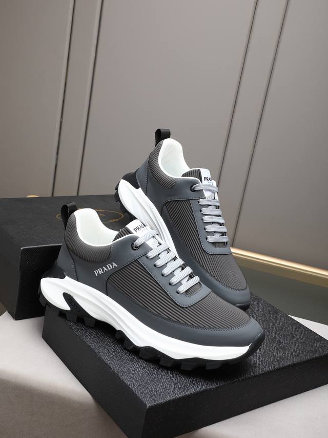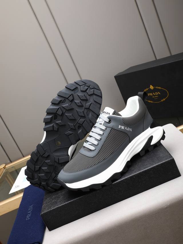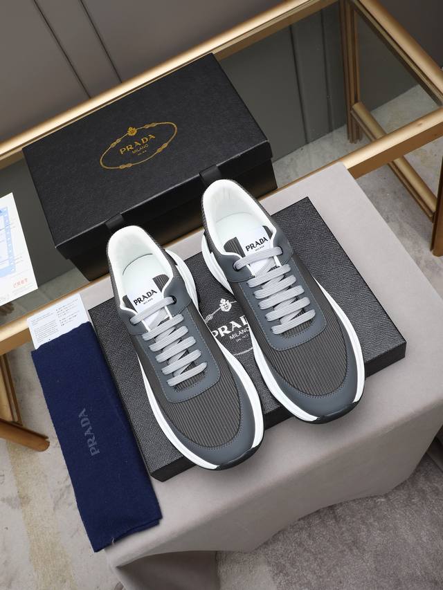 Prada, a top-tier fashion brand, presents a men's shoe that can complement various styles. The upper is constructed from a combination of materials, with an imported mesh lining for sweat absorption and comfort. The lightweight and comfortable foam outsole adds to the overall comfort. Extremely demanding craftsmanship. Available in 4 colors: sizes 38-44, 45 (custom sizes available).