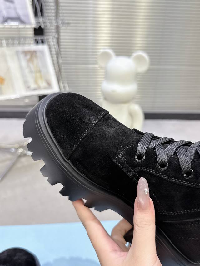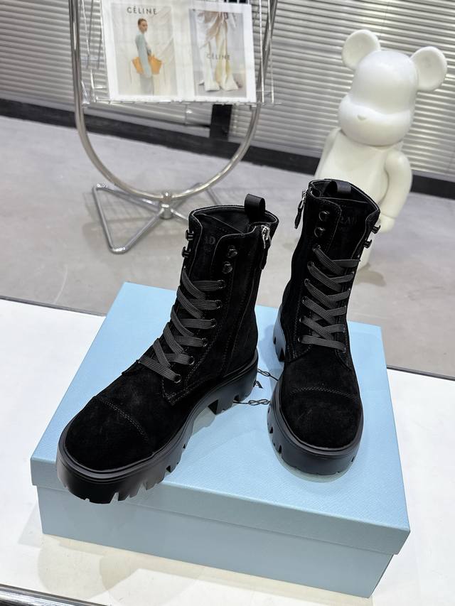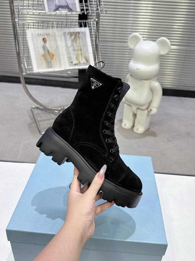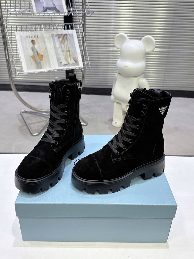 Prada classic triangle logo slip-on combat boots, the ultimate women's ankle boots! A must-have for winter, this is definitely a hot item this year!! Super stylish! Prada boots are truly amazing! They look sophisticated and make your legs look slimmer