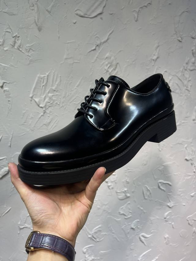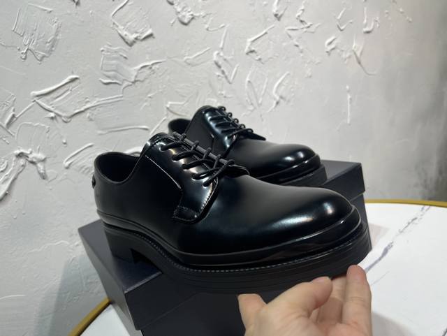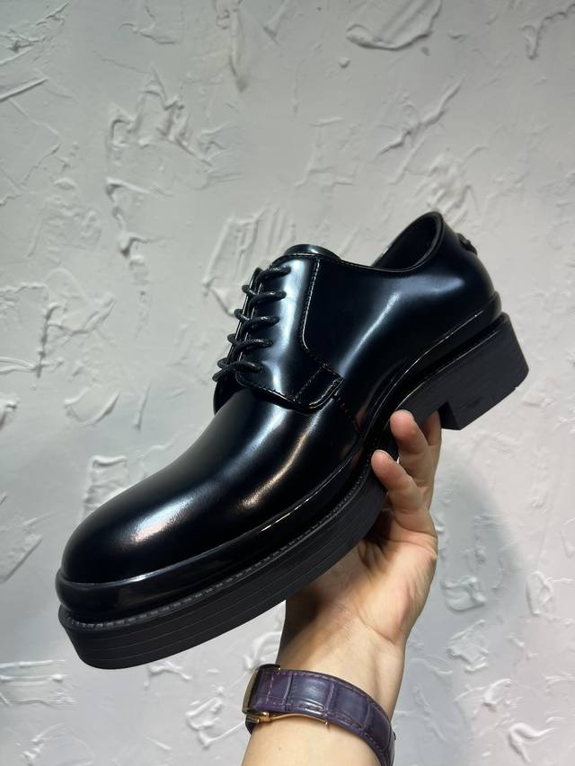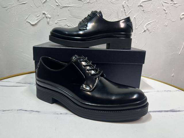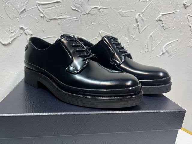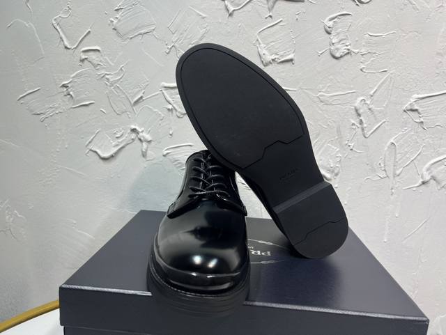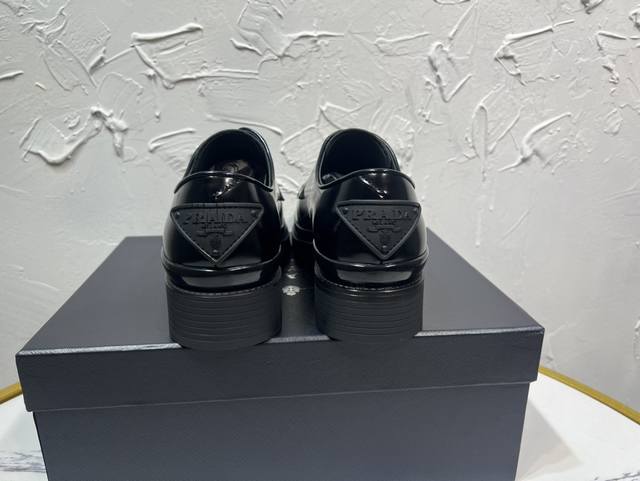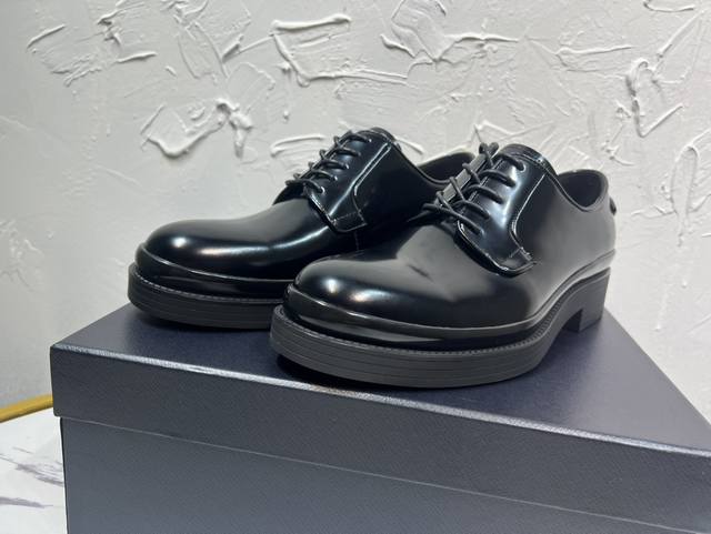 Prada Derby 2025 Spring New Arrival, Prada Distressed Retro Loafers, British Style Thin Strap Business Shoes, Top Version Thick Sole Triangle Logo Derby Shoes, Ken's Style, Rubber Outsole, Imported Edge Beads, Cowhide Lining, Cowhide Insole, Black, Red, and Blue Complete Set, Sizes 39-46
