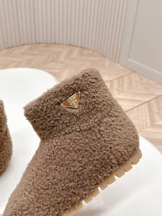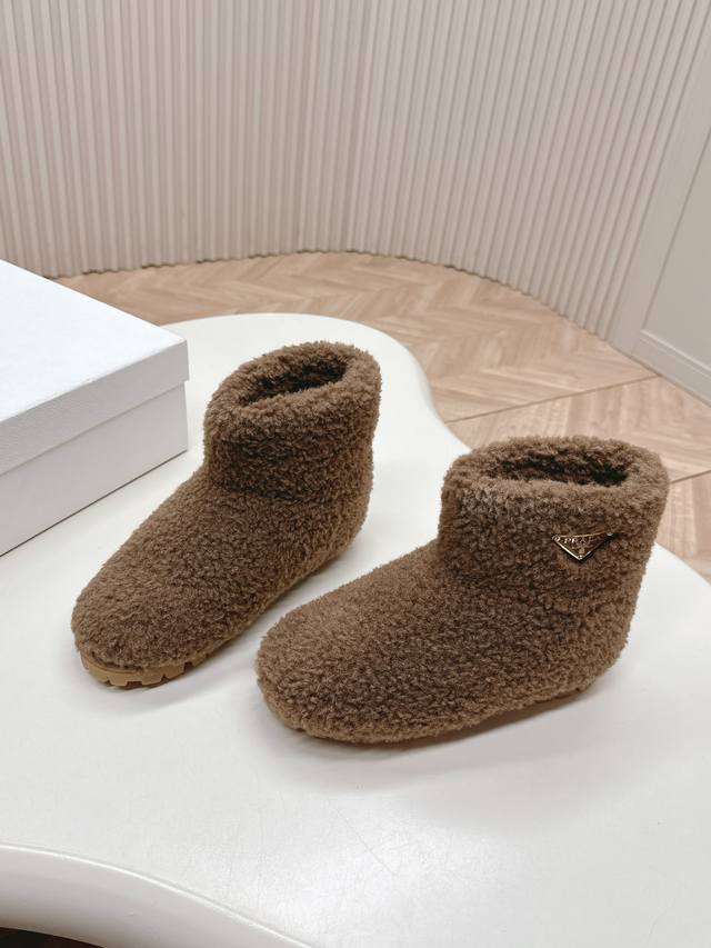 Prada Fall/Winter 2024 Furry Ankle Boots/Snow Boots. Classic triangle buckle, comfortable, cute, stylish, elegant, and versatile. Soft and comfortable wool, bringing warmth to autumn and winter. Comfortable to walk in from morning to night. Easily adaptable to all seasons. Wool, original sole! Sizes 35-40. DDD