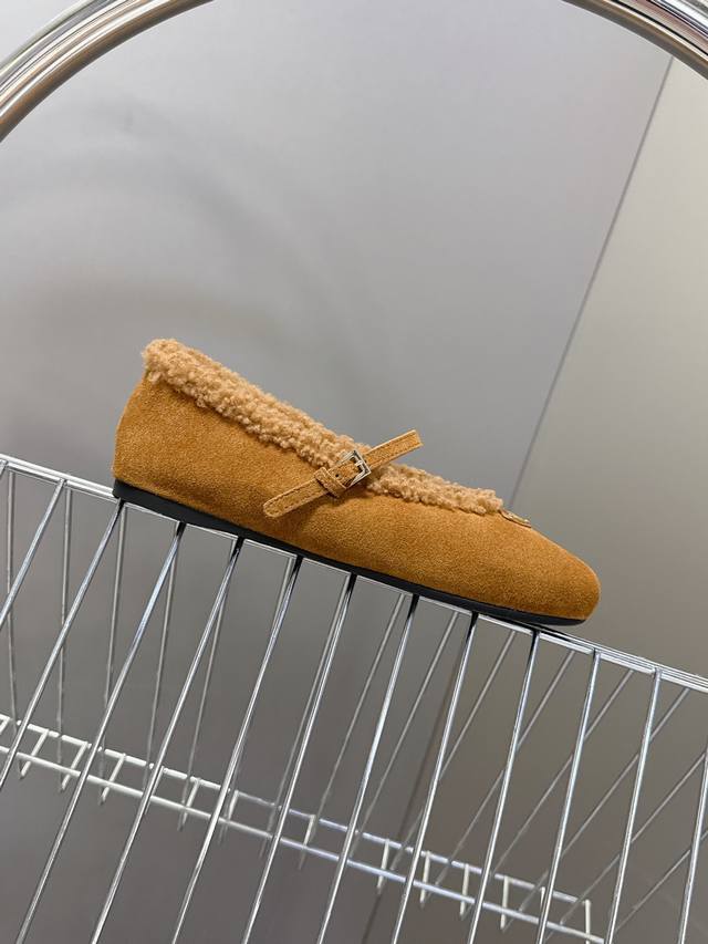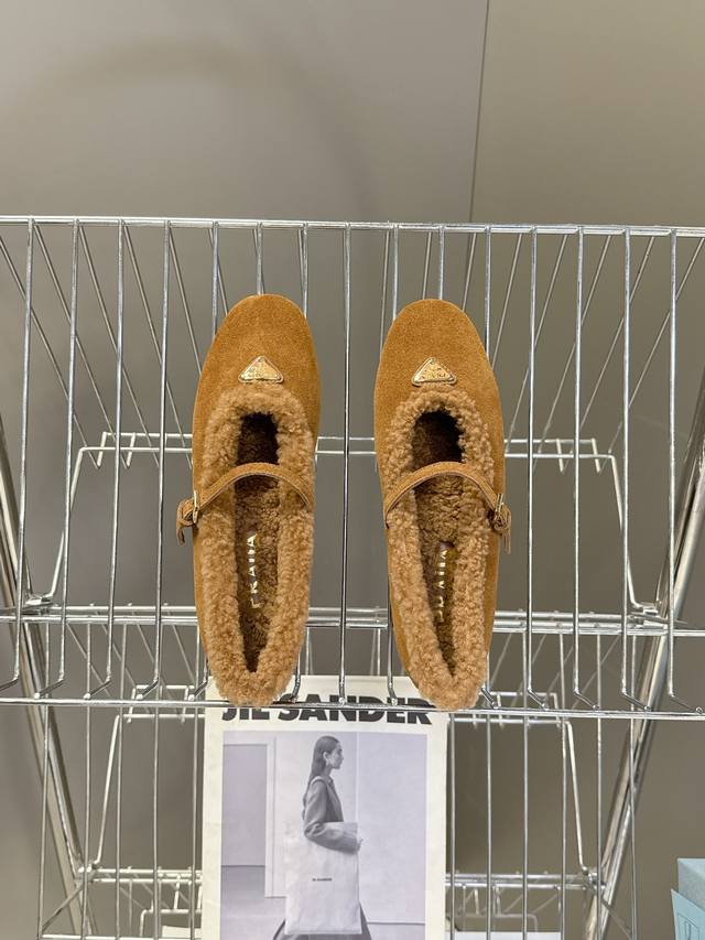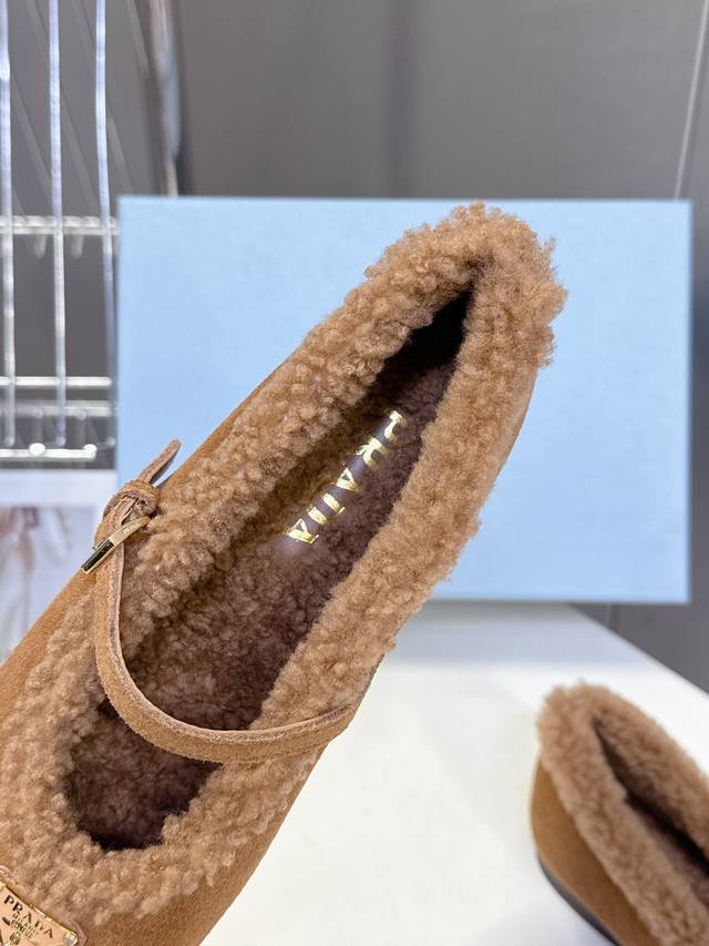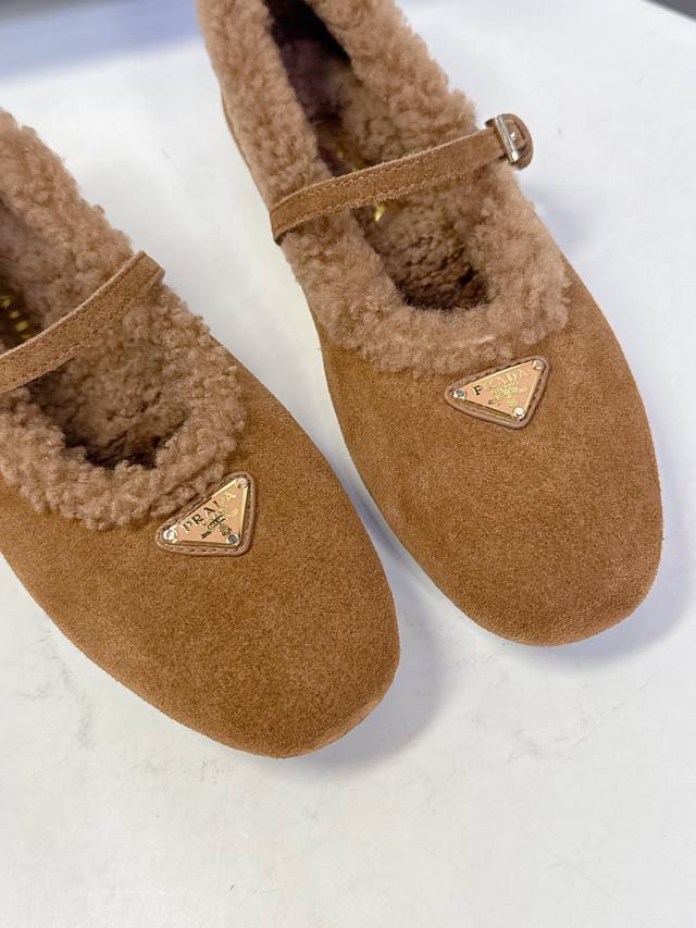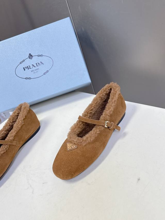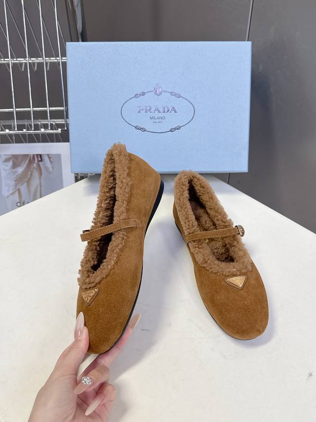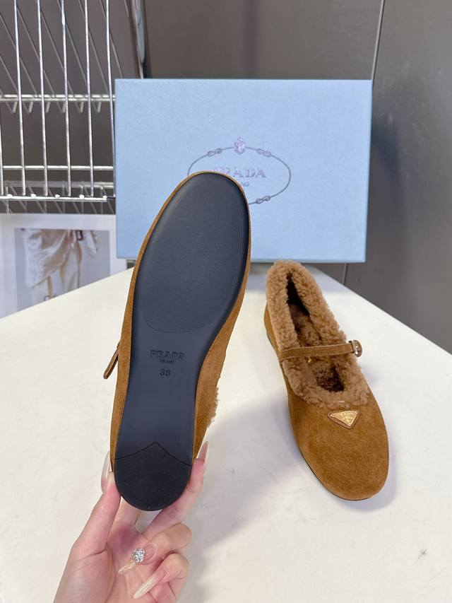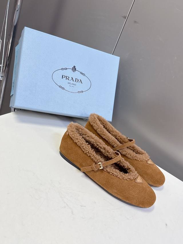 Prada Fall/Winter Furry Ballet Flats DDD Prada blends the graceful spirit of ballet into everyday life. The classic silhouette of ballet shoes is depicted with modern touches! These ultra-soft patent leather sheepskin ballet flats draw inspiration from classic Japanese footwear. Simple yet sophisticated, suitable for various styles. Lively and fashionable with every step. Upper: Genuine wool lining; Outsole: Original mold PV outsole. Size: 35-41; Sizes 40 and 41 are custom-made and non-refundable DDD