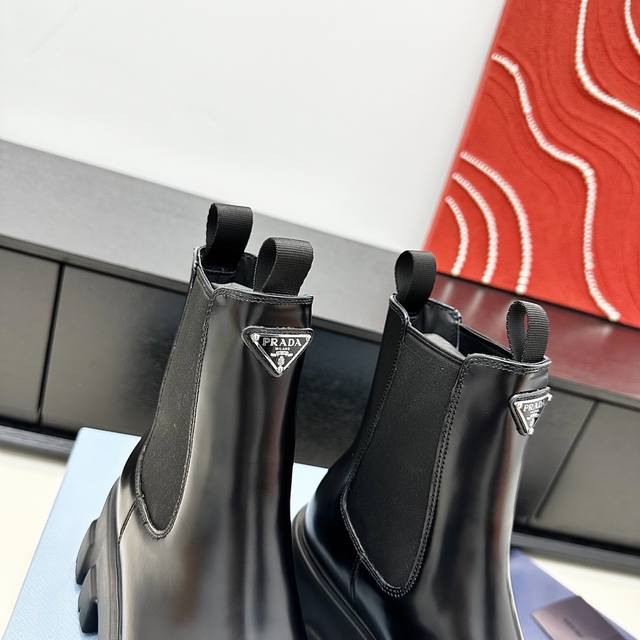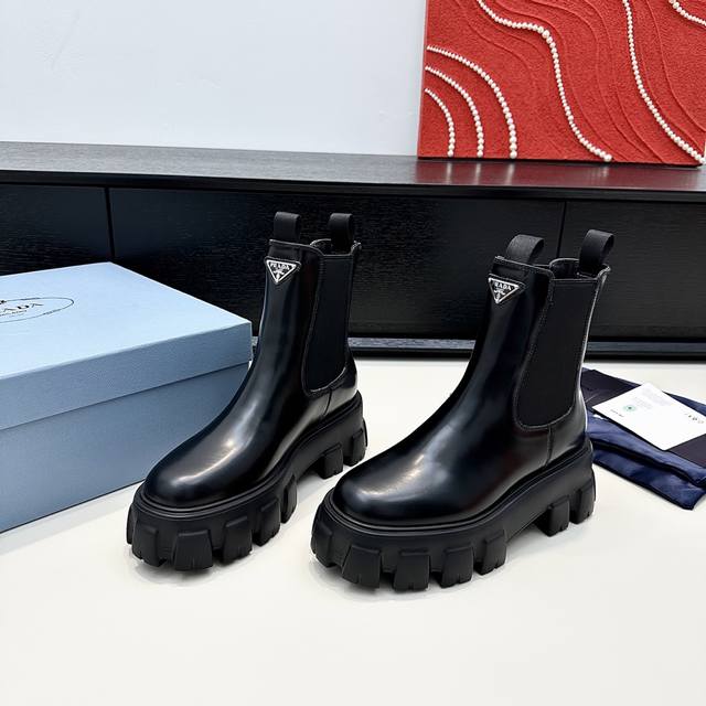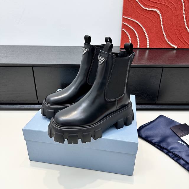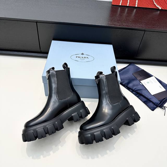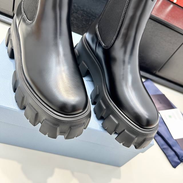 Prada Fwnew Arrival (Reseller's Choice) ~ Prada's classic autumn/winter must-have Chelsea boots, thick-soled short boots with a highly recognizable tire sole and classic triangle logo. Made of premium imported calfskin, super lightweight and provides a perfect height boost. Sizes 35-39, custom sizes 40.41 available.